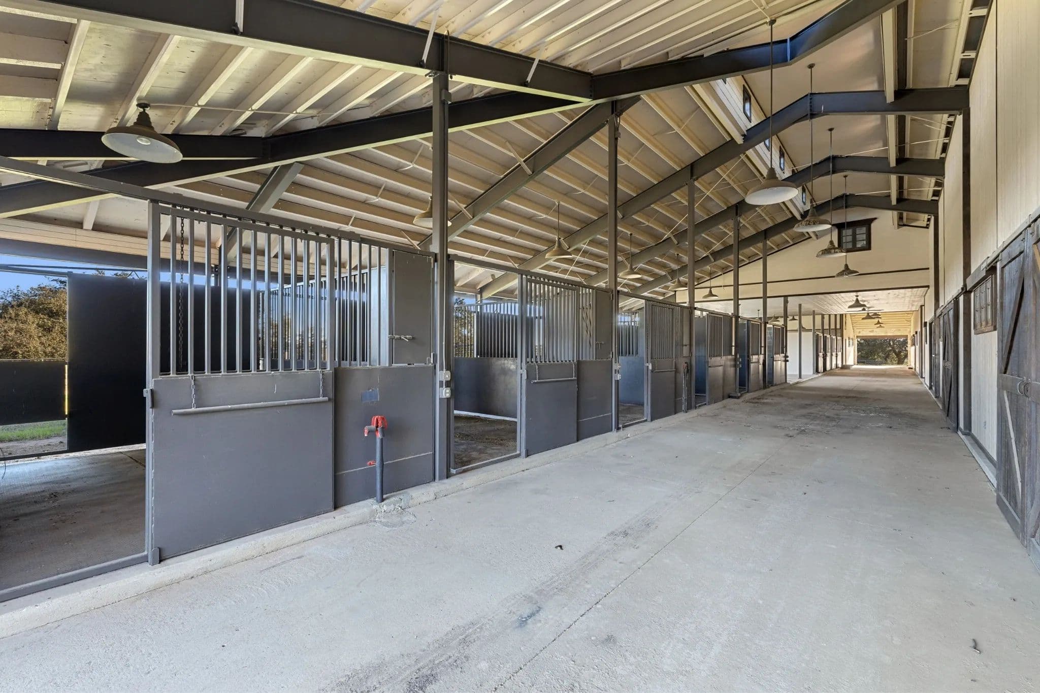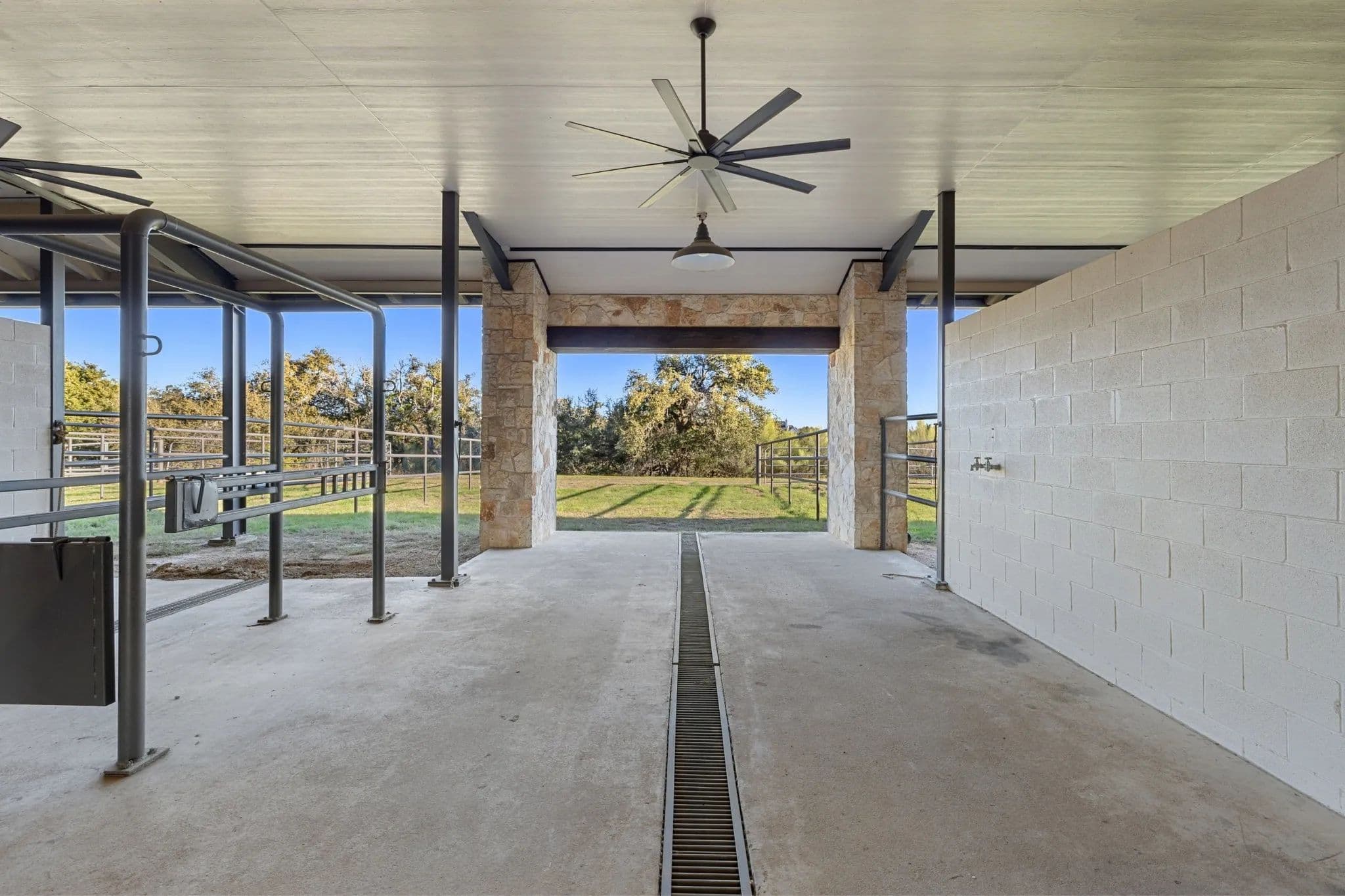 The land itself showcases mature hardwoods and expansive open spaces with multiple prime build sites offering captivating views and a serene Hill Country backdrop. At the heart of the property is a sprawling 13,000+ square-foot barn, thoughtfully designed to meet every need. The barn features 10 horse stalls, each with outdoor runs, a feed room with large grain storage bins, and a spacious tack and saddle room. Additional amenities include a 5-bay maintenance garage equipped with a hydraulic vehicle lift, an air-conditioned machine shop with two garage bays, and a break room complete with a kitchen and full bath. Above the stable area, the Ranch Manager’s apartment provides comfortable living accommodations with two bedrooms and one bath, ensuring convenience and functionality for those managing the estate.
