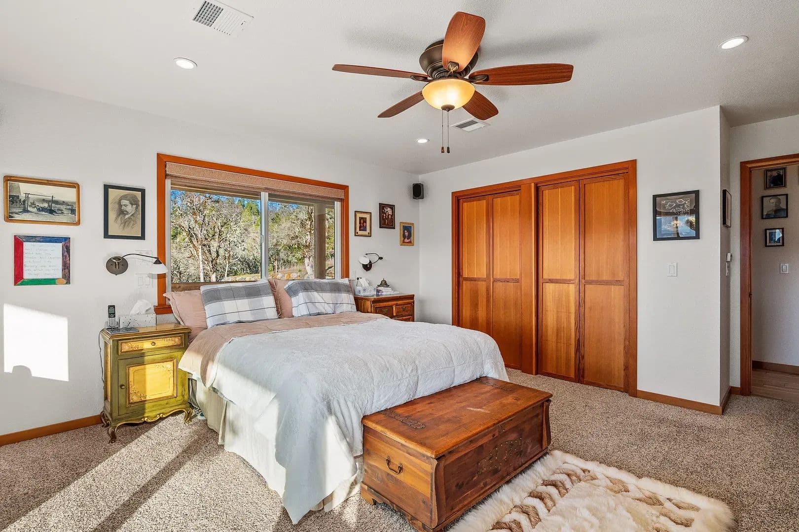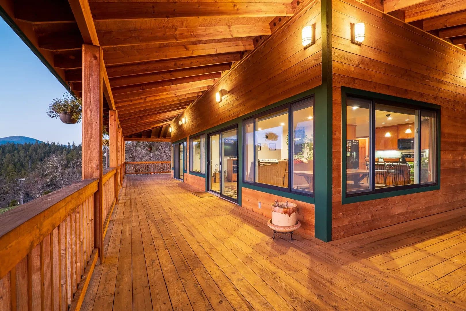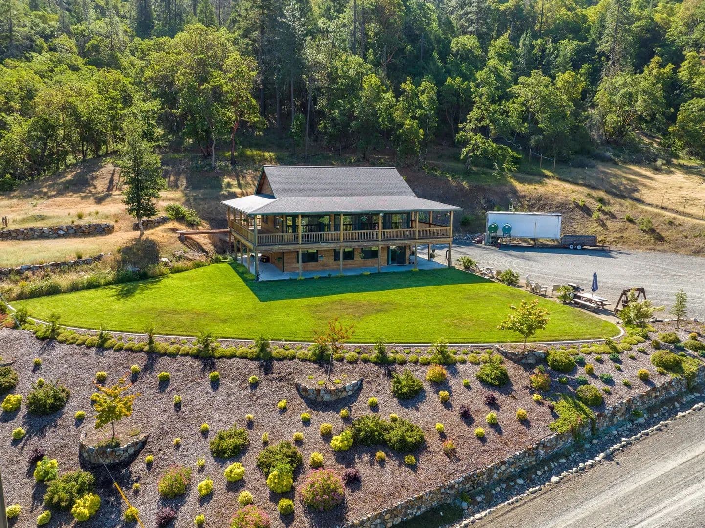 Presenting 375 Crickett Lane, a true builder's home with immaculate attention to detail and pride of ownership, from the gated entry to the polished travertine tile to clear vertical grain woodwork, quality is apparent at every turn! The grounds are as particular as the home and the 5 acres are fenced and gated; the property features a pond and irrigation rights fed by a spring. The exquisite craftsman home sits atop a stately manicured hilltop that includes various shrubbery, flowering trees, and a sprawling lawn upon a stacked stone terrace. It overlooks the valley to the west and features absolutely breathtaking sunsets! Located in the Illinois Valley just north of Cave Junction proper, Crickett Lane offers rural living in a gorgeous natural setting while also having easy access to Hwy 199 for trips to the Oregon Coast or for medical and professional services in Grants Pass and Medford. The property is the last on a dead end street past two gates, and backs up to BLM land that offers access to recreational land for hiking, hunting, and BLM even offers permits for harvesting firewood! The landscaping around the home enchants the senses as you ascend the driveway, with a beautiful rock wall bordering the carefully planted flowers and fruit trees, and a concrete curb encloses the lawn. The landscaping is all irrigated from the pond below; this pond is fed by a spring on neighboring BLM land and the property enjoys water rights for up to 3.6 acres of irrigation. With ample parking space for cars, trucks, and even trailers, the driveway is large enough for plenty of vehicles or toys. The owner also has blueprints for a shop that could be built in the future. Laid out with two bedrooms and one bath on each level, the home is well suited for multi-family or multi-generational living. There are private entrances on each level and the home features Rockwool sound-deadening insulation within all the walls including the floor & ceiling, so it truly provides privacy between the levels. Entering the first floor you will find the space filled with natural light filtering through windows that surround the room. The entry is laid with a slate tile and transitions to a beautiful rustic hickory flooring throughout the space with matching trim. Split into two usable spaces, the floor features a living room and an area that would be well suited for a dining nook or bar area - this space is split by a custom bar top laid in amber onyx that is backlit and prepped with plumbing to become a future wet bar. The living space features a gorgeous mountain range view to the west and a sliding glass door that exits to the full wraparound patio. The lower level includes two bedrooms: the first includes a large window to the west enjoying the view and both rooms are very well lit with recessed lighting as well as ceiling fans; all of the trim, closet, and doors are of a high quality clear grained wood that offers a beautiful contrast. A well organized mechanical room, laundry, and full bath with tile shower and schist vanity round out the main floor. Access to the main floor can be made through multiple exterior sliding glass doors on the wraparound deck, or from the interior stairs that lead from the downstairs living room to the kitchen. Walls of windows and glass doors wrap the kitchen and living space upstairs and offer magnificent views over the deck and to the mountains in the distance including an icon of the Illinois Valley, Eight Dollar Mountain. This space is packed to the brim with finishes certain to please the discerning homeowner - it is nearly too much to mention. The kitchen alone includes endless features - underlit clear grain cabinetry, cosmos schist countertops, large format polished travertine tile floor and travertine backsplash, recessed and decorative pendant lighting, and the list goes on. Transitioning to the dining and living room you are met by custom hardwood floors, theater grade surround sound wired in-wall, recessed dimmable lighting, and nearly 180 degrees of view. Large sliding windows and an eight foot sliding glass door are encased in clear grain fir continuing to tie the whole house together. Venturing down the hallway you will find two bedrooms and a full bath, each with solid core six-panel doors for quality, privacy, and longevity. This bathroom features beautiful travertine tile floors with a tiled base that leads to a luxurious walk in shower. The cabinetry in the bathroom is abundant and made to match the kitchen and is pristine in quality, topped in the schist stone with a beautiful top mounted sink. Moving on to the secondary bedroom you enjoy wood framed windows looking to the north for soft natural light; a ceiling fan, and large bifold closet make this a comfortable space. The master bedroom rounds out the top floor and also includes high quality flooring, surround sound, a lighted closet with cedar shelving and in-wall safe, bedside lighting and a feeling of tranquility staring out to the big sky view. This space is the control center for the home, with bedside switches for security lighting and viewing of the surveillance system on the tv, there will be no surprises. An eight foot floor to ceiling glass door provides access to the wraparound deck and lets in the evening sunset while keeping the morning sun at bay. As if the depth of detail on the interior wasn't enough, stepping outside on either level offers both a relaxing setting and the perfect opportunity for entertaining. The covered patio and deck are each approximately 2,200 square feet and have lighting and plenty of electrical outlets for any kind of decorations a buyer has in mind. There are even generator hookups on the bottom level for if the power goes out! The amount of thought and energy put into the home is directly reflected on the land as well. The owner has installed seven foot perimeter fencing around the property providing both security as well as keeping wildlife out of the manicured landscapin