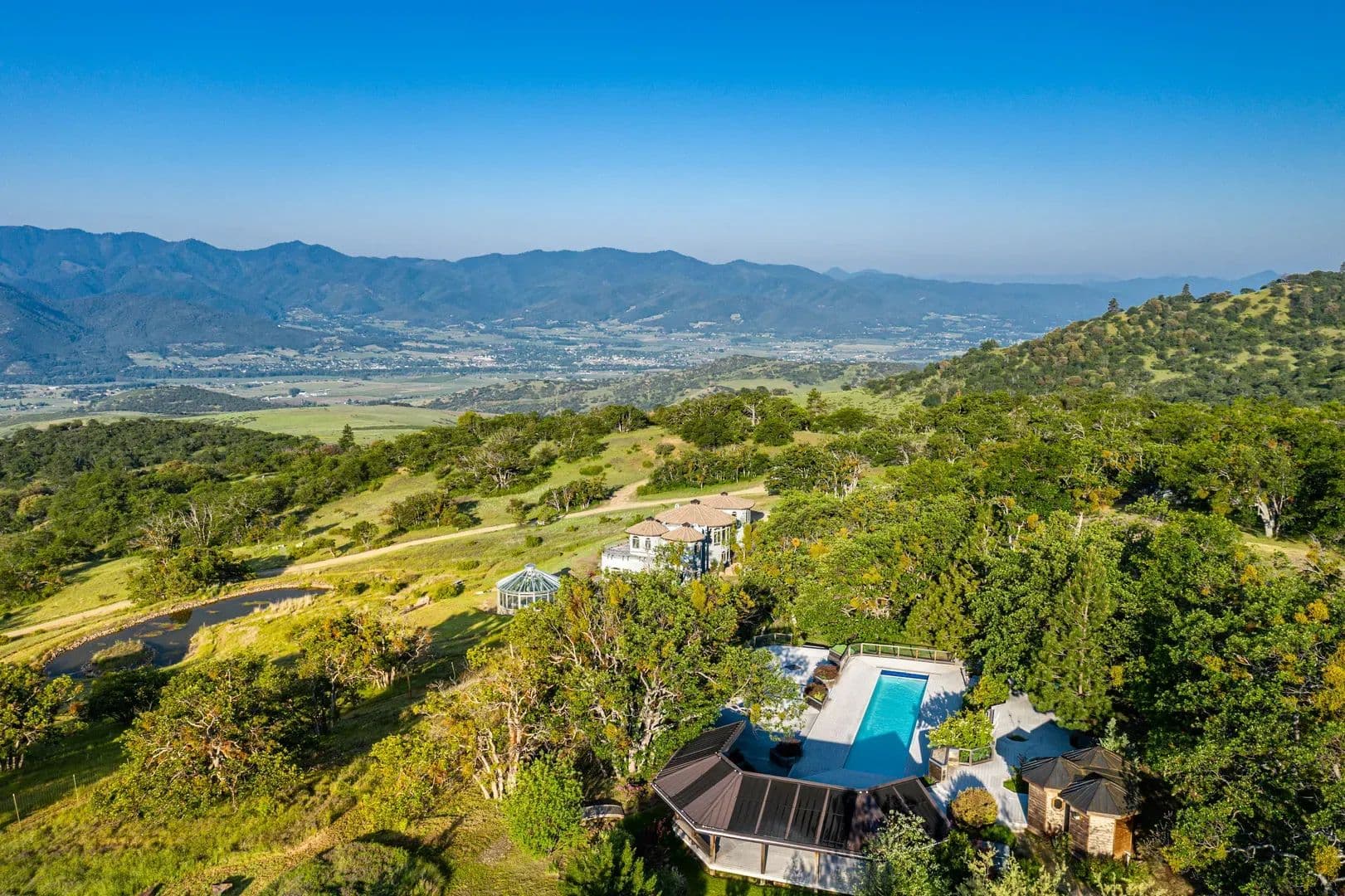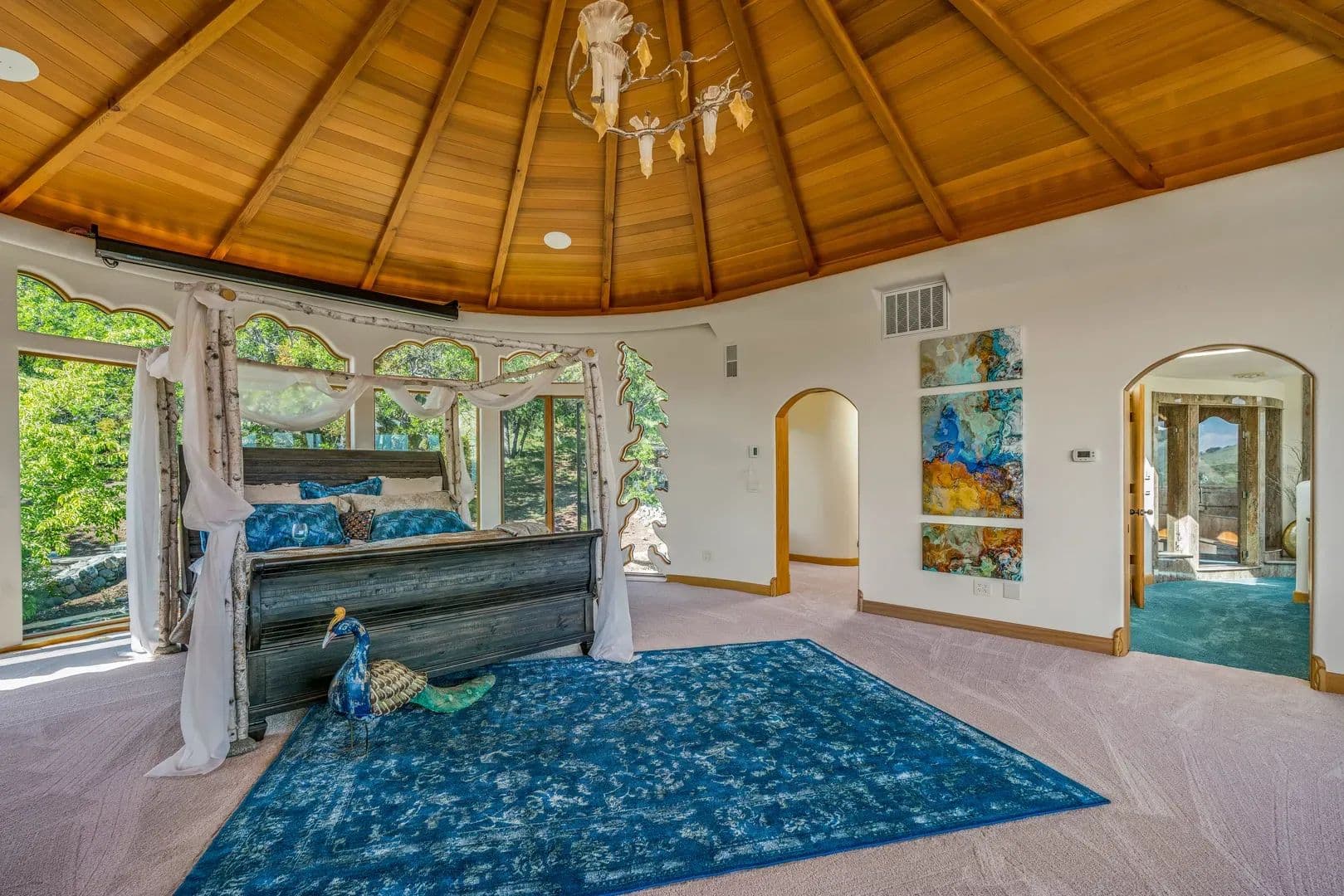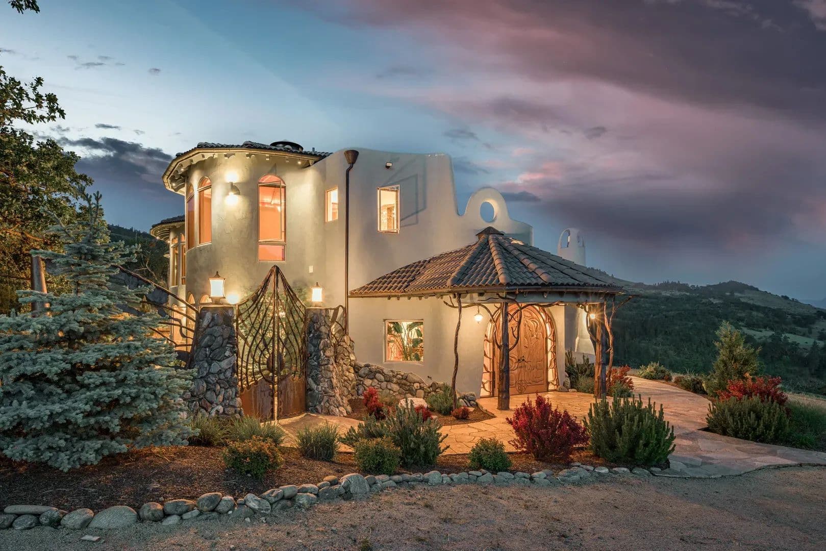 Welcome to the Valley View Luxury Estate, a one-of-a-kind custom estate set in the towering hills of Ashland, OR. This astonishing luxury home is one of a kind. Earthen tiles cascade down four distinct, rounded rooves crowned with small cupolas, capturing the geometrical beauty of Byzantine architecture. Beneath the tiles, the outer walls are smooth stucco, accented with a myriad of windows, rounded and flowing, reminiscent of the graceful and curvaceous architecture of Antoni Gaudi. Domes and crests of stucco stand against the sky, giving the impression of a white-washed chapel on the island of Mykonos. But despite its references to world-class art and architecture, this home has its own distinct and extraordinary style, borne out in every detail. Brazilian mahogany double doors, hand-carved by local artist Russell Beebe, introduce you to the essence of the home’s unique design: a celebration of nature. The sculptural carving depicts a traditional Native American theme with animals of the region including salmon, coyotes, and eagles. The doors are framed by sinuous sculptures of trees, wrought in copper, a theme that continues throughout the house, and the encircling stone patio. Inside the landing, the granite floor suggests the sandy shore at a river’s edge. A low accent of river rocks that flows around the house and into the front landing, ushers you forward to the second set of glass doors wrapped in a copper design that stretches out like tree branches onto the glass walls at either side. All the depth and color of the interior and the natural beauty reaching through multitudinous windows can be seen from this grand entryway, welcoming you home. As you step forward, a custom-designed hardwood floor winds like a river, carrying you in, as it flows and eddies around two free-standing staircases and continues deep into the home. The first staircase captures the eye, curving upward from the left and featuring two carved hawks at the base of a black walnut and glass railing, designed like a treehouse with copper accents. The low river rock wall from the foyer snakes out, supporting an abundance of house plants, and creating a border between the river path floor and a sunken living room on the right. As you curve around the rock wall and plants, the floor gently slopes down, past double glass doors that open to the front terrace and two wide floor-to-ceiling windows that let in the sky. A colorful mosaic of two dragons forming a heart wraps up a wood-burning fireplace. A miniature door to the right of the fireplace houses a wood closet that can be accessed from outside. The exalting cedar ceilings above, and throughout the house, are expertly crafted with tapered tongue-and-groove planks and cedar beams. To the immediate left of the entranceway is the guest bathroom. A translucent blue glass sink drips toward the tiled floor mimicking the water it is home to. Just beyond, rounding out from the first staircase is the dining room. Five large windows let ample light spill into this gracious space, which is embraced by numerous preserved manzanita trees that seem to grow out of the walls and tickle the ceiling. A glass door leads to a back patio and terraced garden that rises up the slope of the hillside. The garden is colorfully landscaped with rose bushes, lavender, rosemary, small needle-leaf trees, and low river rock walls. Continuing through the dining room and further into the house, a wall of windows wraps around a second free-standing staircase featuring two exquisitely carved salmon, and leads to the open, airy center of the home, the kitchen. Beautiful curved granite provides ample counter space and home to top-of-the-line stainless steel appliances. The floor transitions to warm earth-tone travertine featuring pewter inserts embossed with a spiral design, also found on the pewter drawer pulls. Natural manzanita tree trunks support a large kidney-shaped center island with seating for four. The earthy rose and red tones of this welcoming space are complemented by the blue of the sky and the ever-green of the trees that seem to enter through the abundance of windows. A breakfast bar with seating for four extends part-way into the space, creating a small divider between the kitchen and a relaxed open living space that enjoys five custom skylights, sculptural windows, and two sets of glass double doors that open to the stone patio. From here you notice a remarkable quality of the home: every direction provides an awe-inspiring vista, to the natural environs and endless view, but also to the beauty of the home itself. You can see deep into the house from almost any point and enjoy the extraordinary appointments and artwork in the foreground, mid-ground, and distant background. It is perfectly cinematic. The sensation is expansive, without being overwhelming, like wandering through a magical wood or the narrow, promising streets of that white-washed Greek isle. The journey continues along the winding hardwood floor to a third living space with magnificent eastern light. There is a full guest bath around the corner. A second passageway from the kitchen leads to an ample pantry and laundry room, and a stunning spiral staircase, built on a single beam of laminated oak that serves as the second entrance to the master suite. The main entrance to the master suite is the second staircase from the entrance. At the top, a row of copper trees curves along the banister and opens up to a wonderful, airy hideaway. Sculptural windows in the shapes of windswept pines, spruce, and buoyant clouds frame a wall of windows that looks onto the panoramic view – perfect to watch the radiant sunrise and the beautiful shale pink light at sunset. The second wall of windows gazes on the rising terraces of flowers and trees and lets in the bubbling sounds of the garden water feature. The vaulted clear oak ceiling of this rounded room gives a grand sense of spaciousness and privacy. Two arched doorways on the 
