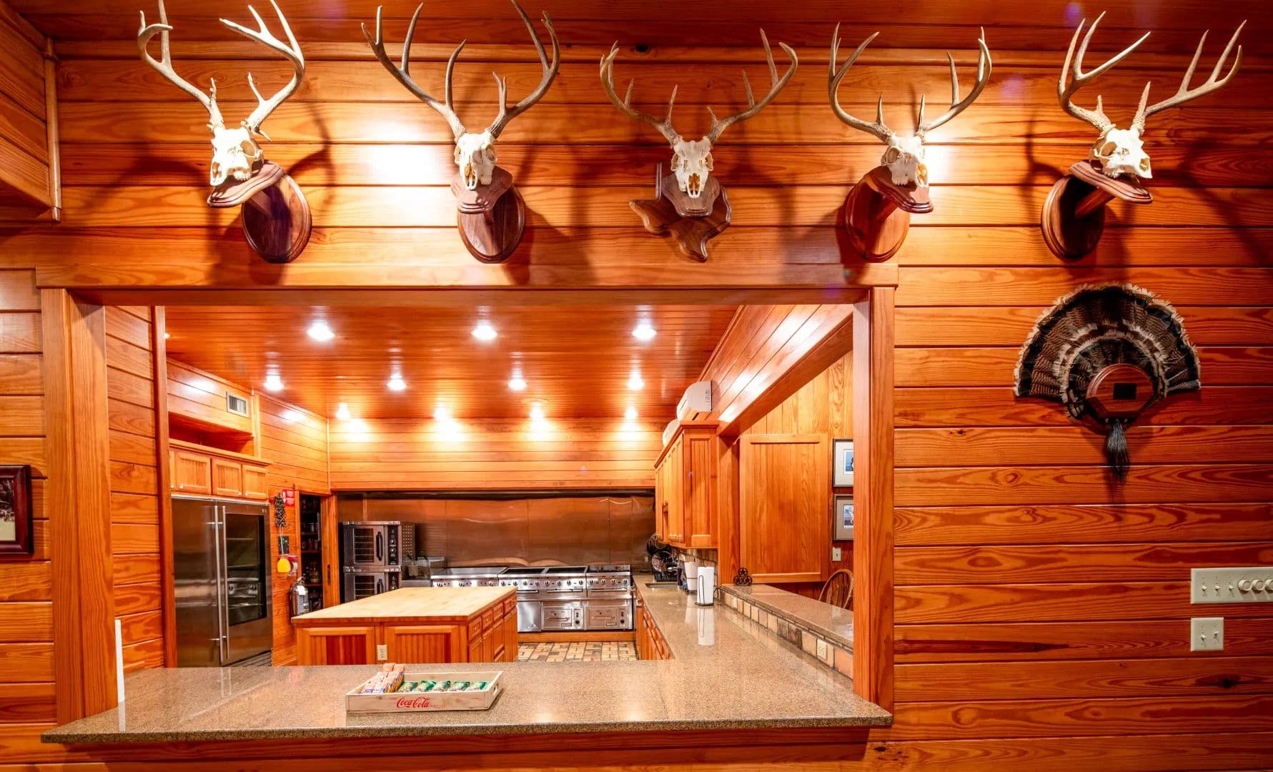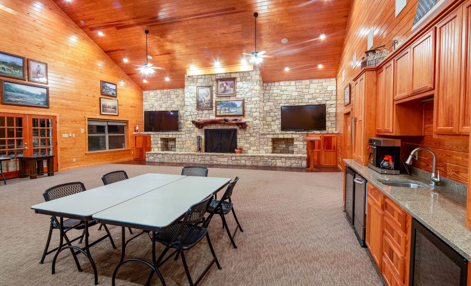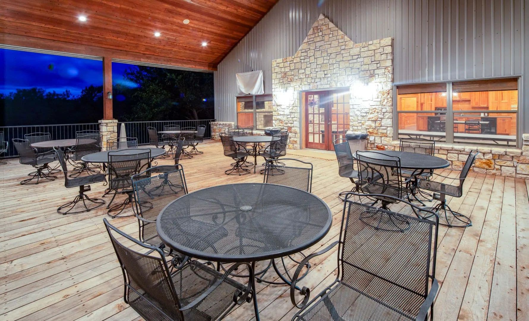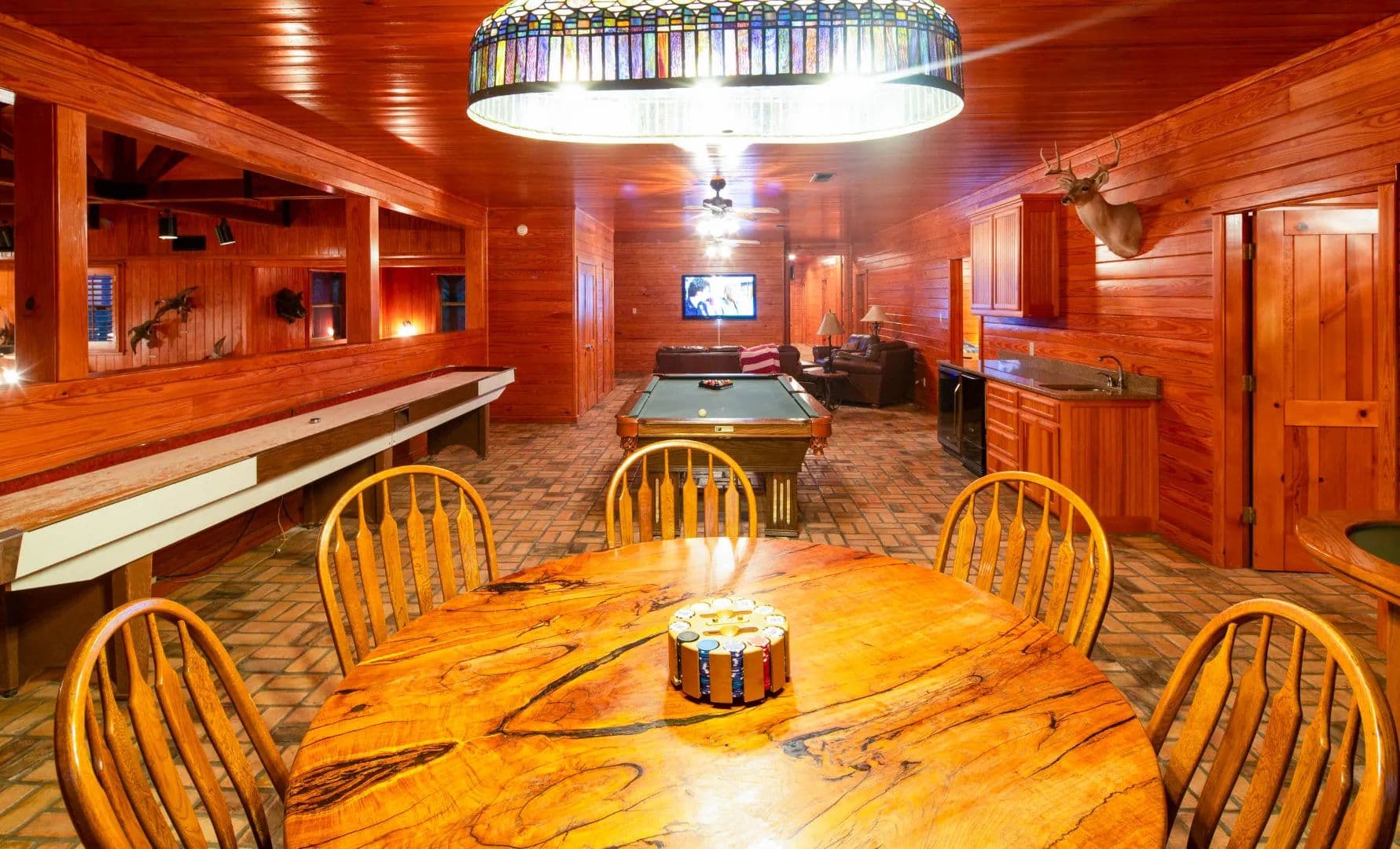 The two-story Lodge consists of 10 bedrooms, 11 bathrooms, and a commercial kitchen with a walk-in refrigerator and freezer. A spacious dining area accommodates guests, as well as a living area featuring a massive fireplace, game room and entertainment areas, complemented by large porches for guests to enjoy. Overall, the Lodge encompasses almost 10,000 SF.