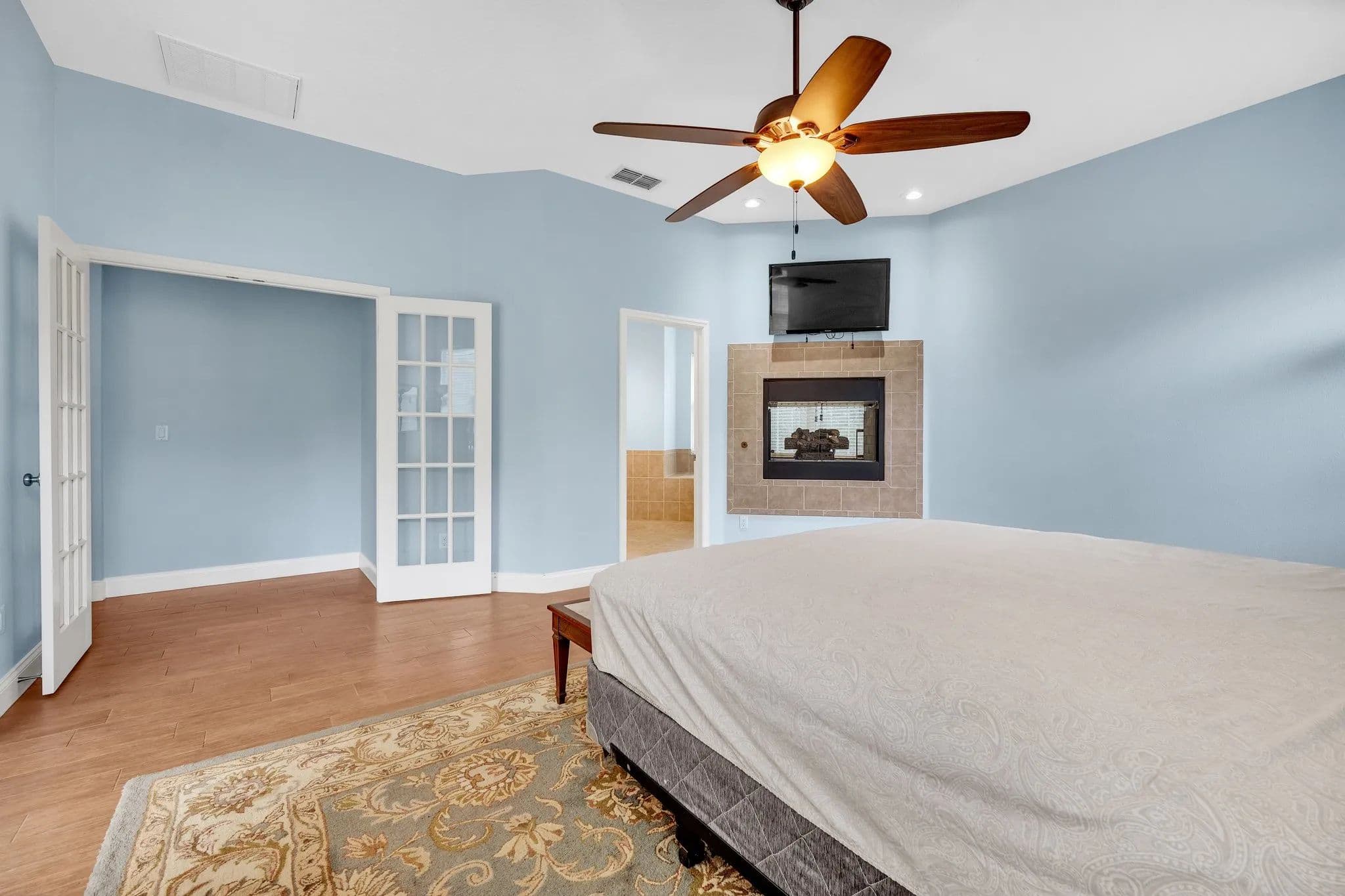 The striking exterior, with arched windows, a grand columned entry, and natural surroundings, sets the tone for the comfort and elegance within. Step inside to a bright, open-concept layout with tile flooring throughout, creating a seamless flow from room to room. The formal living room welcomes you with abundant natural light, vaulted ceilings, and a gas fireplace, perfect for cozy evenings. The heart of the home is a gourmet kitchen, featuring premium appliances including a Viking oven and Sub-Zero refrigerator, complemented by generous cabinetry and countertop space—ideal for both everyday cooking and entertaining. Retreat to the luxurious primary suite, which includes a double-sided gas fireplace that connects to a spa-inspired bathroom, creating a peaceful, retreat-like atmosphere. Across the home, you’ll find three additional bedrooms and two full bathrooms, offering ideal separation for family or guests. A dedicated study and formal dining room provide functional, flexible living spaces for working from home and entertaining with ease. Step outside to enjoy the outdoor kitchen area, perfect for weekend grilling, al fresco dining, and hosting gatherings in your private, scenic backyard.