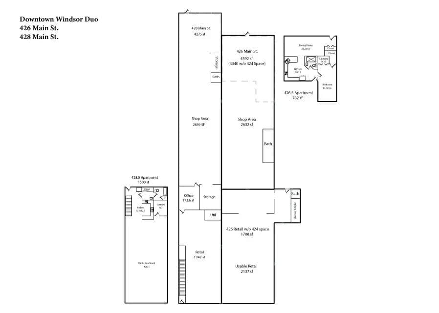The 426 Main St. building offers 4,340 total main level square footage, which includes a 1,708 SF front retail space, 2,632 SF of back room/storage space plus a 782 SF one bedroom/one bath apartment with Windsor Lake views that is currently leased.