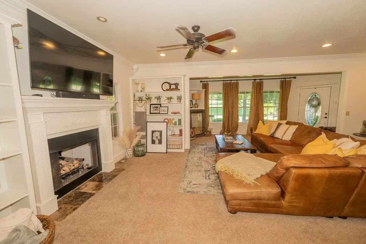 For more formal occasions, there's a separate dining room that can easily accommodate large dinner parties. The living room boasts a cozy fireplace, making it the ideal spot for relaxing on chilly evenings or enjoying intimate conversations with loved ones.