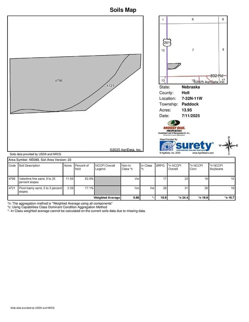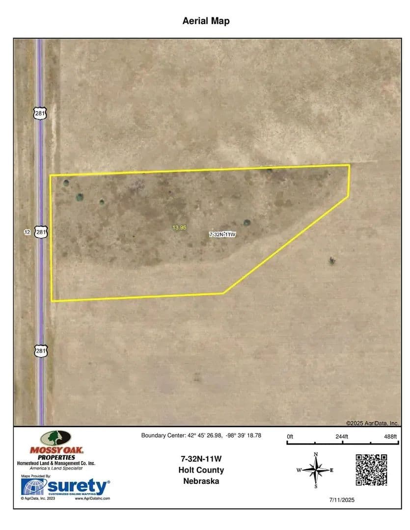 14 Acres+/-Holt County, NE Description: Offered is a 14 acre unimproved building site with Hwy. 281 frontage and electrical service at the road. Final boundaries and acres to be determined by survey to be completed. Ideal site for future home or commercial building. Small tracts such as this do not come to market very often. Call for complete details! Directions: From O'Neill, NE: Take Hwy. 281 north for approximately 20 miles, (Just north of Intersection of Hwy. 281 & 892 Rd.) Taxes: Approximately $154 ($11/acre) Part of tax parcel #450873000 Legal Description: Part of the S 1/2 of the SW 1/4 in Sec. 7, Twp. 32N, Rg. 11W, Holt Co., NE (Subject to completion of survey)