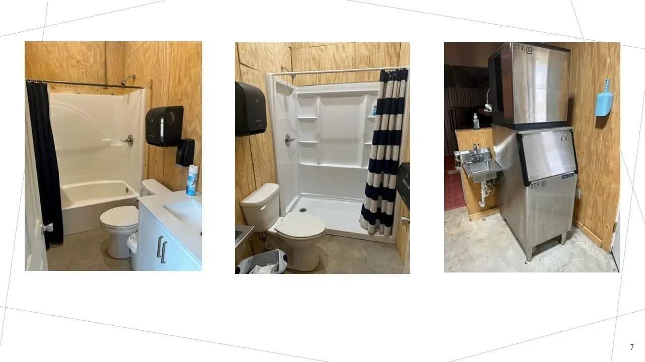 At its heart, you'll find a central pavilion featuring a fully furnished living area with 2 bedrooms, 16 total beds (8 bunk beds), a commercial-grade kitchen, a kitchenette with refrigerator and sink, 2 showers, 2 toilets, an outdoor shower, and mini-split A/C for year-round comfort. The covered front porch and fire pit overlook the nearby creek, offering a peaceful, scenic atmosphere. Built with metal siding and roofing, the structure is both durable and low-maintenance.