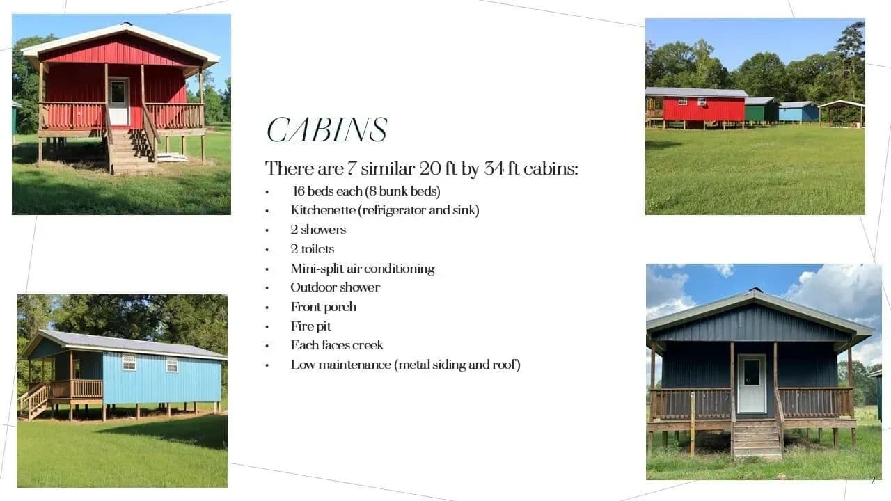 Complementing the pavilion are 7 additional bunk-style cabins with 16 beds each, designed with comfort and ease of upkeep in mind. In total, the property can comfortably accommodate up to 125 guests, making it ideal for retreats, family reunions, camps, corporate events, or short-term lodging.