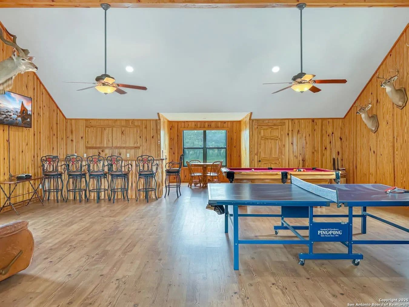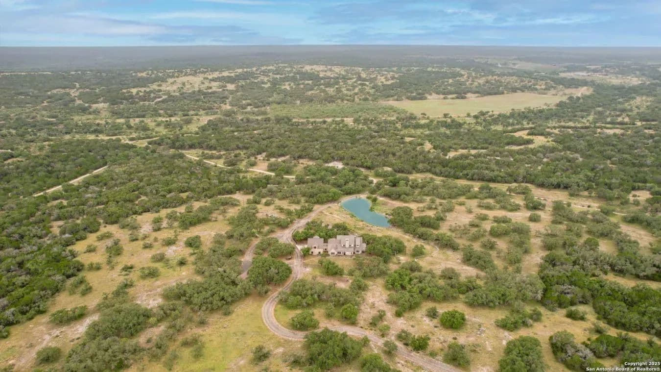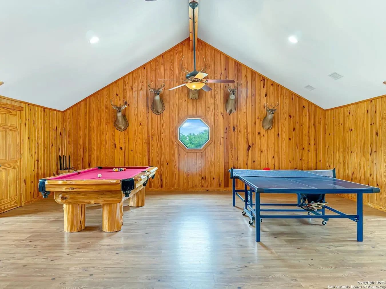Welcome to Yates Ranch, a 121-acre turnkey Hill Country escape designed for comfort, recreation, and outdoor adventure. The main lodge features 5 spacious bedrooms, 4 baths, 2 living areas, a formal dining room, and an indoor hot tub room. Entertain with ease in the upstairs game loft outfitted with a bar, pool table, poker table, and ping pong. Rocking chair porches overlook native oaks and a fully stocked, concrete-lined pond perfect for fishing or swimming. A separate guest cabin offers additional sleeping space. The oversized 3-car garage with workshop provides room for ATVs and gear. Blinds and feeders are in place for immediate hunting opportunities. Located near the historic Y.O. Ranch Headquarters with access to hunting tours, clay shooting, horseback riding, and event amenities, this property is ideal for family gatherings or corporate retreats. A rare blend of privacy, luxury, and Texas wilderness all in one.
