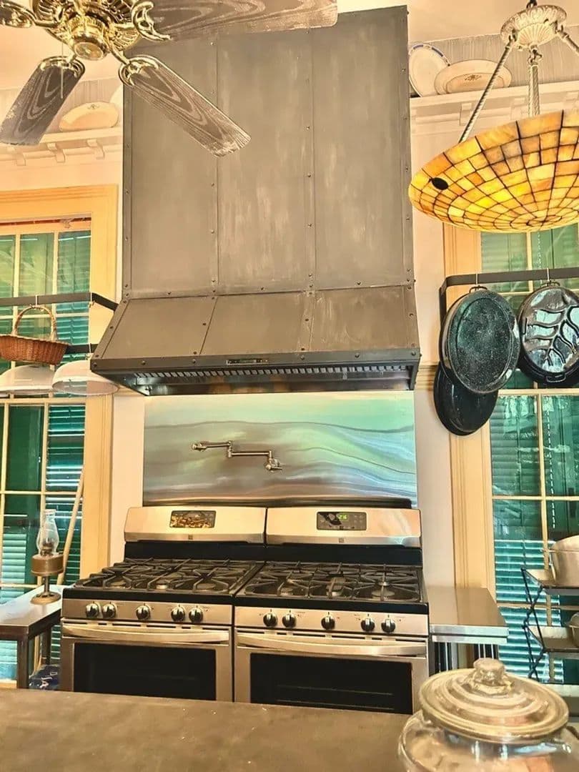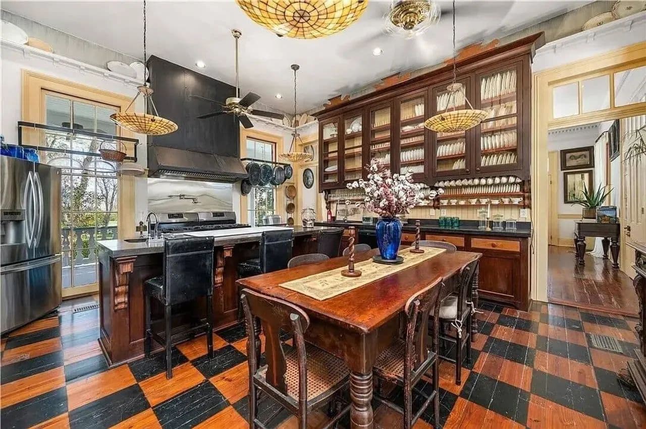 The spacious kitchen combines visual charm with functionality: checkerboard wood floors, polished concrete countertops, custom vented fan over double ranges, and modern recessed lighting are crowned by dramatic Tiffany-style lighting fixtures.
