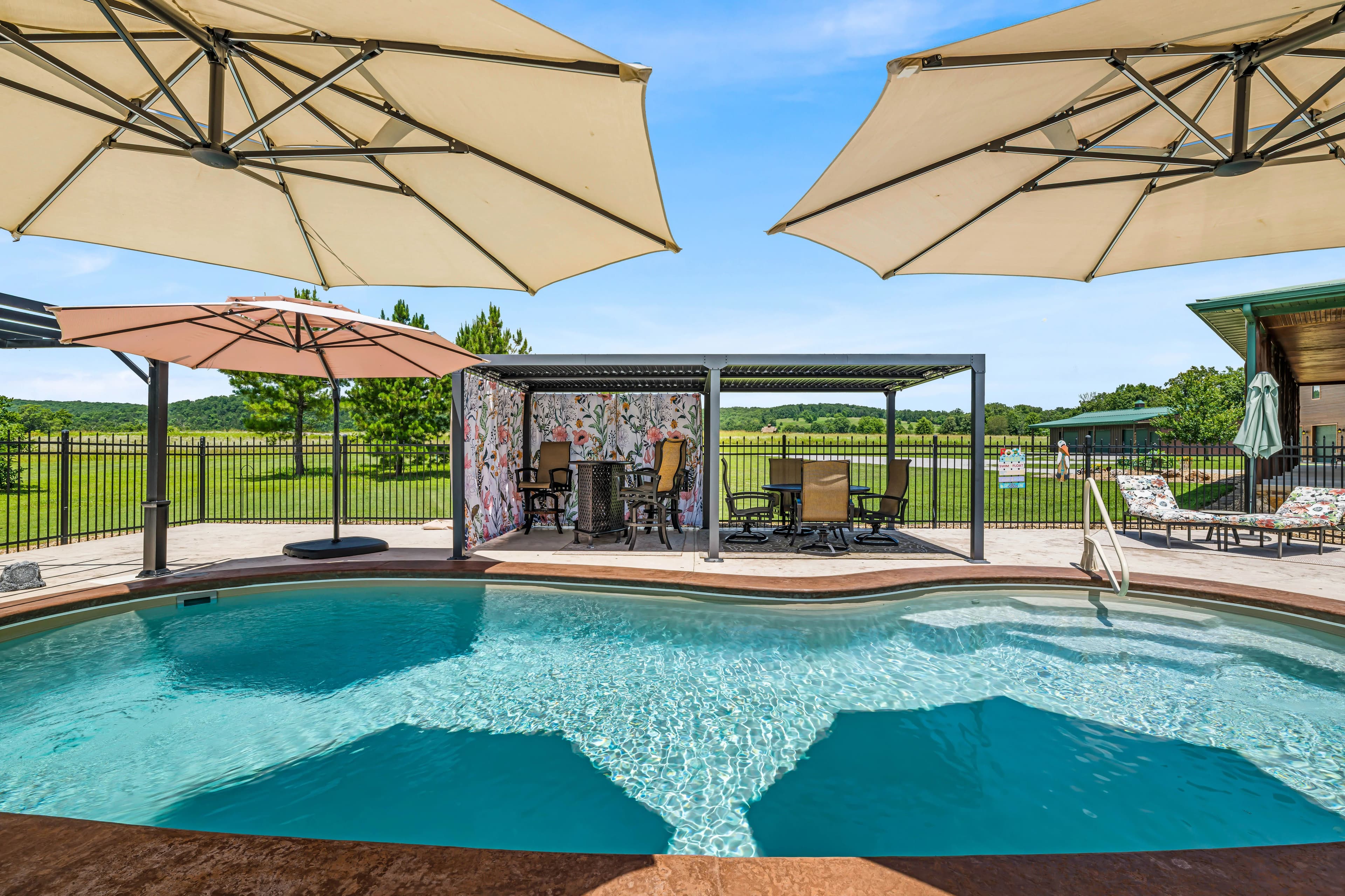 • Resort-style fiberglass saltwater pool with surrounding patio and lounging areas