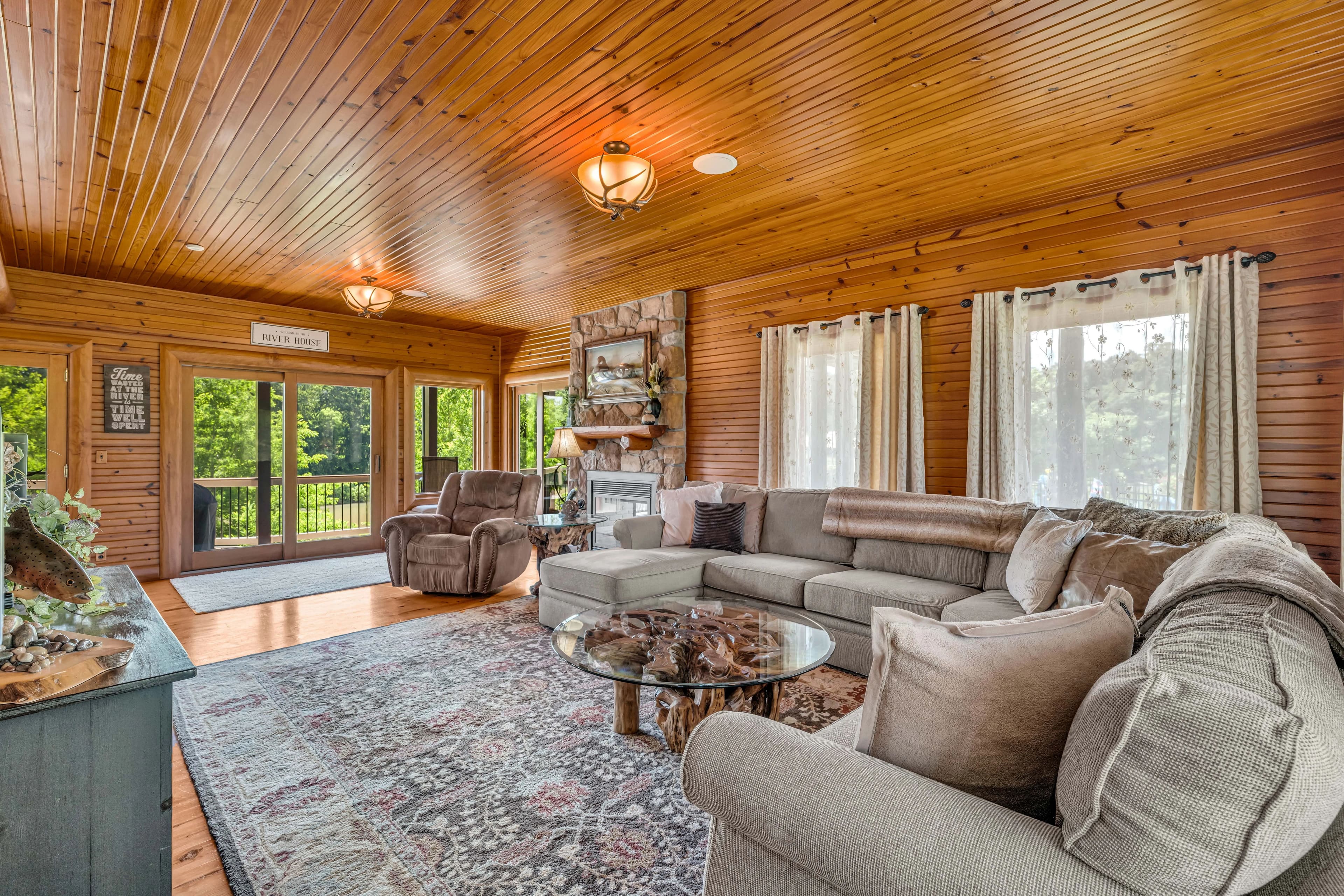 Set on 4.82 manicured acres spanning two lots, this property boasts unrivaled river frontage, panoramic views of the Ozark Hills, and a gently sloping yard for direct access to the water—ideal for fishing, kayaking, floating, or simply relaxing.