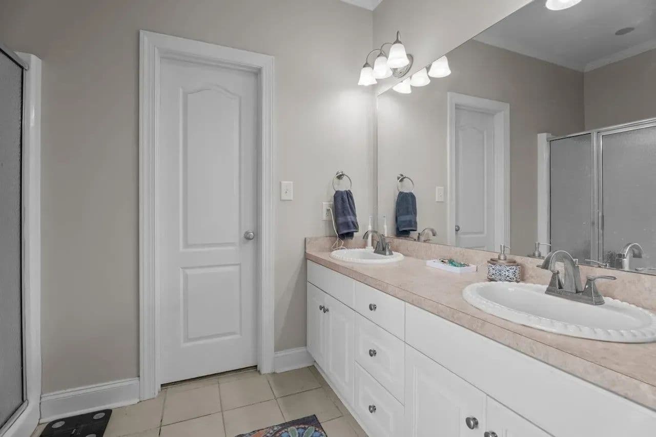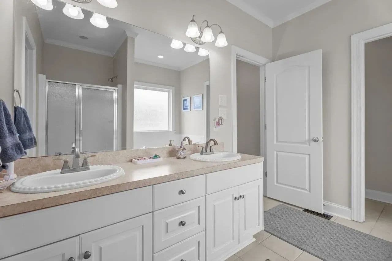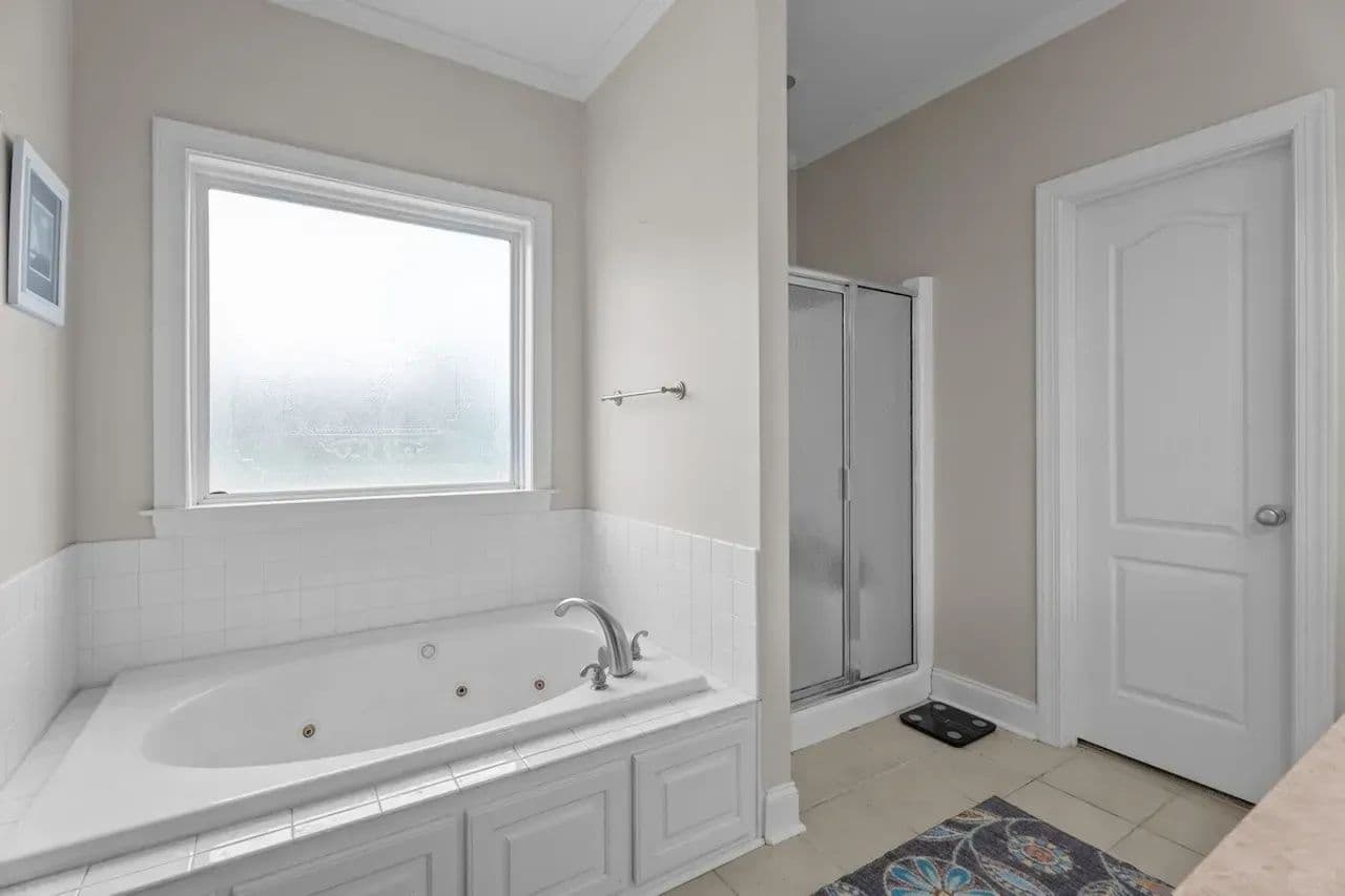 Inside, you’ll find a large living room with LVP flooring and vaulted ceilings, a stunning kitchen with stainless steel appliances, a farmhouse sink, an open dining area with a beautiful bay window,, and a dedicated laundry room! The primary bedroom includes two walk-in closets, a double vanity, a soaking tub, and a standalone shower. The guest bedrooms are also a great size for any additional space you may need!