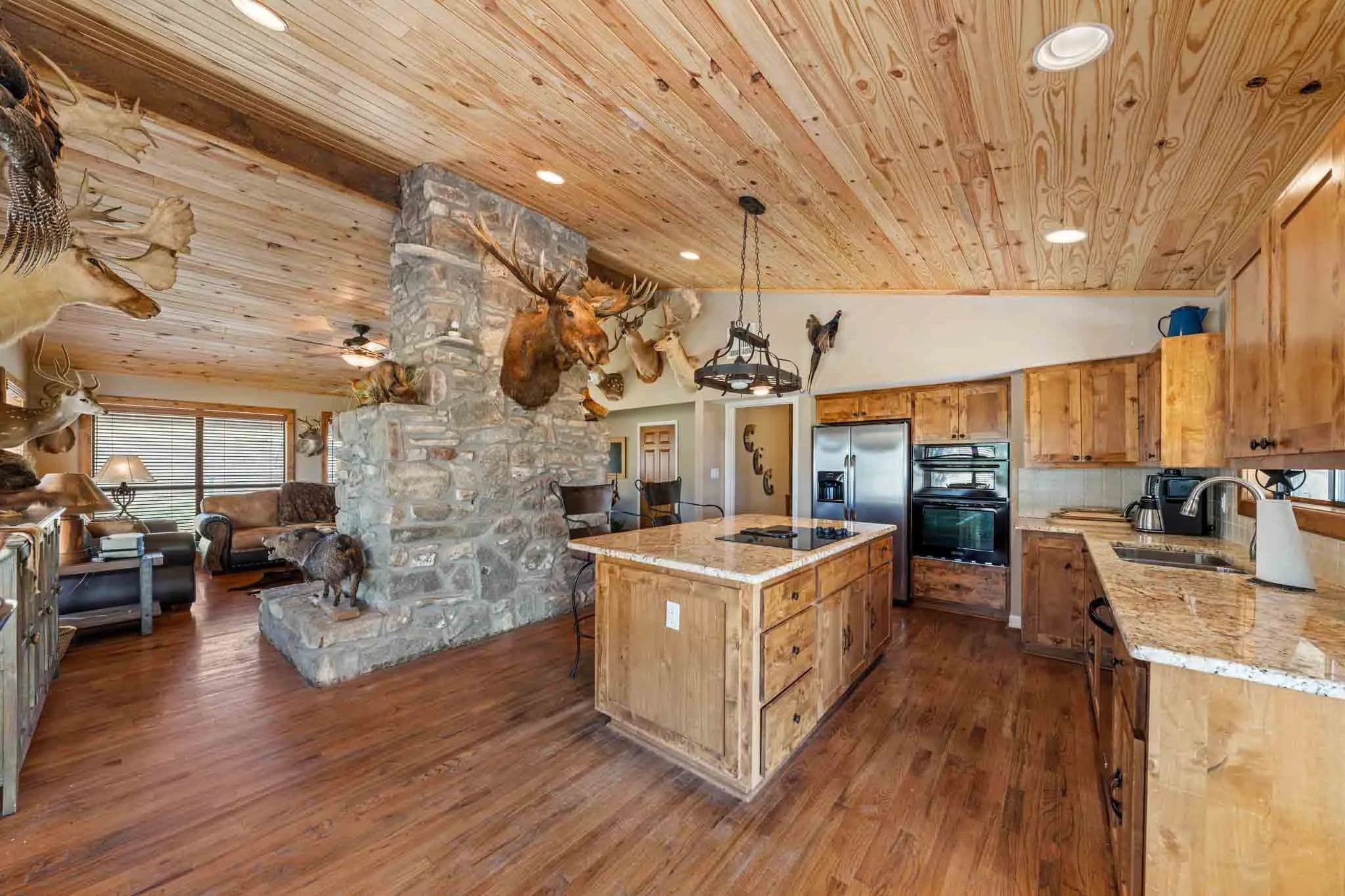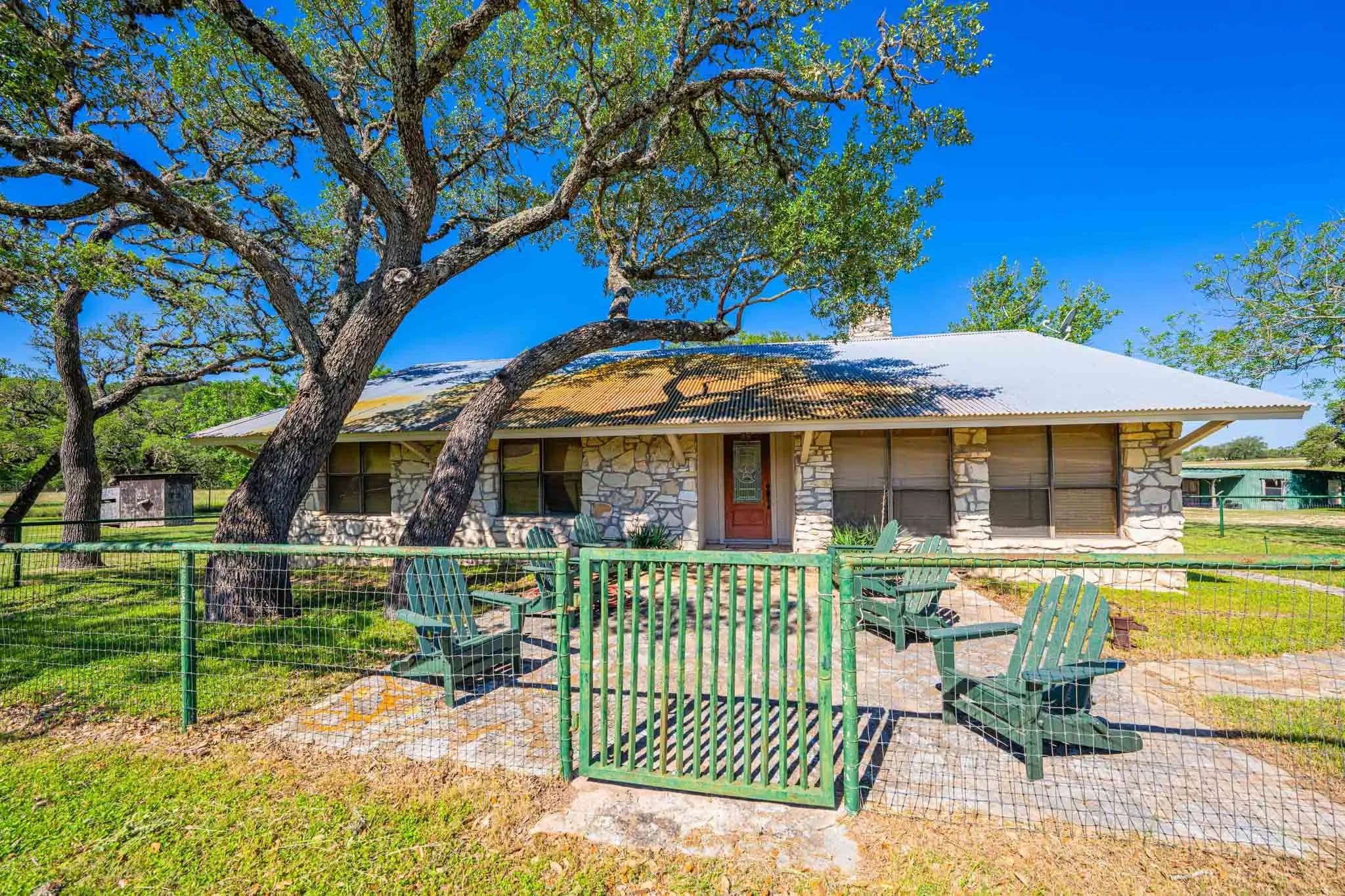 The ranch features a charming 1,831± sf remodeled rock ranch house with two bedrooms and two bathrooms. The open-floor concept, high ceilings, and large windows create a spacious and inviting atmosphere. A large-rock fireplace creates a focal point in between the living room and the kitchen. The kitchen features wooden cabinets, a center island with a cooktop and seating, double ovens, a refrigerator, and a dishwasher. A cozy breakfast nook with large windows offers a perfect spot to enjoy morning coffee while taking in the stunning views. The large covered front porch, complete with ample seating, allows you to fully appreciate the astonishing views of the Hill Country. Additional improvements include a barn, a shed, and working pens for livestock.