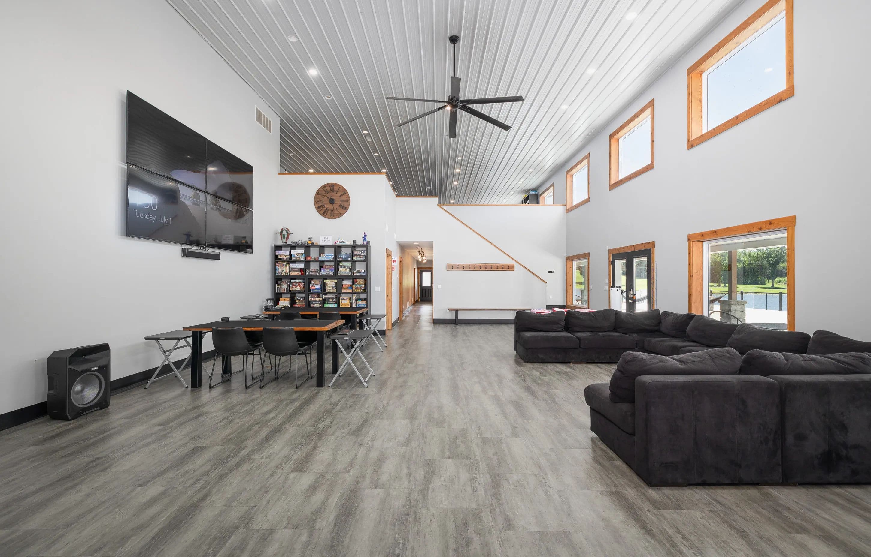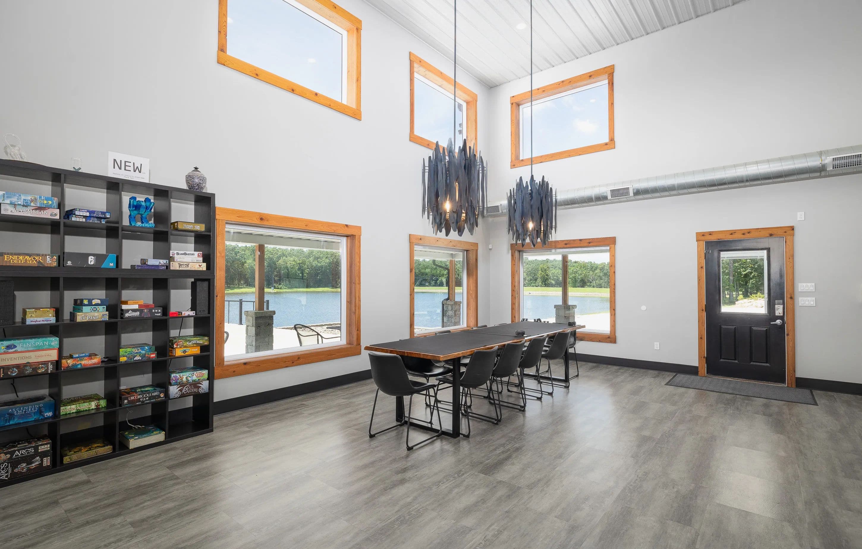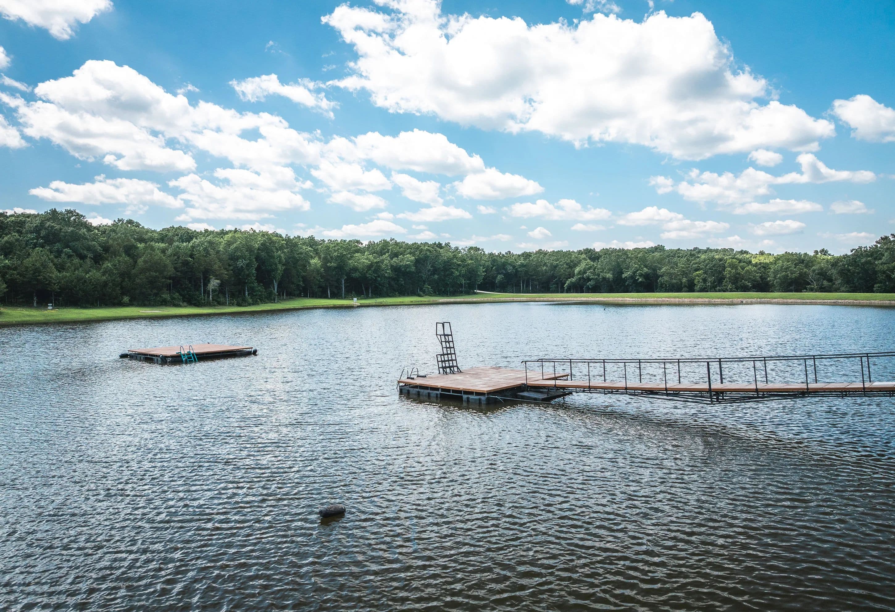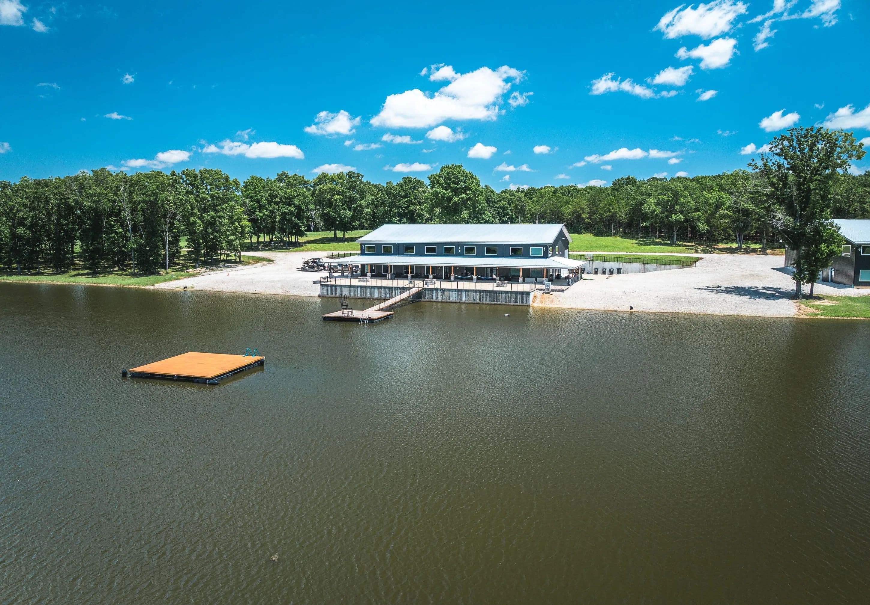 The lodge includes expansive common areas, a large eat-in kitchen, game rooms, covered porches, and incredible views of the private lake – the perfect setting for fishing, kayaking, swimming, and outdoor fun. Guests can enjoy miles of trails, open fields, and wooded serenity.