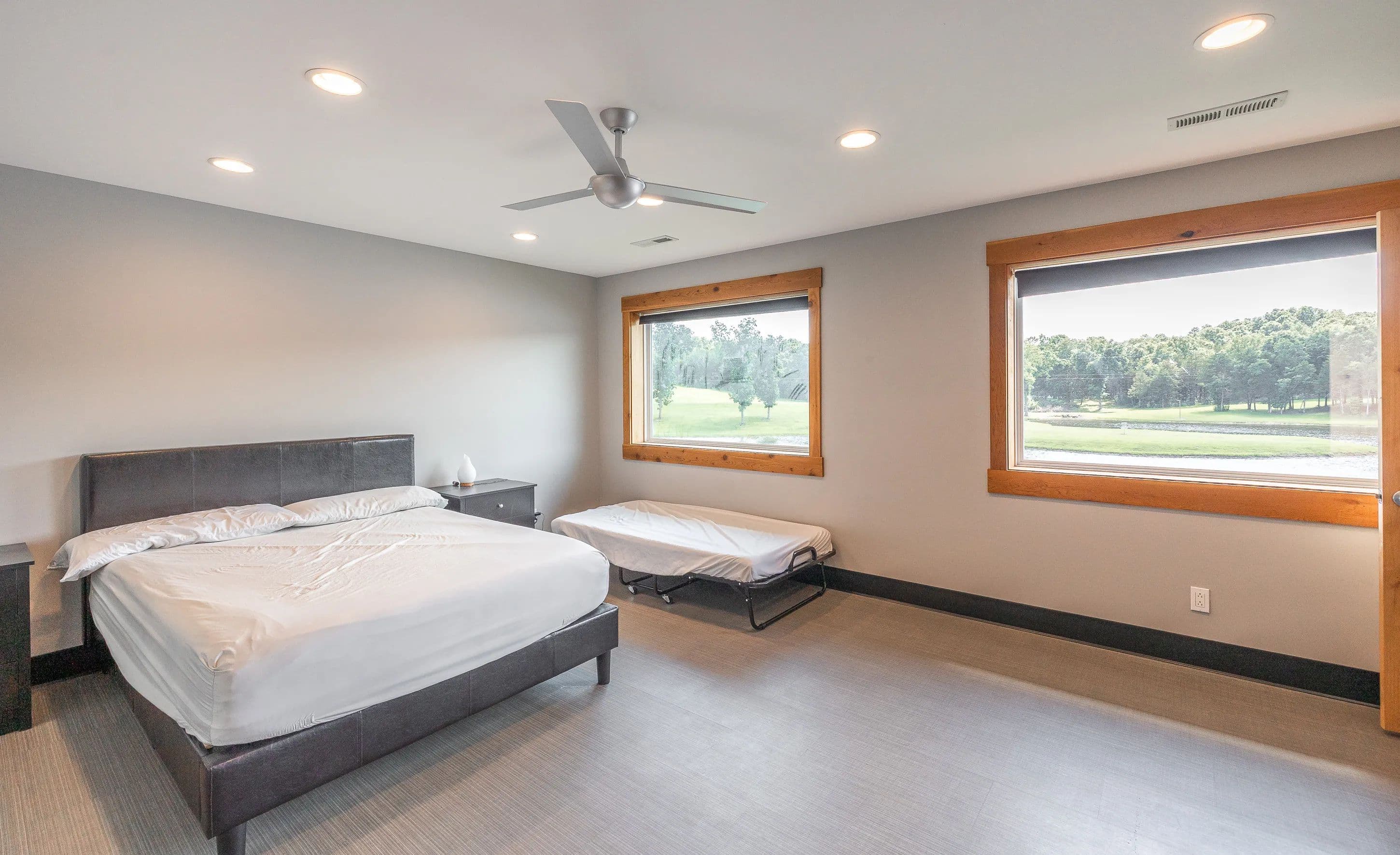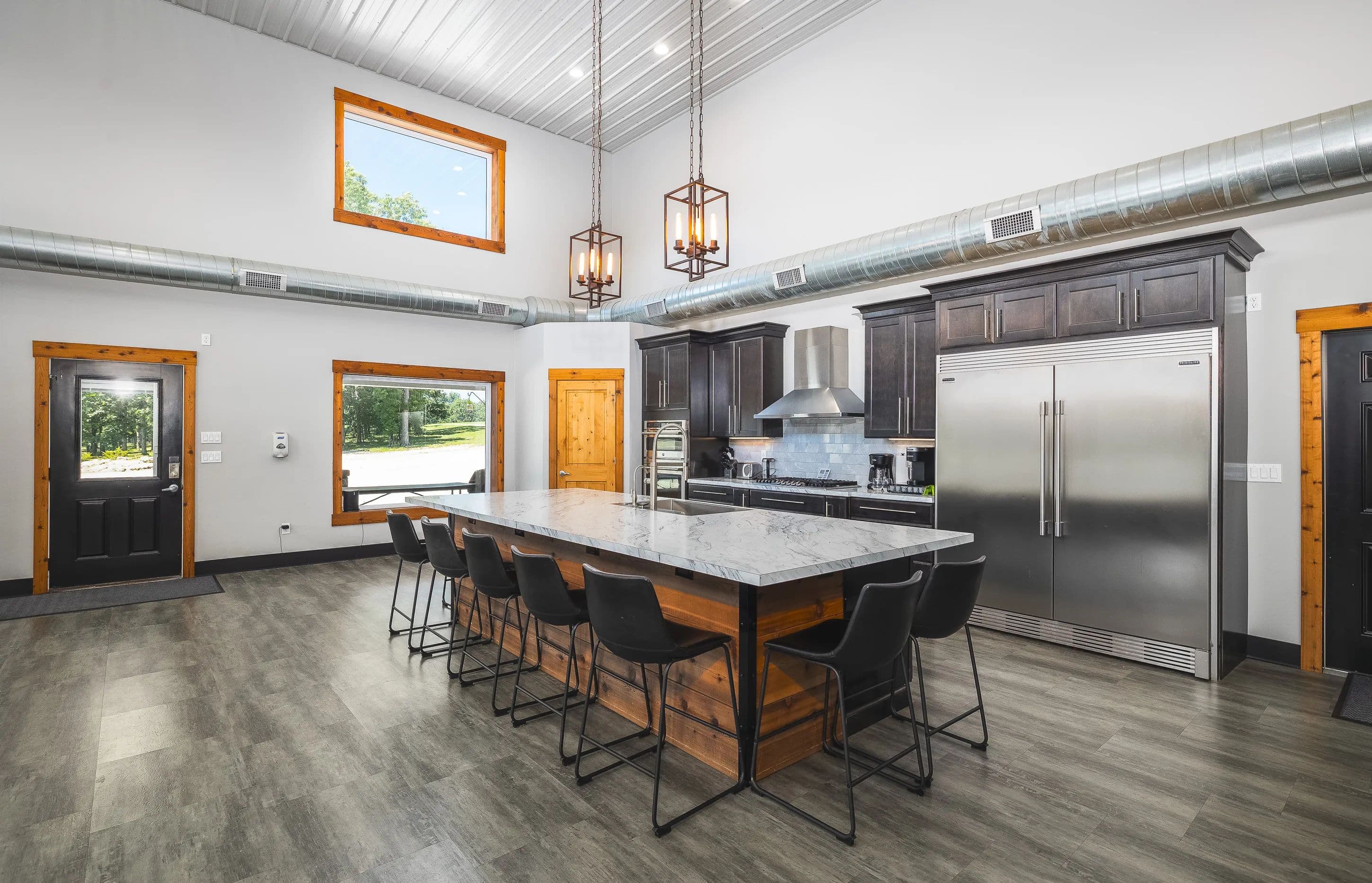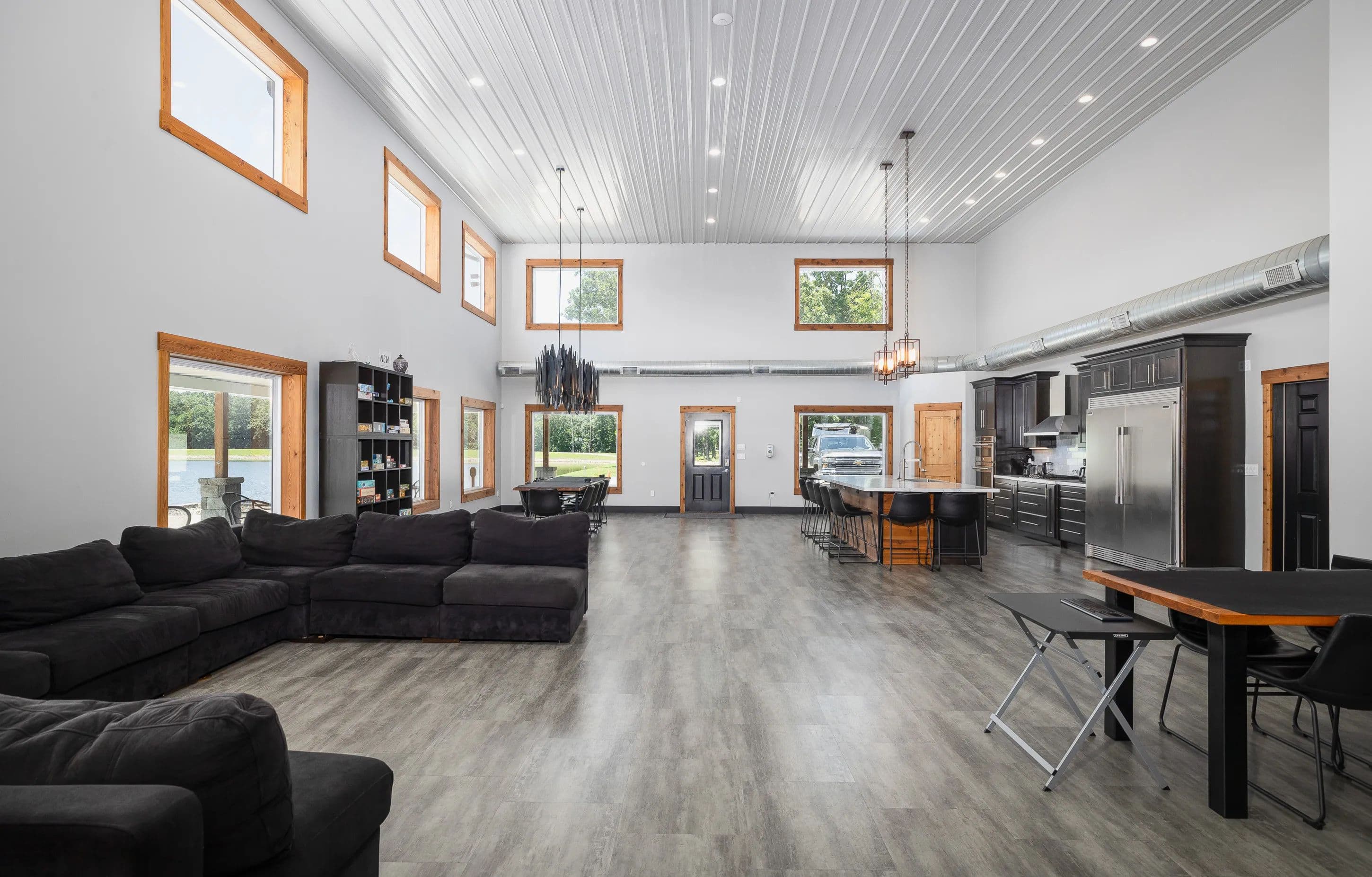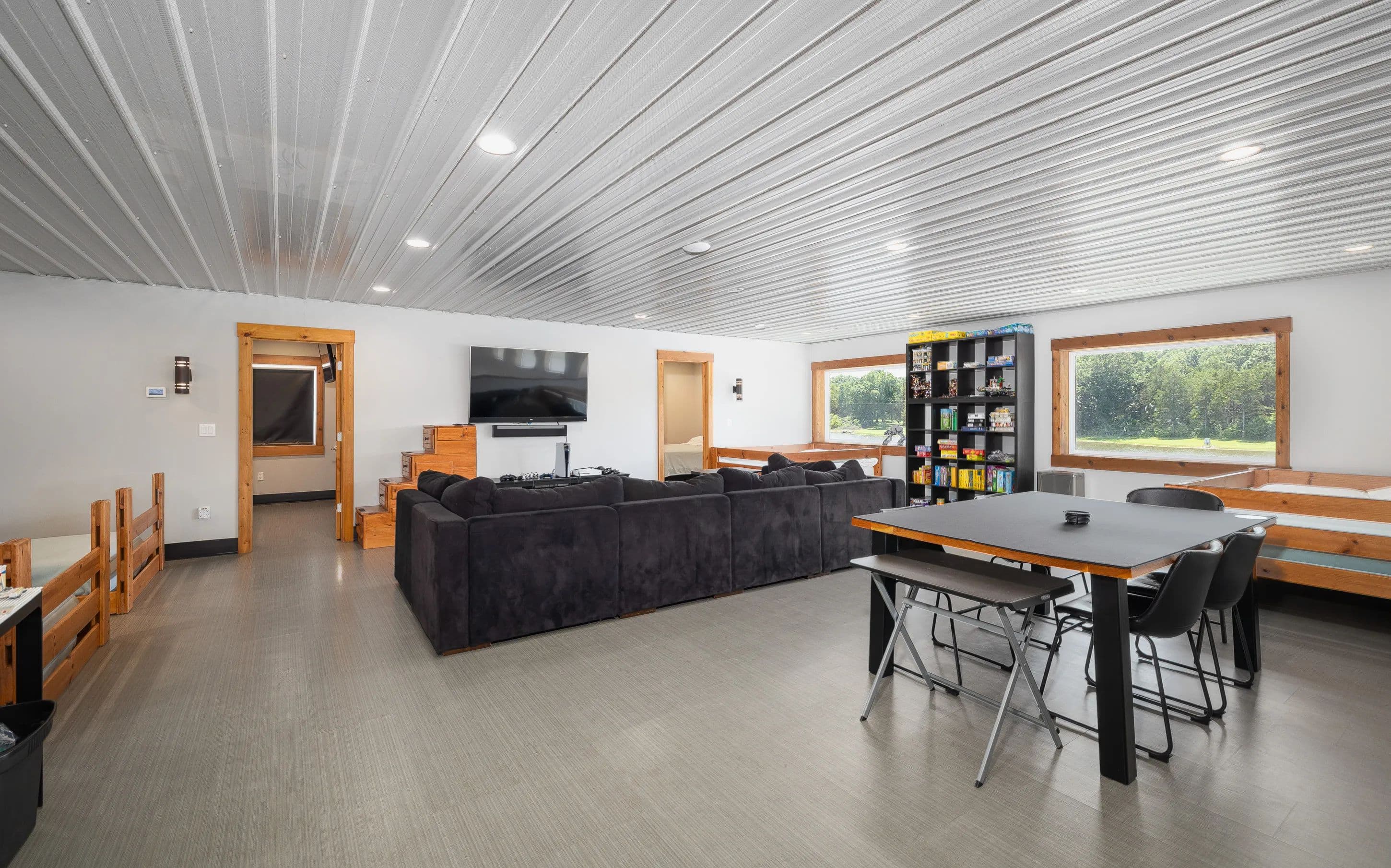 The lodge includes expansive common areas, a large eat-in kitchen, game rooms, covered porches, and incredible views of the private lake – the perfect setting for fishing, kayaking, swimming, and outdoor fun. Guests can enjoy miles of trails, open fields, and wooded serenity.