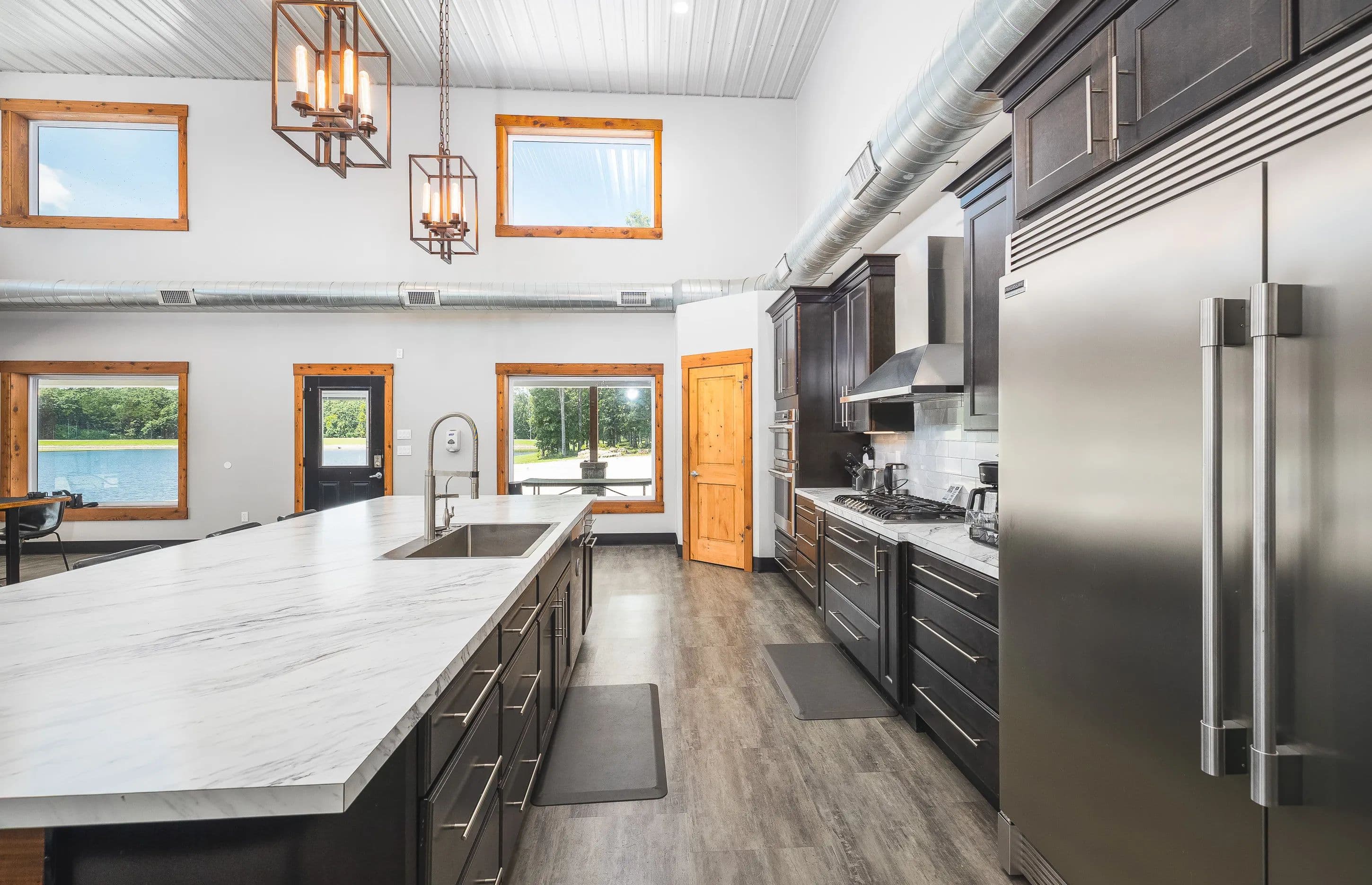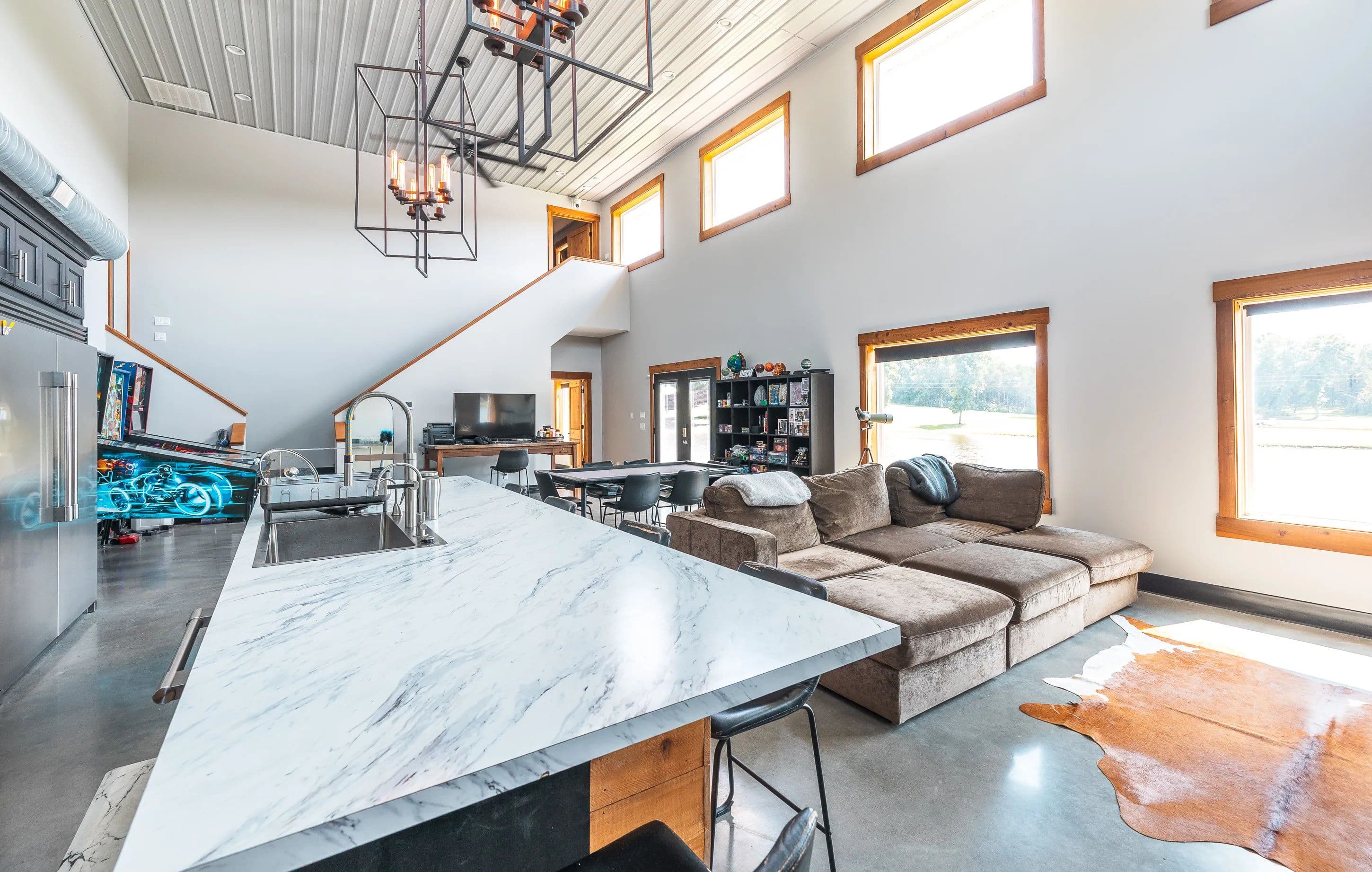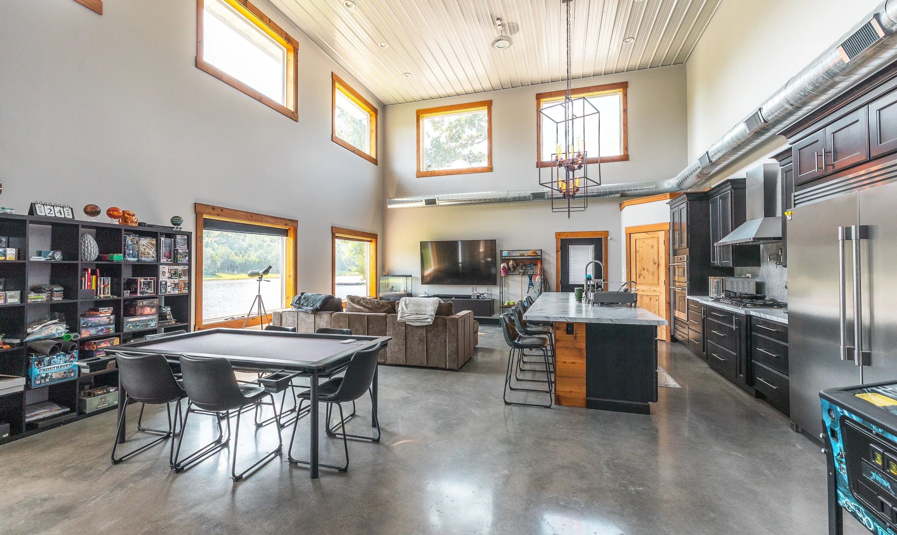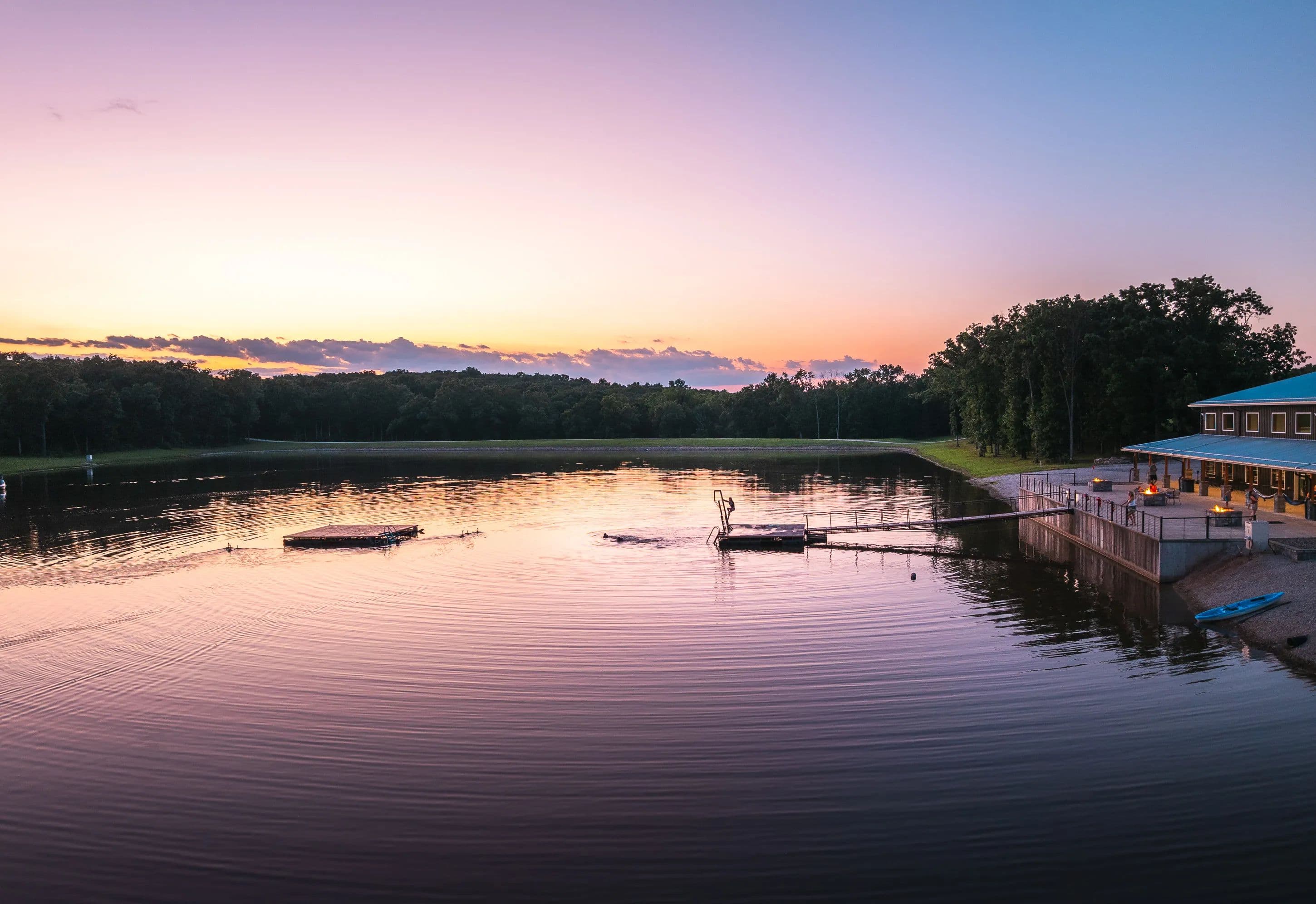 The lodge includes expansive common areas, a large eat-in kitchen, game rooms, covered porches, and incredible views of the private lake – the perfect setting for fishing, kayaking, swimming, and outdoor fun. Guests can enjoy miles of trails, open fields, and wooded serenity.