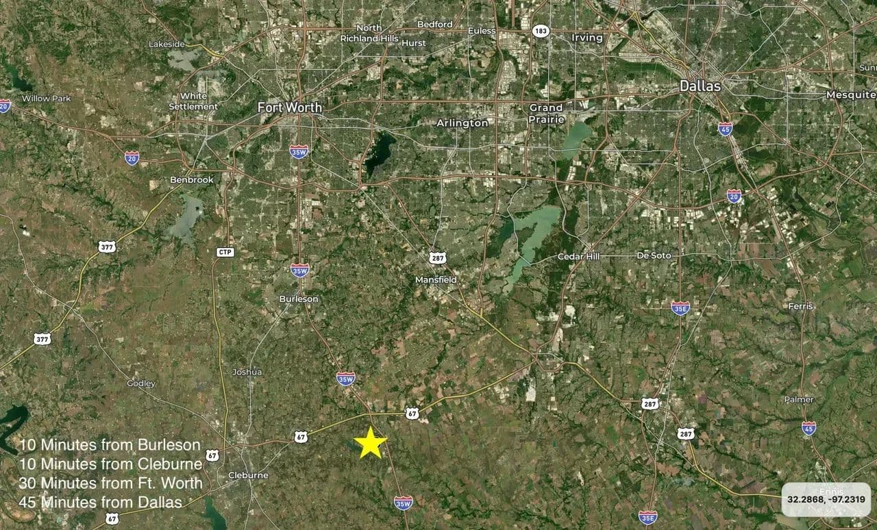 Explore the perfect combination of beauty and space with this expansive 12- acre tracts in Alvarado, TX. Located just minutes from I-35 and HWY 67, and Alvarado Lake this property offers easy access to major highways while maintaining a serene, country feel.