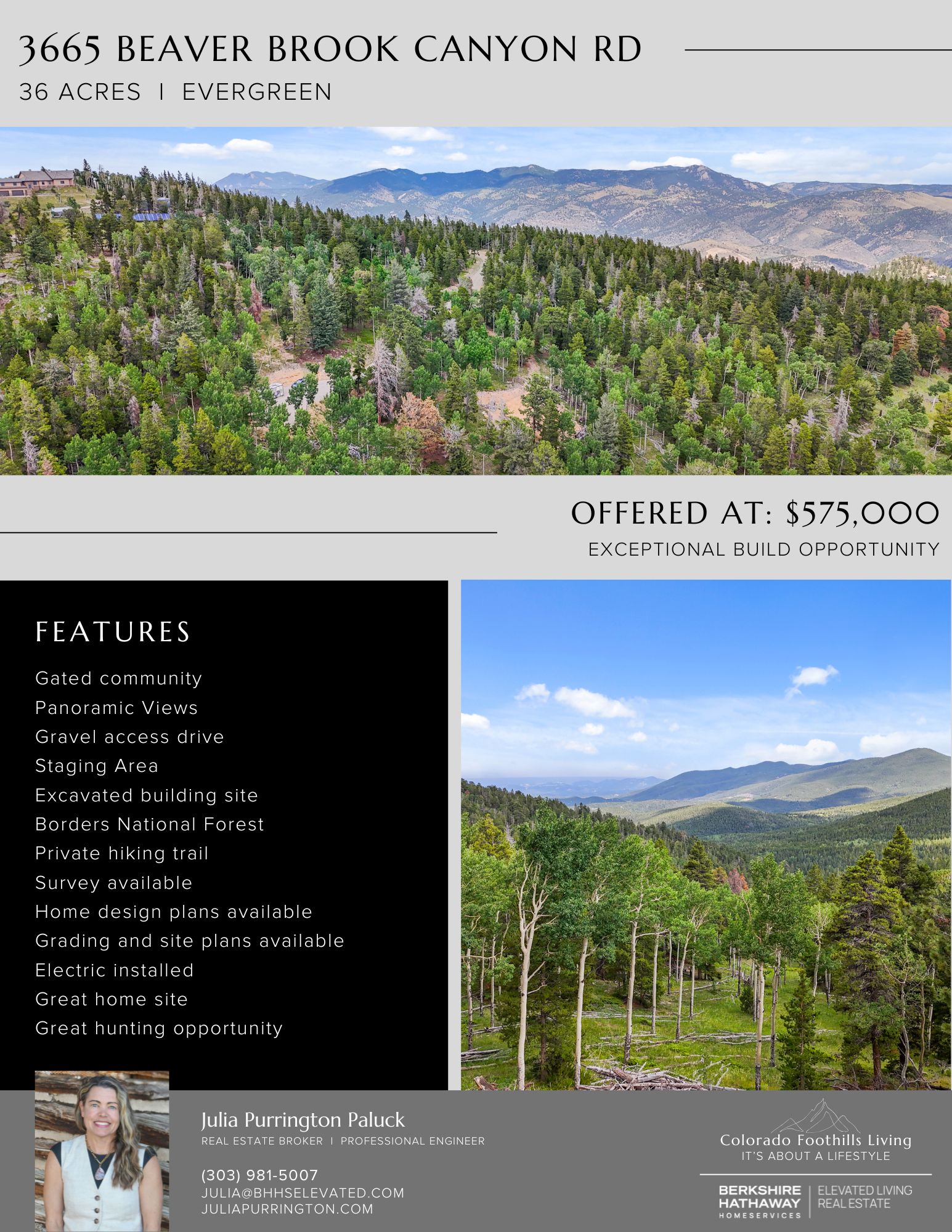 Discover an unparalleled opportunity at 3665 Beaver Brook Canyon Road in Evergreen, where tranquility and seclusion define this exceptional 36-acre building site. Nestled within an exclusive gated community, this property offers breathtaking panoramic views of the surrounding mountains framed by the landscape of lush aspen and pine forests, dramatic rock outcroppings, and serene flowing meadows. Just minutes from I-70, convenience meets seclusion in this idyllic setting.