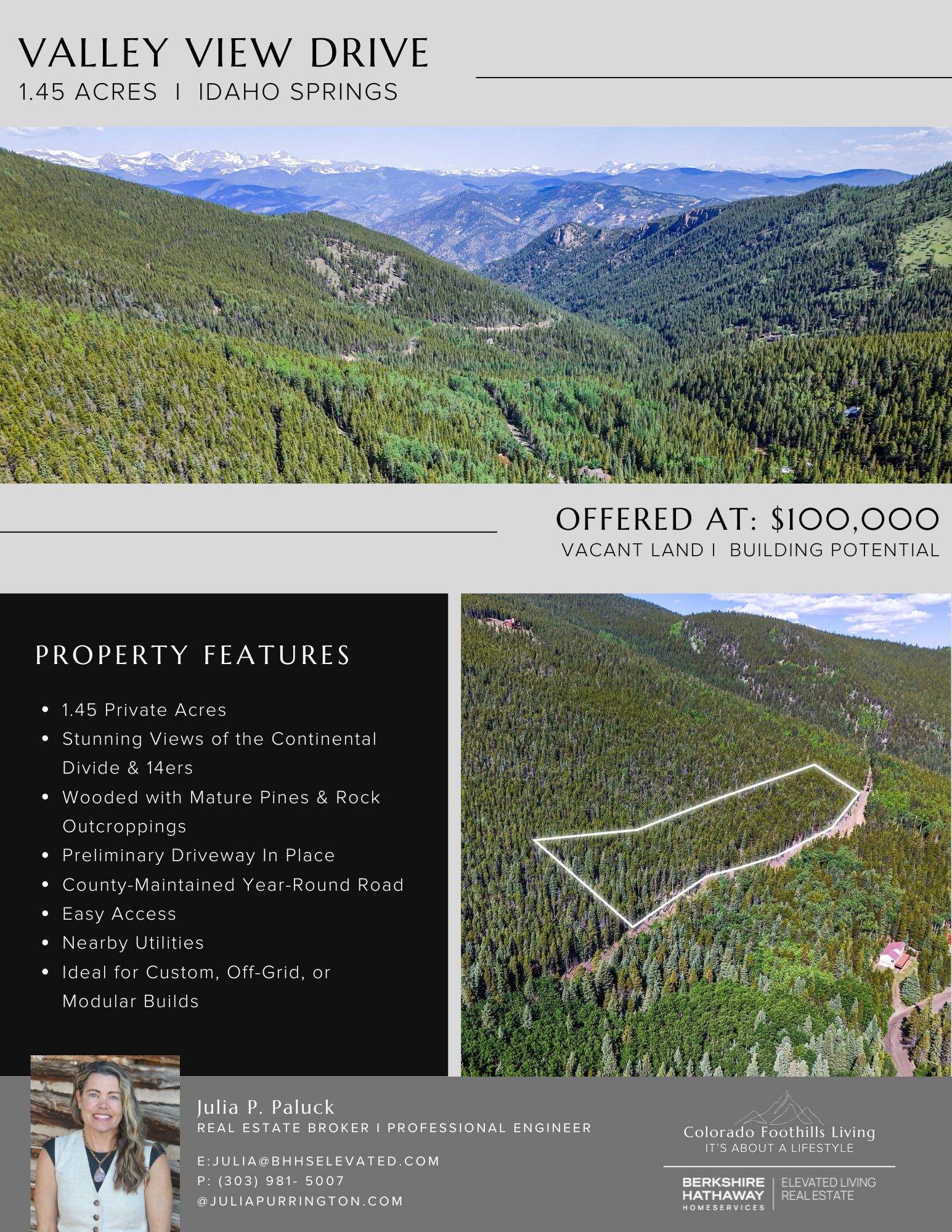 Build your dream mountain retreat on this private 1.45-acre parcel located on a county-maintained road in Clear Creek County. Nicely wooded with mature pines, granite outcroppings and dramatic views, this lot offers both privacy and ease of access with stunning views of the continental divide and several 14’ers. A preliminary driveway has already been cut in, providing easy access and helping you visualize the perfect building pad. Whether you’re planning a custom cabin, off-grid getaway or modular home, utilities are close by and the year-round road maintenance ensures reliable access in every season. Enjoy peaceful mornings sipping coffee to the sight of sunrises over rugged peaks and starlit nights in a virtually light-pollution-free sky. Priced to sell, this exceptional lot combines affordability with prime mountain living—your quiet Colorado retreat awaits.