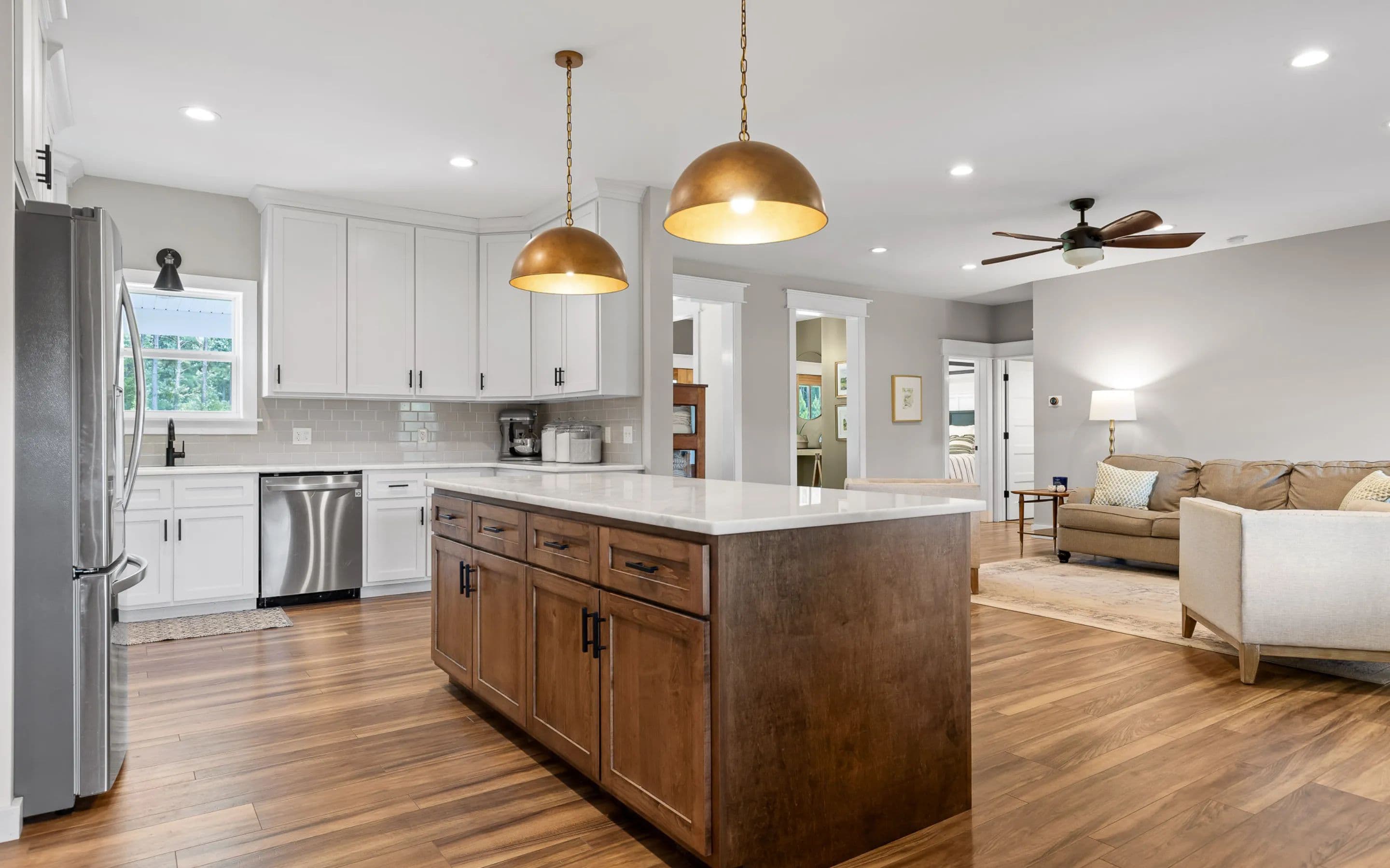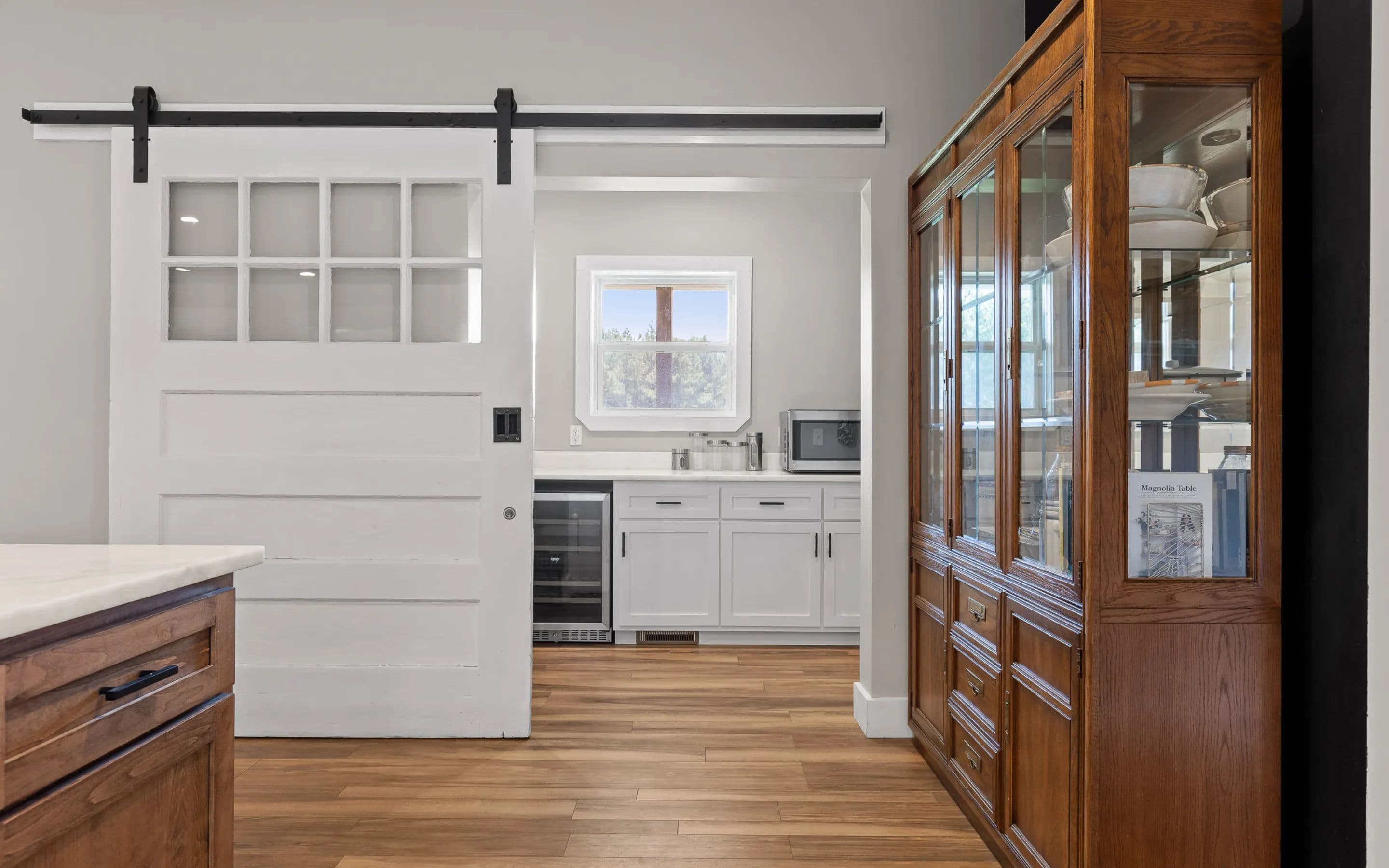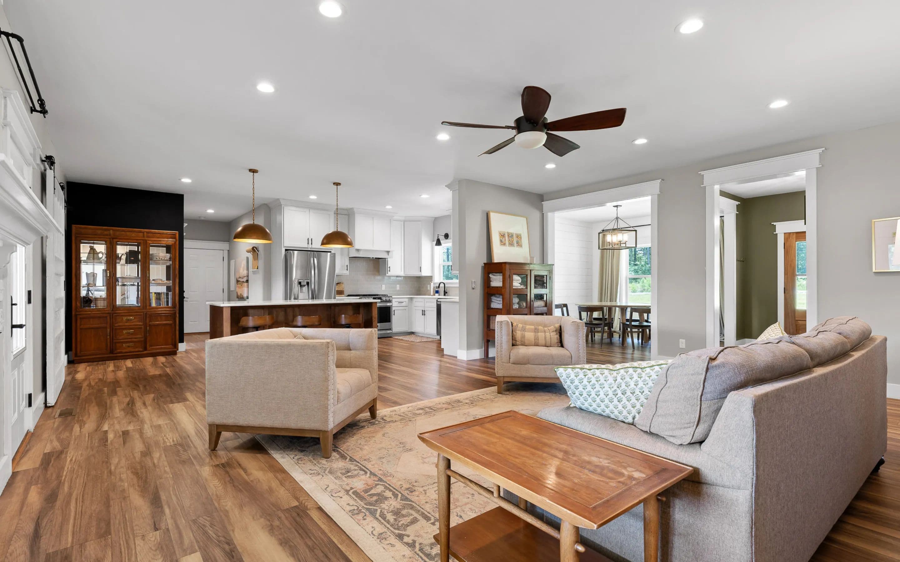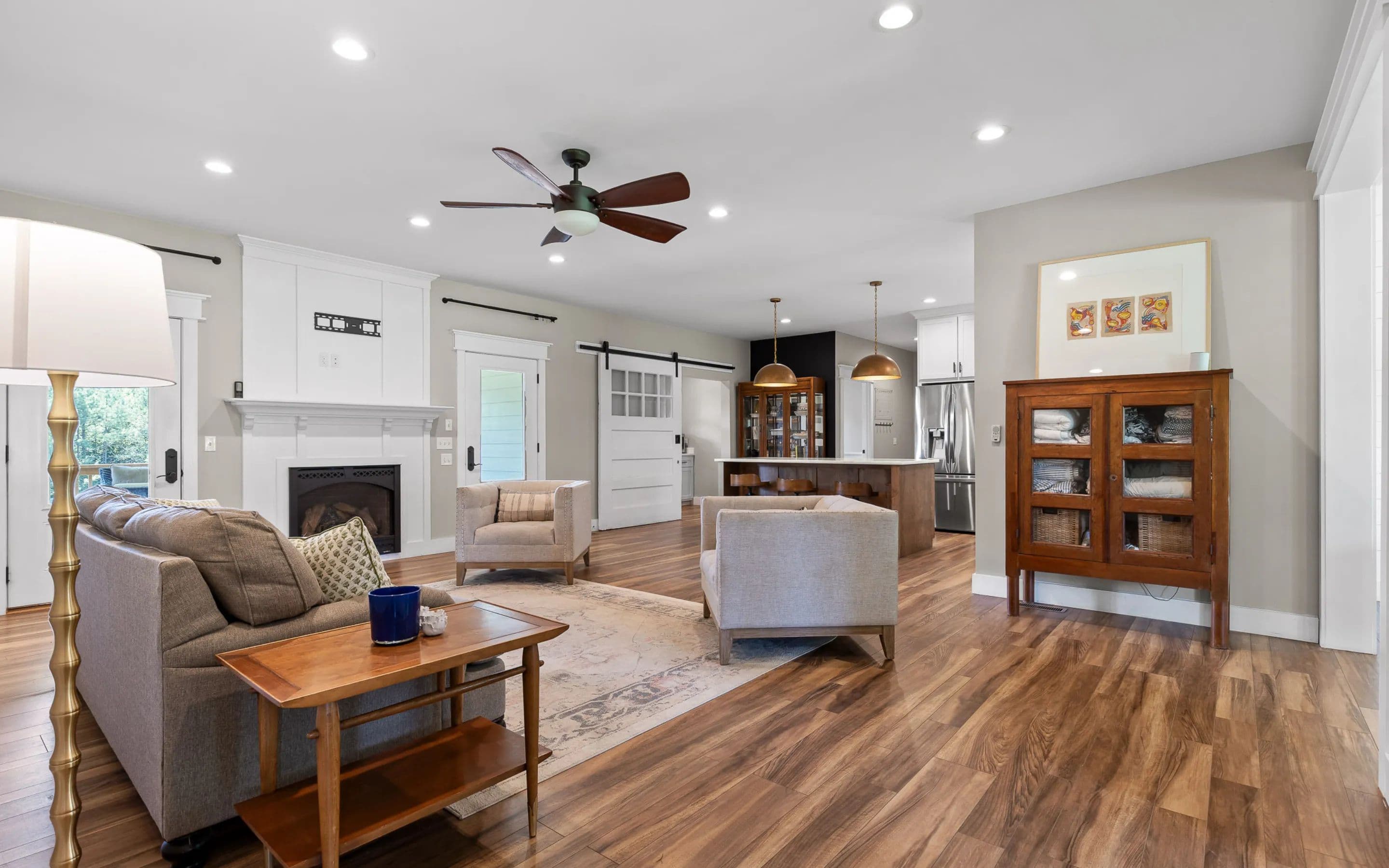 A covered front porch sets the tone for the warmth and elegance inside. The main level features hardwood floors, a fireplace, and open-concept kitchen with stainless appliances, white cabinetry, tile backsplash, and a grand center island. The walk-in pantry includes a sliding barn door, shelving, cabinetry, counter space, and natural light. The kitchen connects to the dining area and living room, which opens to a spacious deck, ideal for grilling, watching sports, or quiet evenings.