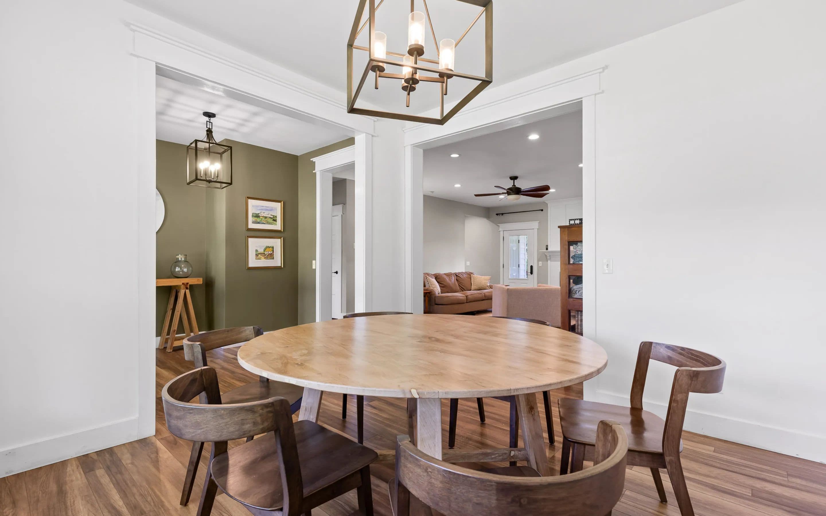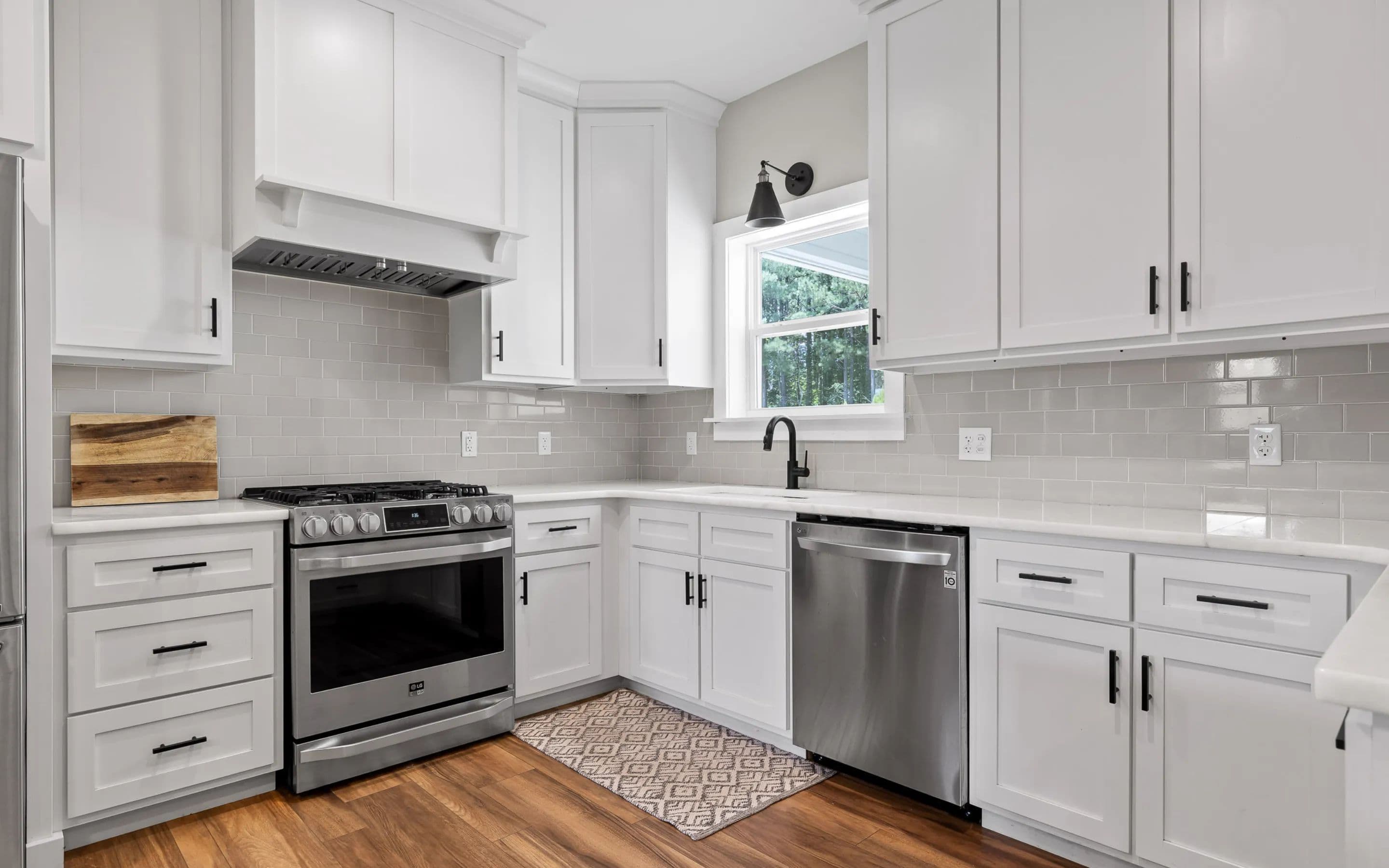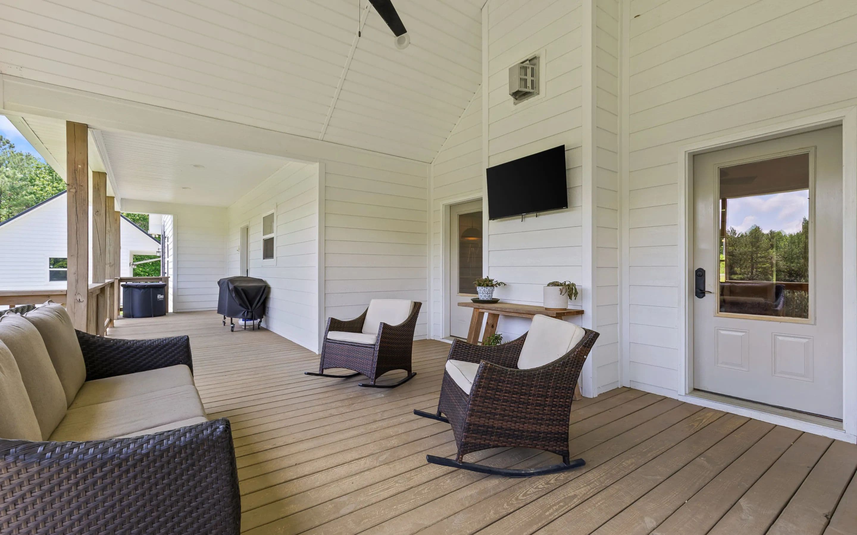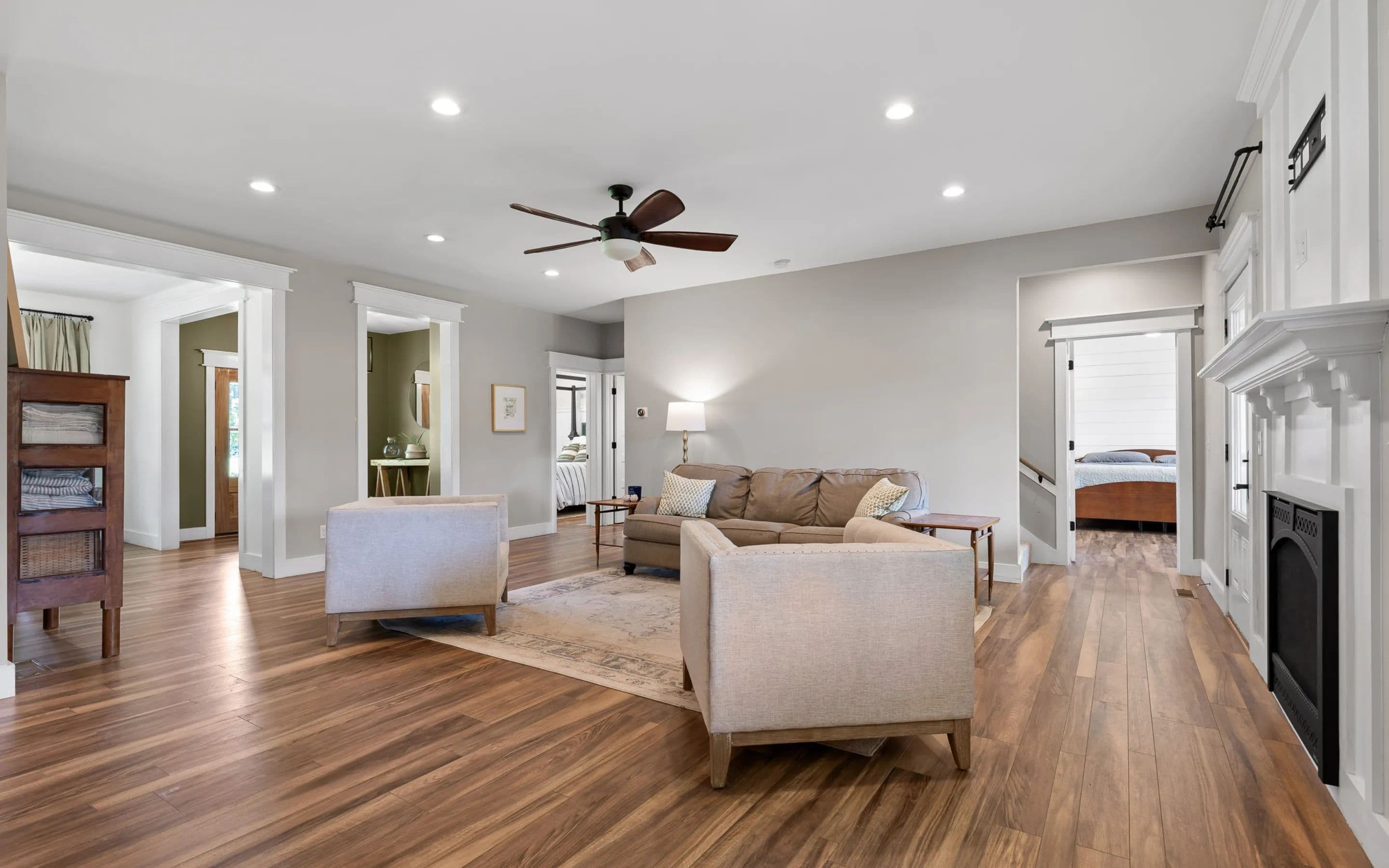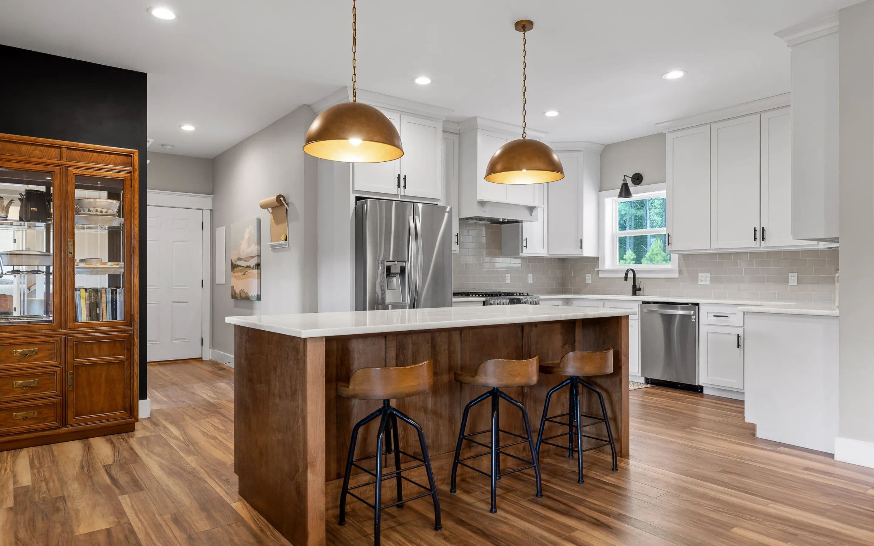 A covered front porch sets the tone for the warmth and elegance inside. The main level features hardwood floors, a fireplace, and open-concept kitchen with stainless appliances, white cabinetry, tile backsplash, and a grand center island. The walk-in pantry includes a sliding barn door, shelving, cabinetry, counter space, and natural light. The kitchen connects to the dining area and living room, which opens to a spacious deck, ideal for grilling, watching sports, or quiet evenings.