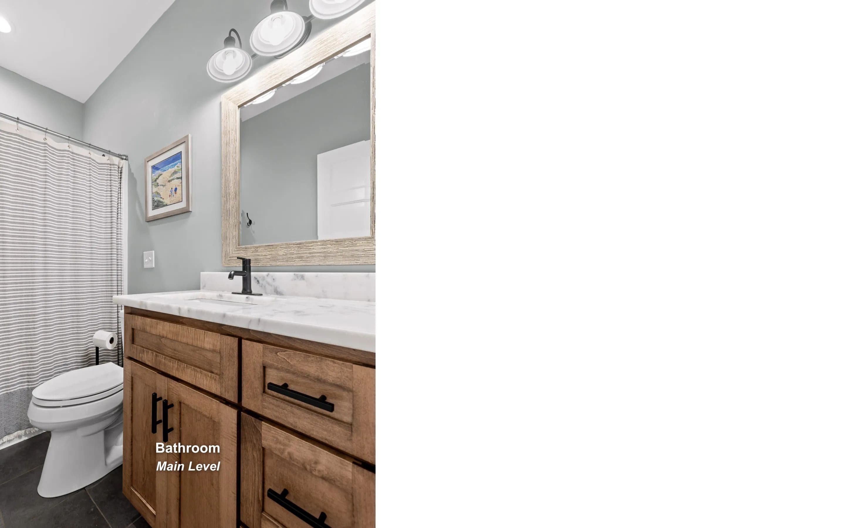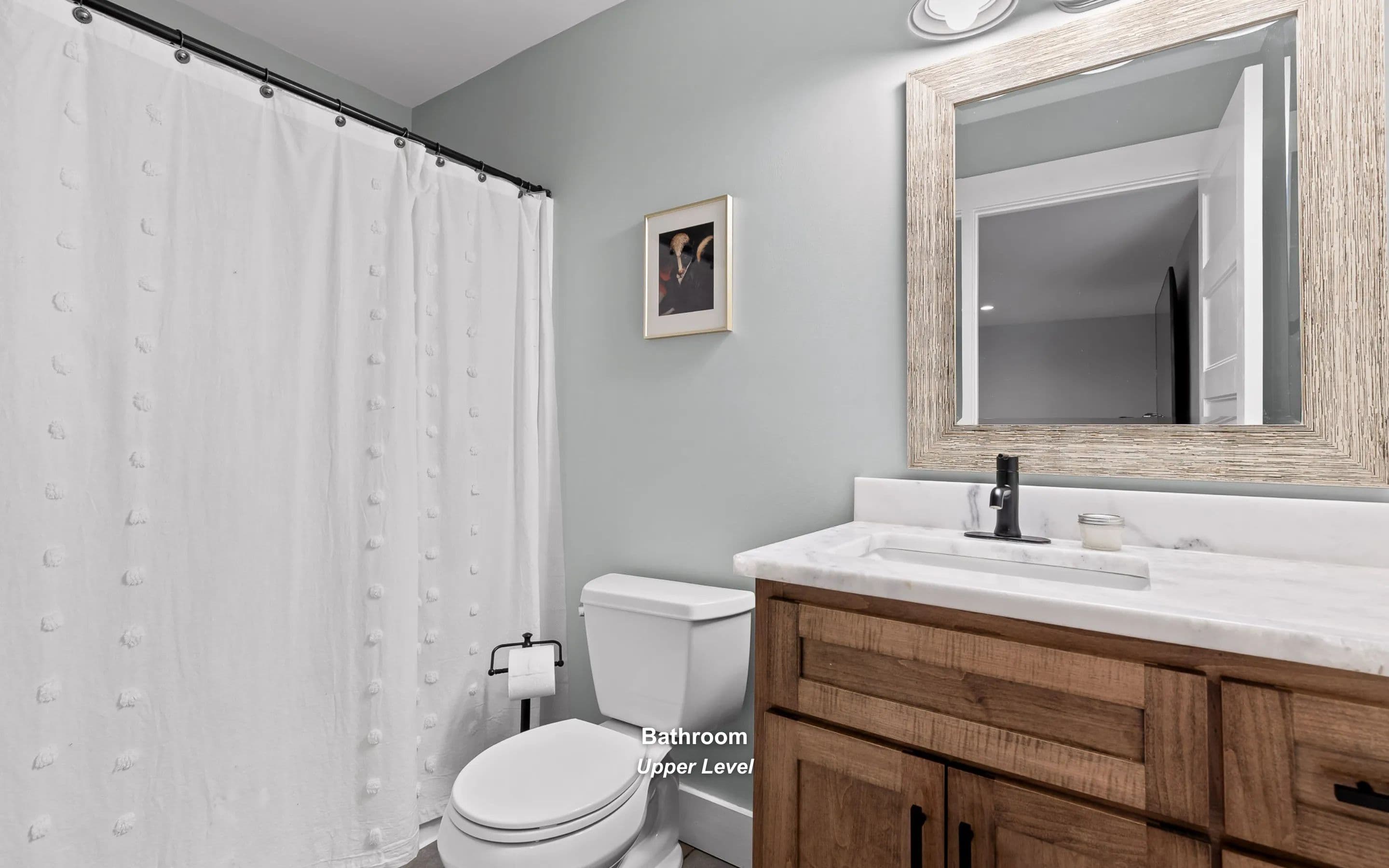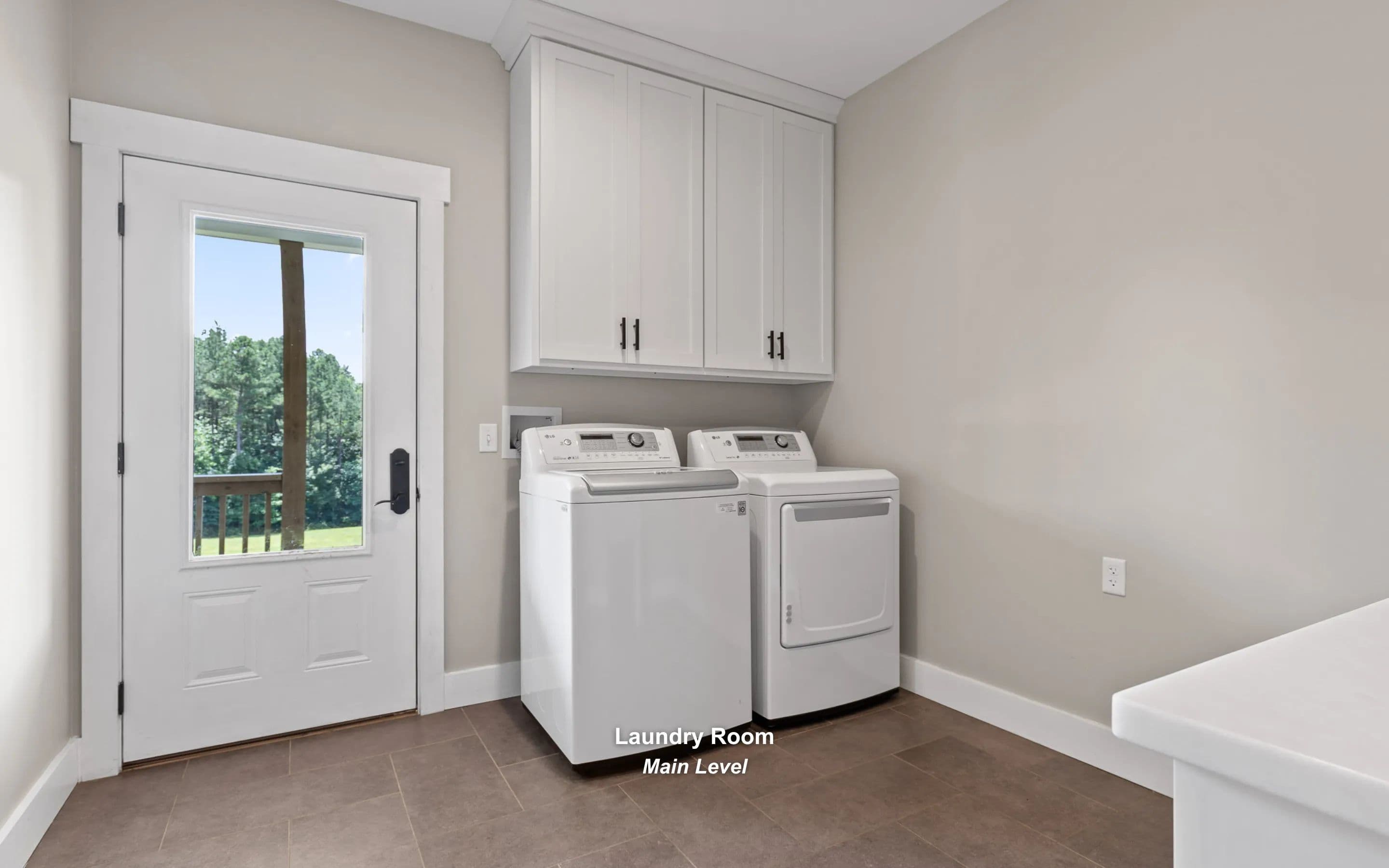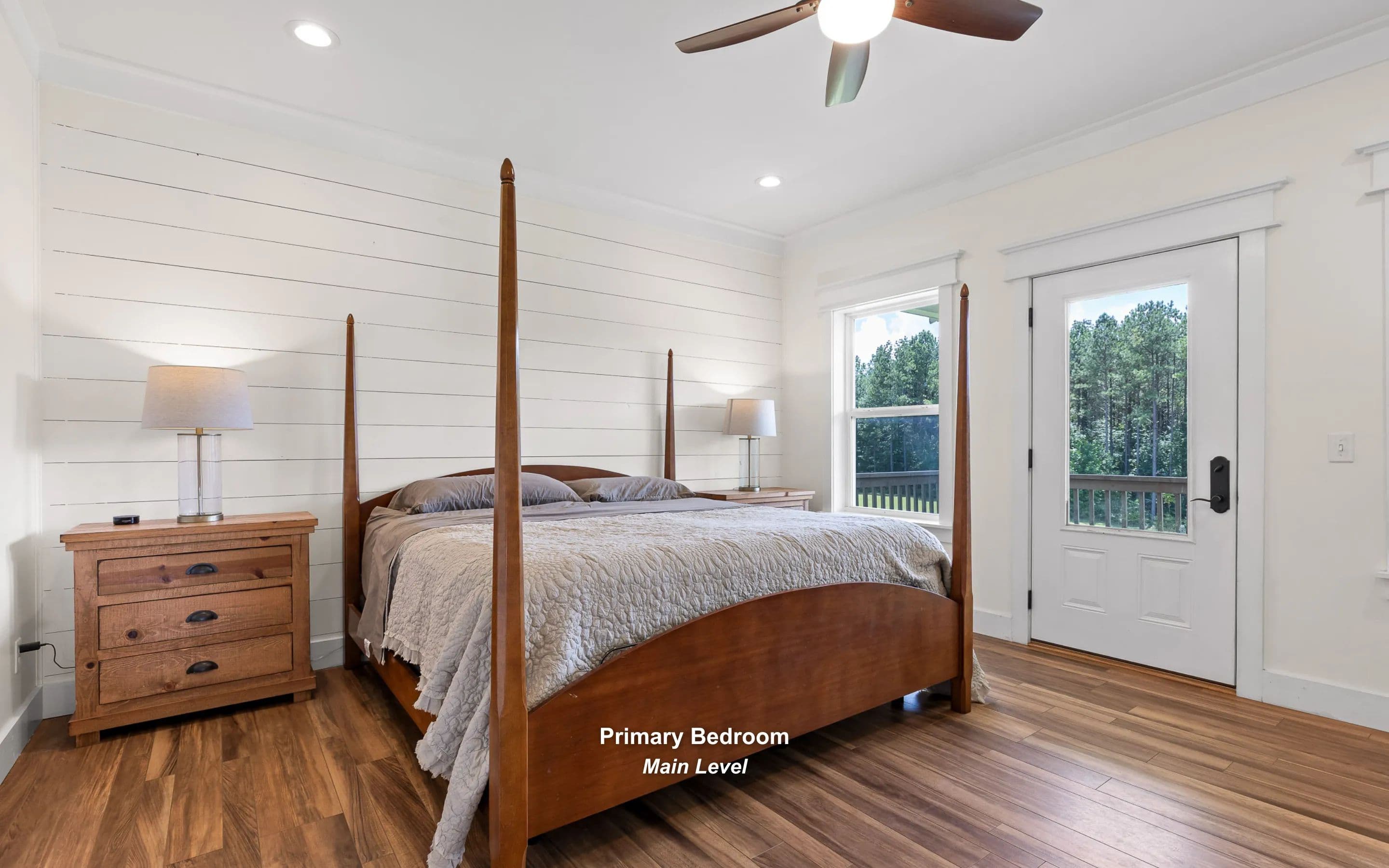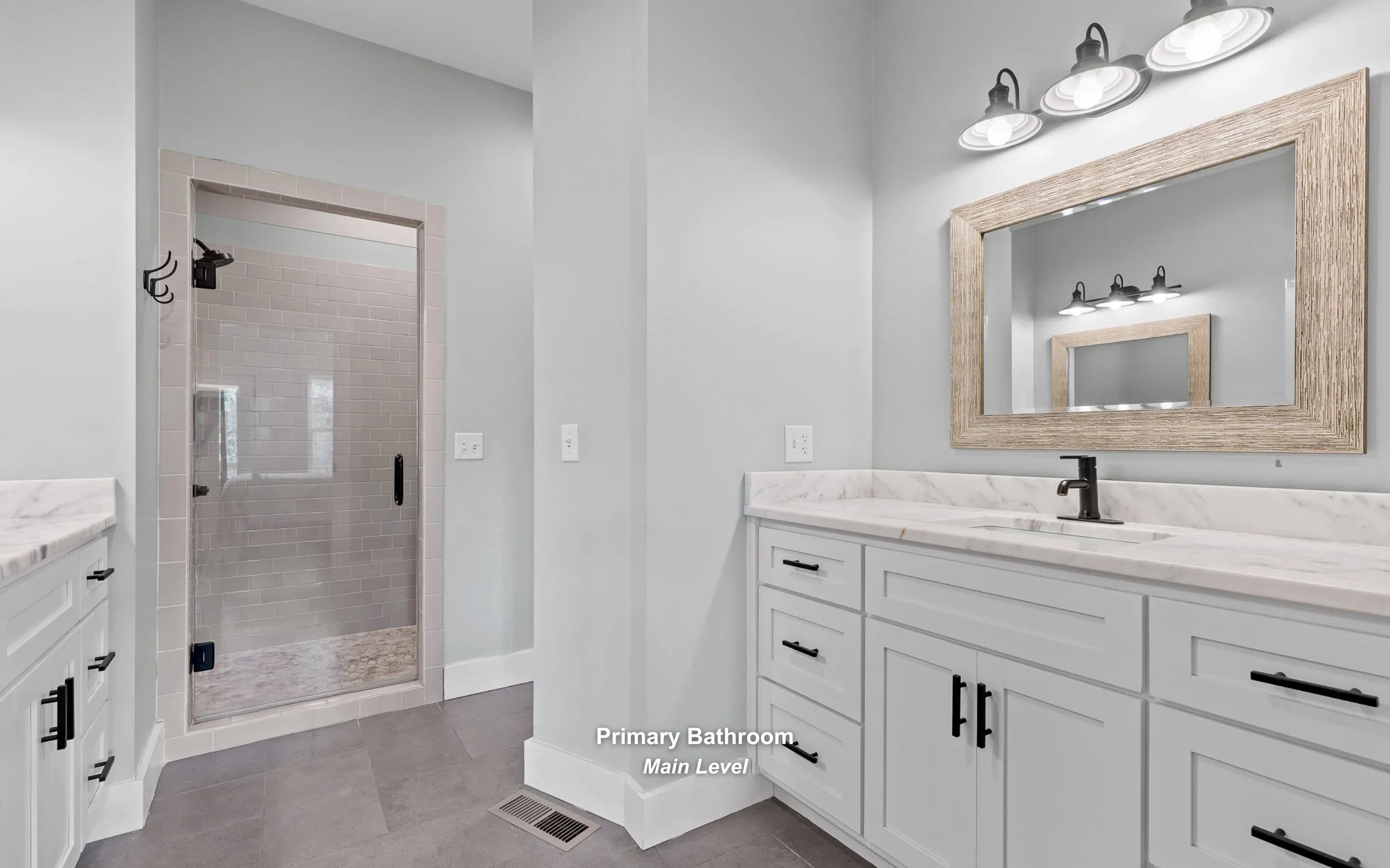 The main-level primary suite offers deck access and a luxurious en-suite with walk-in closets, dual vanities, and a tiled walk-in shower. Bedroom, full bath, and laundry room complete the main floor.