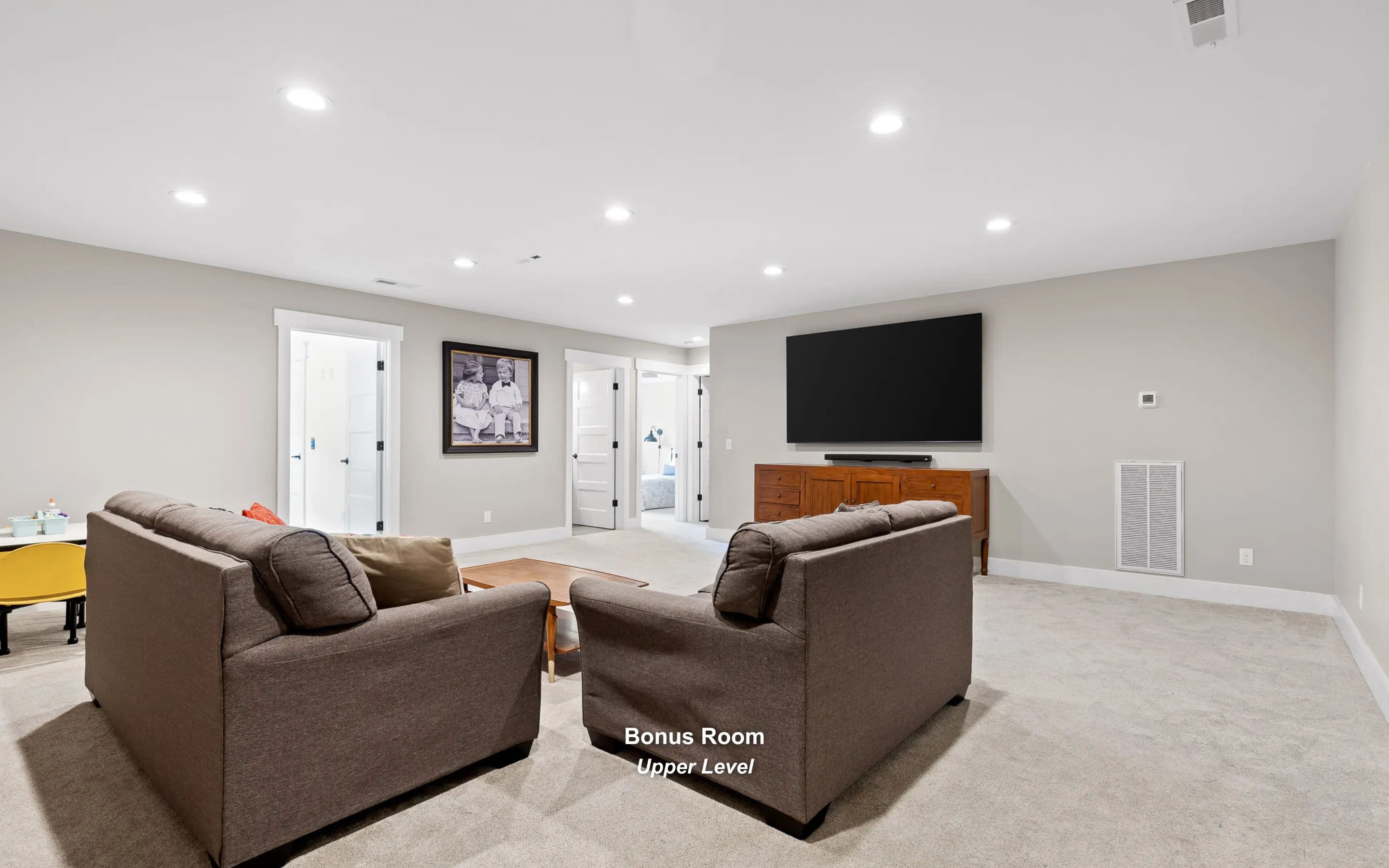 Upstairs: a large bonus room, two bedrooms, full bath, and home office. A detached finished garage provides space for creative projects, a workshop, or storage. The level yard is bordered by woodland for privacy.
