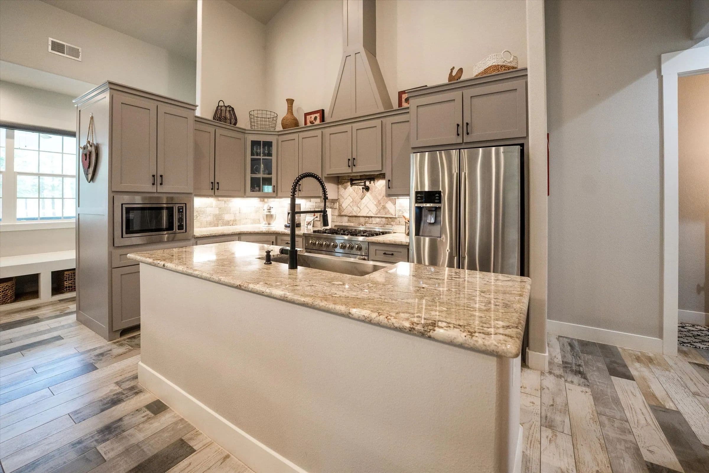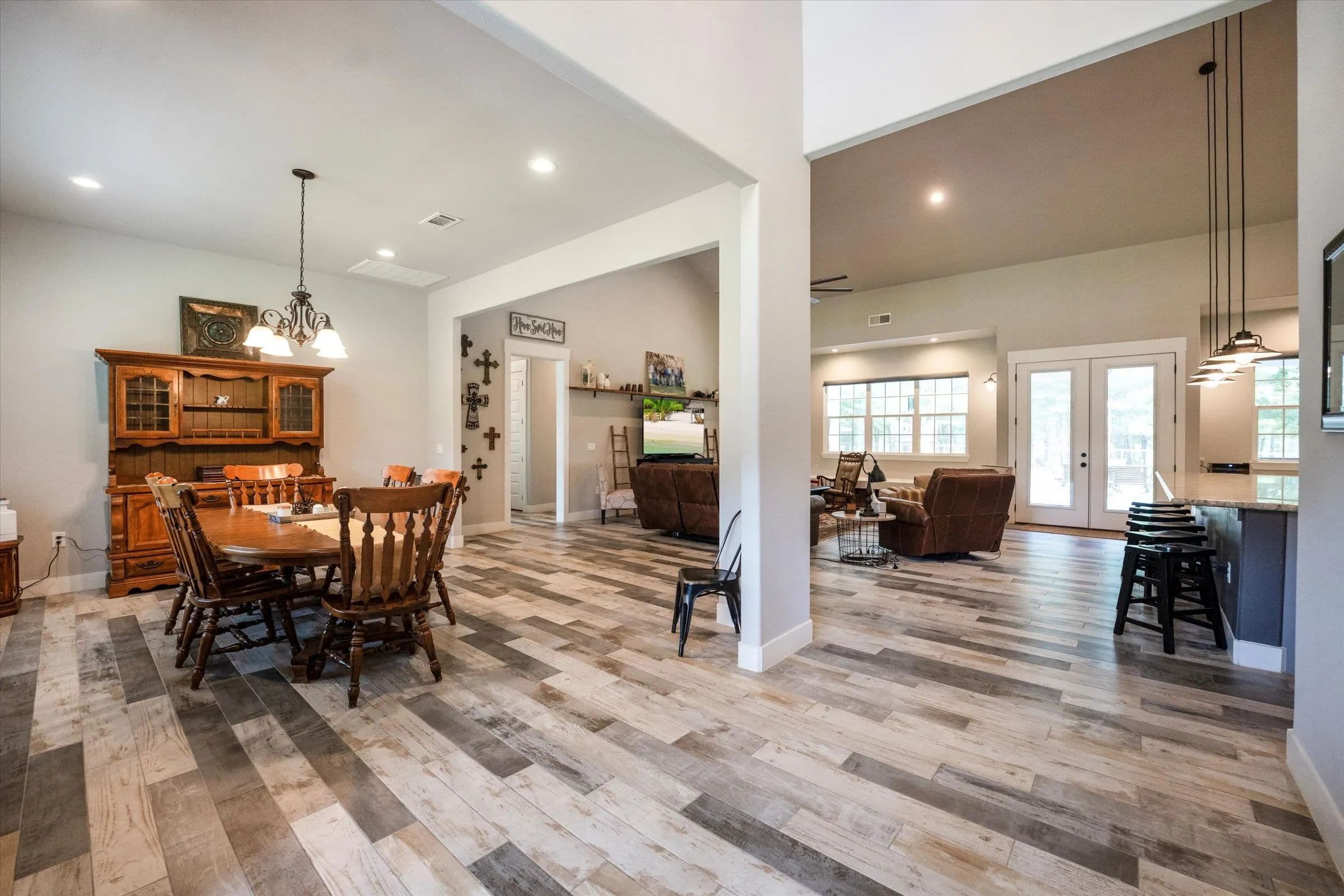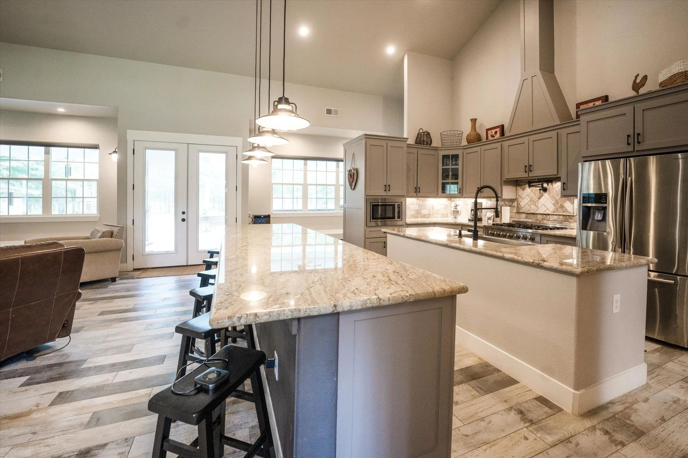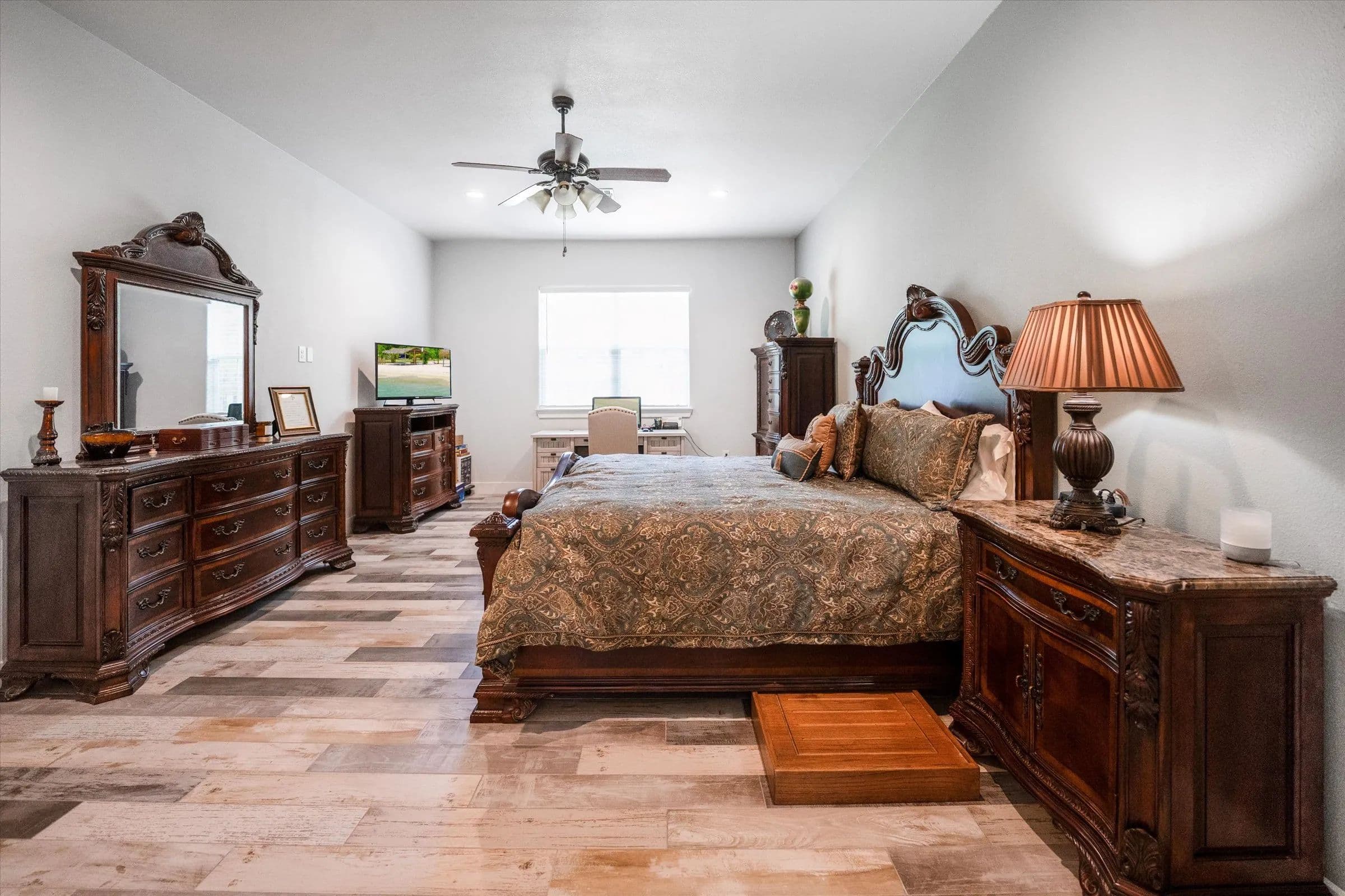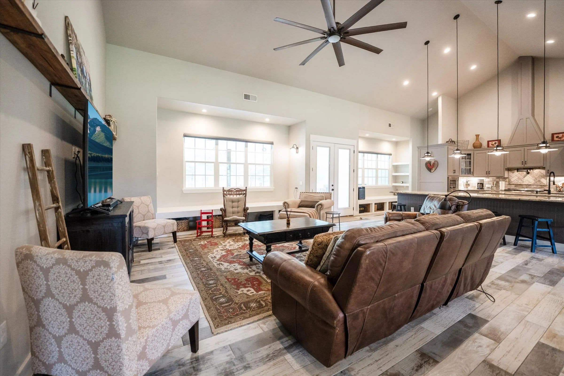 Escape to the charm of country living on this picturesque 5.71-acre homestead. Welcoming 17-foot soaring ceilings span the living and kitchen areas, paired with 8-foot doorways throughout for a light, expansive feel. The Chef’s island kitchen offers a farmhouse sink, a state-of-the-art Thor stove, and a walk-in pantry built for serious storage. A thoughtful layout connects the primary suite to utility and living areas for everyday ease. Enjoy peaceful mornings on the front and back porches, surrounded by trees and birdsong. A natural spring at the rear adds to the serenity, and fenced acreage suits gardening or livestock. Bonus features include an RV storage barn with hookup, tractor barn, deluxe “chicken hotel,” and a man cave/office with additional full bath off the garage. Wildlife and nearby horses complete the scene—just minutes from town, with peace, privacy, and timeless Texas charm.