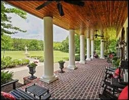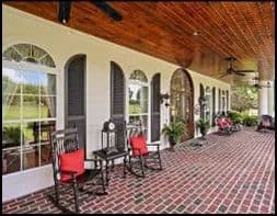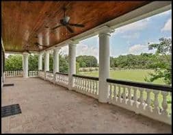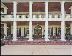 Architectural Grandeur: Classic red brick exterior with white trim and black shutters, arched windows framed by towering two-story columns and wraparound porches that exude timeless plantation style.