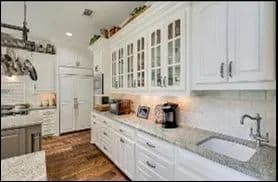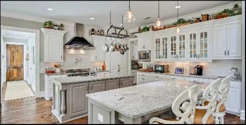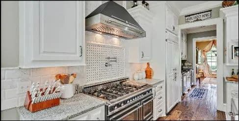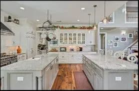 Gourmet Kitchen: A chef’s dream with dual Aspen white granite islands, Bertazzoni oven and gas range with vent a hood, a butler’s pantry between dining room and kitchen with a built-in bar complete with sink and ice maker.