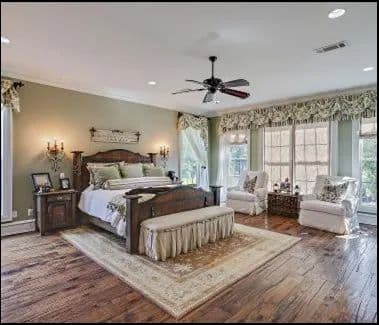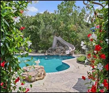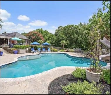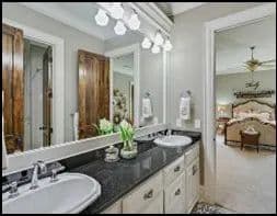 Primary Suite Retreat: Located on the main level, the owner’s suite overlooks the back acreage and resort-style pool. Spa-like bath with custom walk-in shower, soaking tub, dual vanities, and expansive his-and-her walk-in closets.