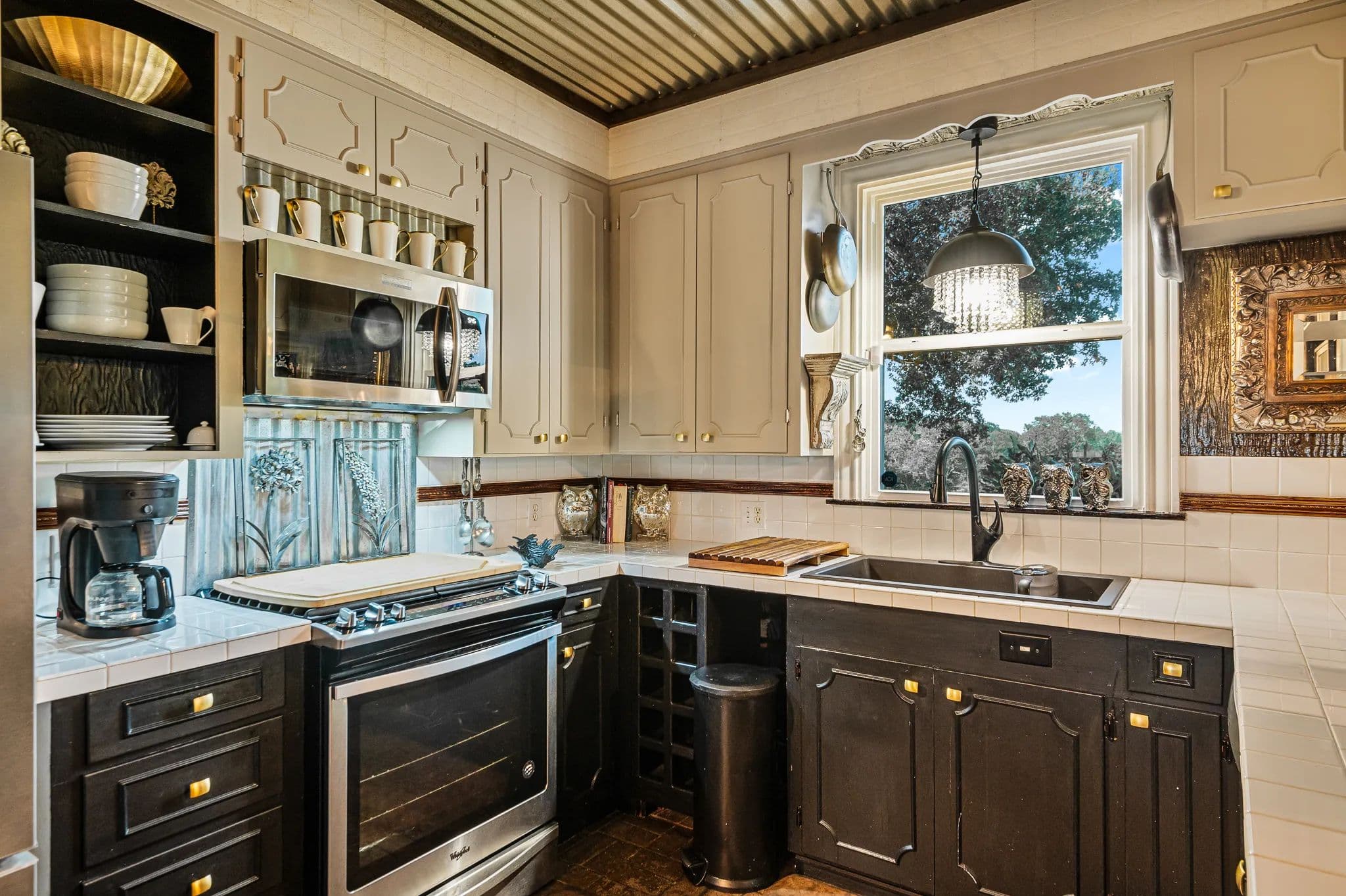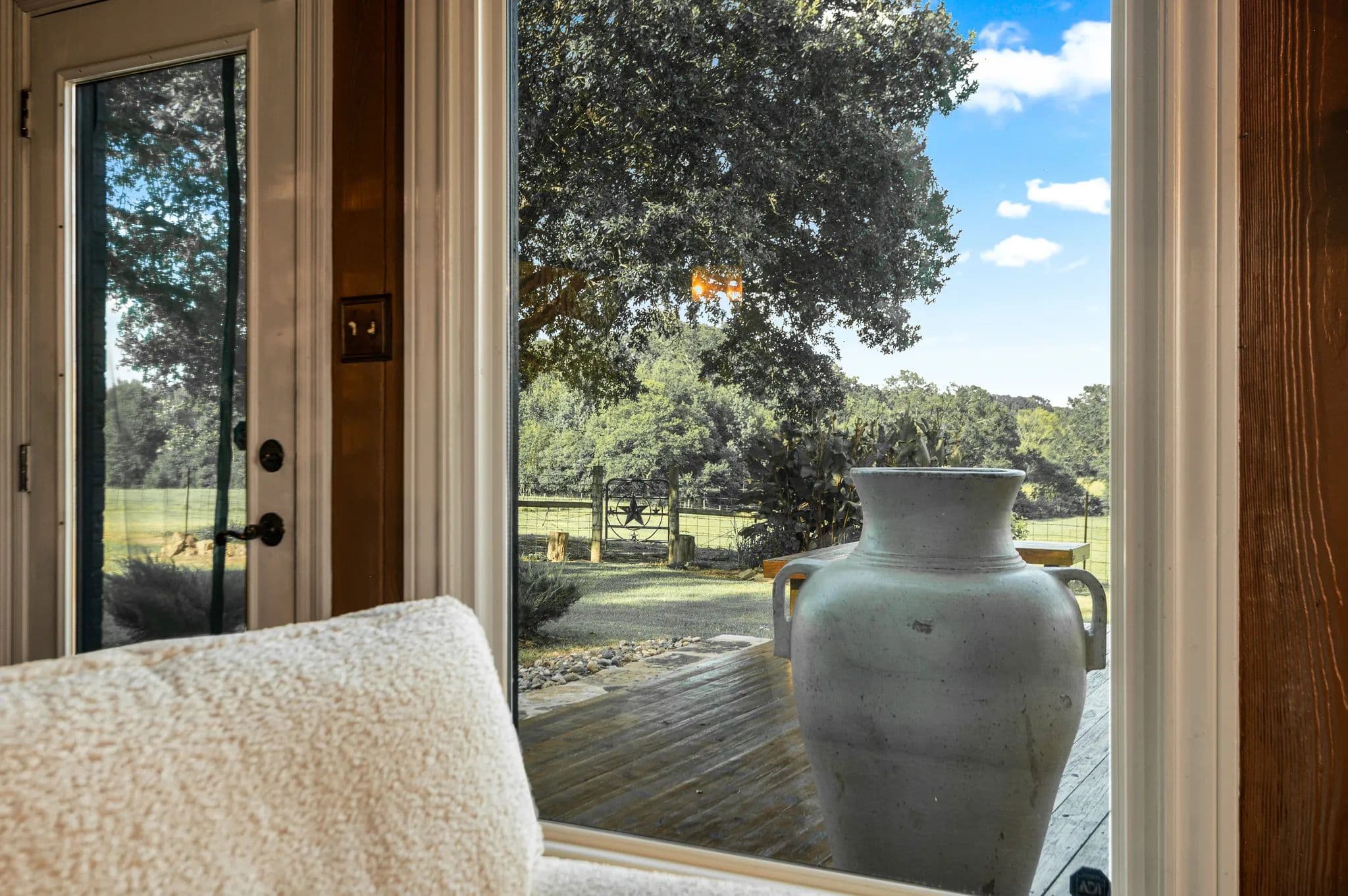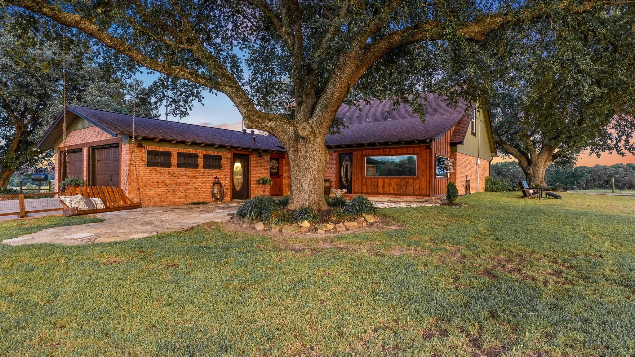 The property's crown jewel is a 3,186-square-foot, two-story ranch home, strategically positioned on a hilltop for commanding views of the entire operation. Surrounded by massive ancient oak trees, this residence combines cowboy luxe with modern comfort.