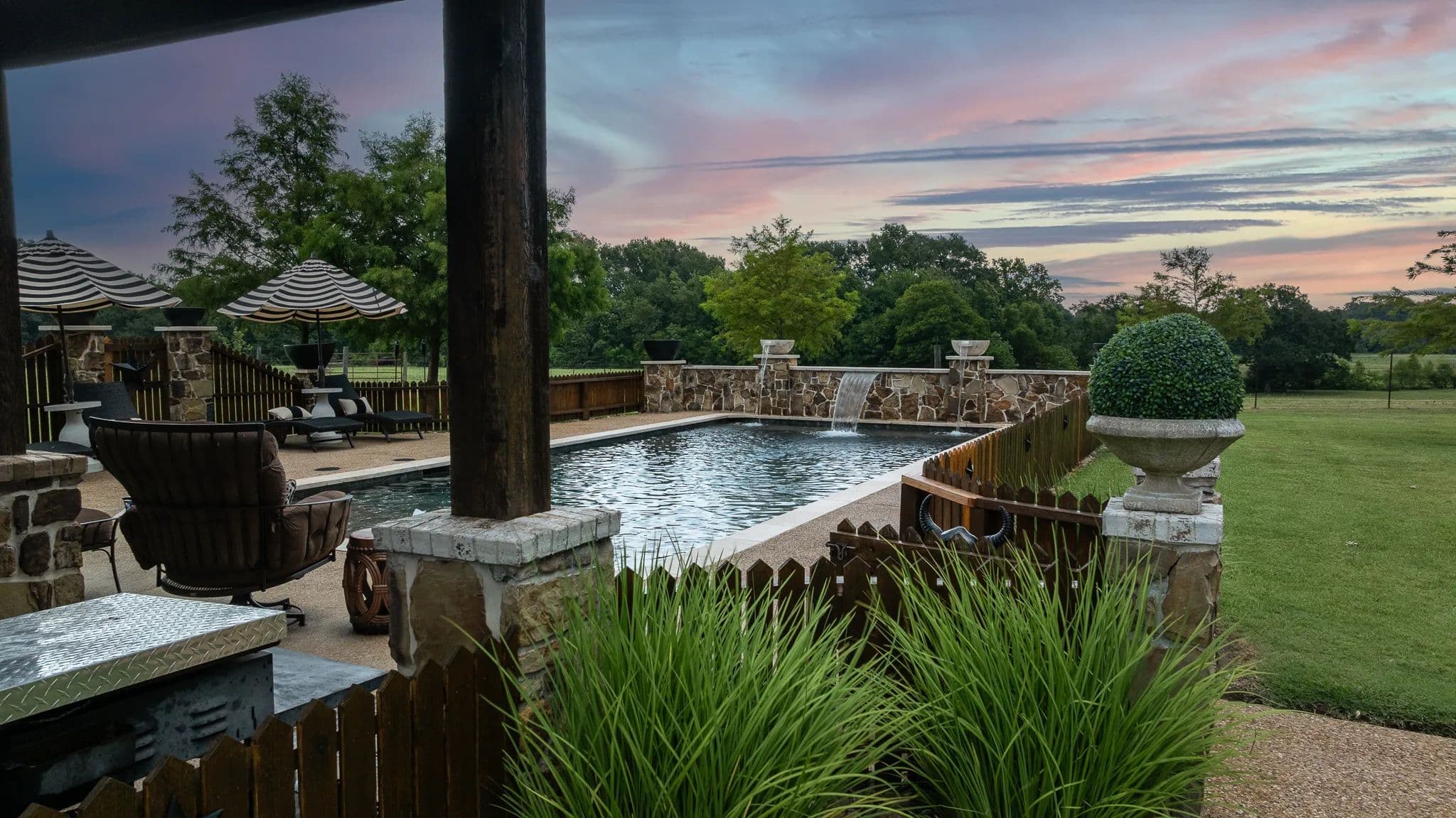 What sets Triple C Ranch apart is its spectacular outdoor entertainment area, which rivals that of high-end resorts. The centerpiece is a professional-grade gunite saltwater pool featuring flowing water features and beautiful underwater lighting that transforms evening entertainment into magical experiences. Adjacent to the pool, an elegant stone and rough cedar cabana provides the perfect setting for relaxation and hosting guests.
