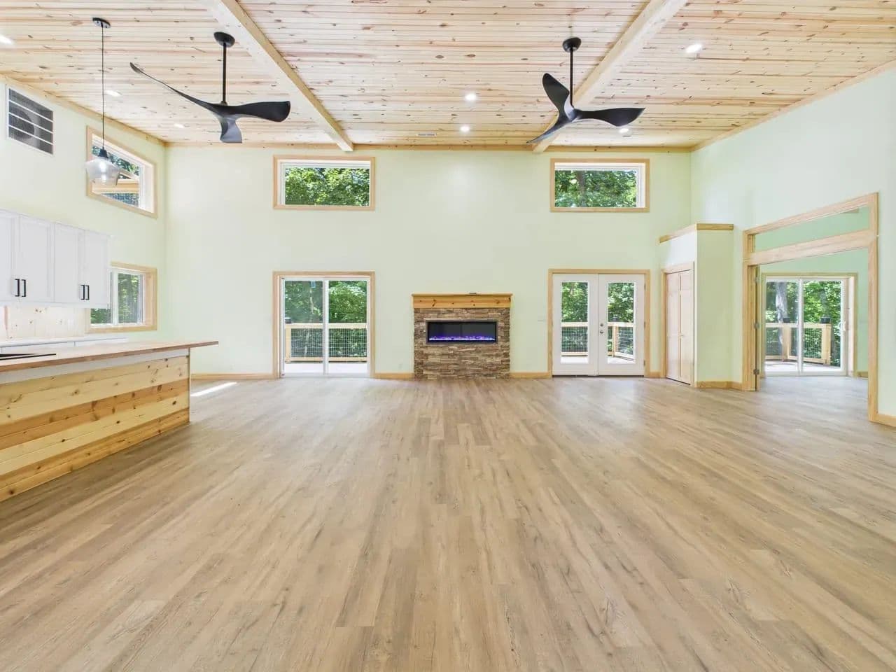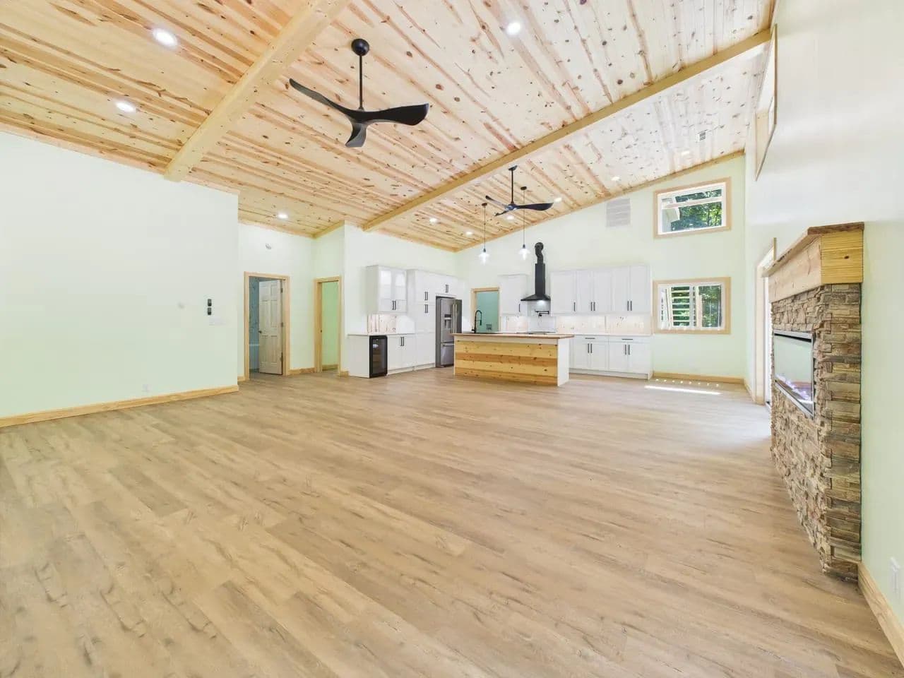 Eye-catching stone fireplace adds warmth and charm to the open living space