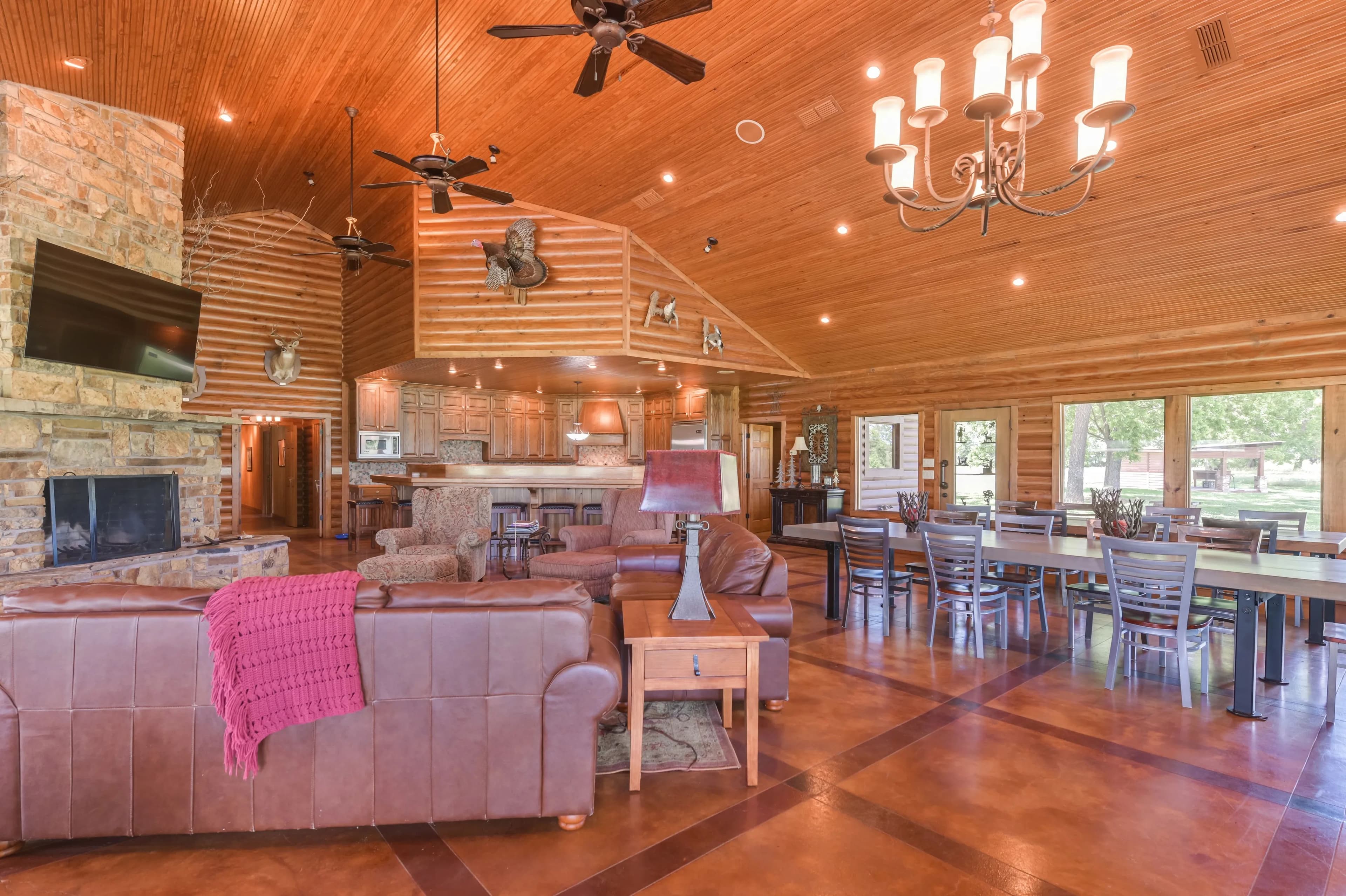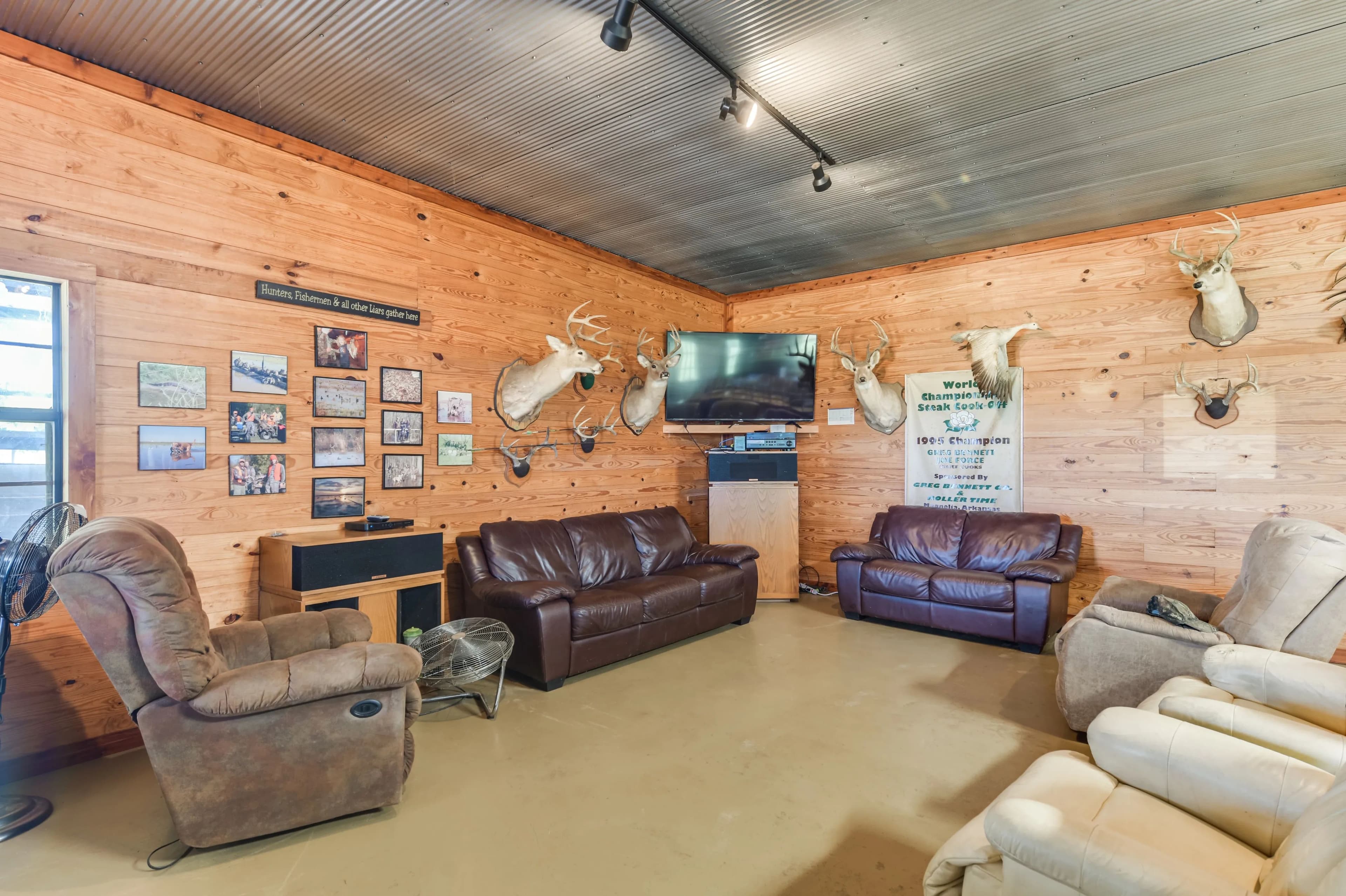 Another structure on the property, known as “the shop,” is ideal for cooking, grilling, and camaraderie. It includes a large open area for putting on waders in a heated building for cold mornings. Both the lodge and the shop are equipped with Starlink Internet, multiple TVs for entertainment, and a state-of-the-art Klipsch sound system. The shop also has a fire pit that doubles as a grill, perfect for morning breakfasts. A third structure includes a large shop and covered equipment shed, both heated for comfort before cold morning hunts.