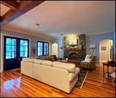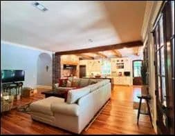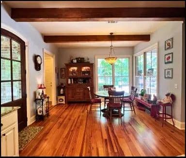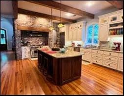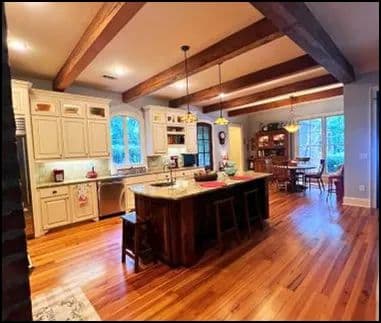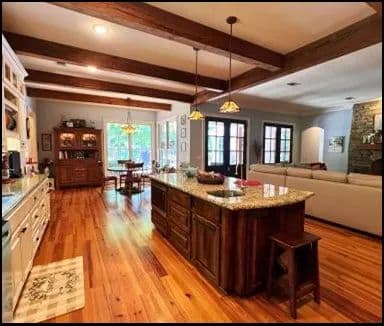 As you enter this beautiful 3,825 square foot home, to your left is the formal dining room, which offers the perfect space for entertaining. Straight ahead, the house opens into a large and inviting living area. At the heart of the home is a chef's dream kitchen—a true masterpiece featuring solid wood beams that add warmth and architectural charm. High-end appliances include a professional Wolf range, Wolf microwave, Sub-Zero refrigerator, and an oversized island topped with granite countertops. The island also features a prep sink for added convenience. A butler's pantry and an extra-large walk-in pantry are located just off the kitchen, offering additional storage and easy access to the formal dining space.