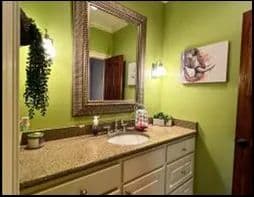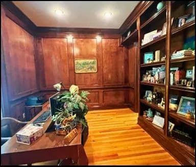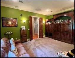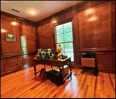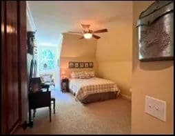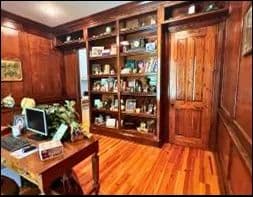 On the opposite wing of the home, you'll find a spacious bedroom, a dedicated sewing room, a half bath, and an oversized office with built-in shelving and a large storage closet. Upstairs, two generously sized, carpeted bedrooms share a full bath, making them ideal for guests or family.