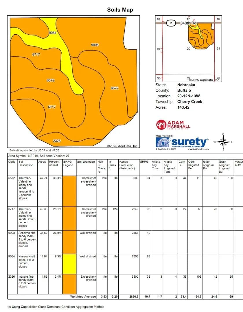 Here is a productive pivot irrigated farm for sale next to Highway 2, just 6 miles east of Ravenna, Nebraska. It has 151.42 (to be determined by survey in northeast corner). It features two pivot sprinklers. Soils mostly consist of Thurman-Valentine loamy fine sand and Anselmo loamy fine sand. The main pivot is 7 tower powered by a natural gas Origin powerunit and the corner pivot is T&L 4 tower which is powered by electricity.