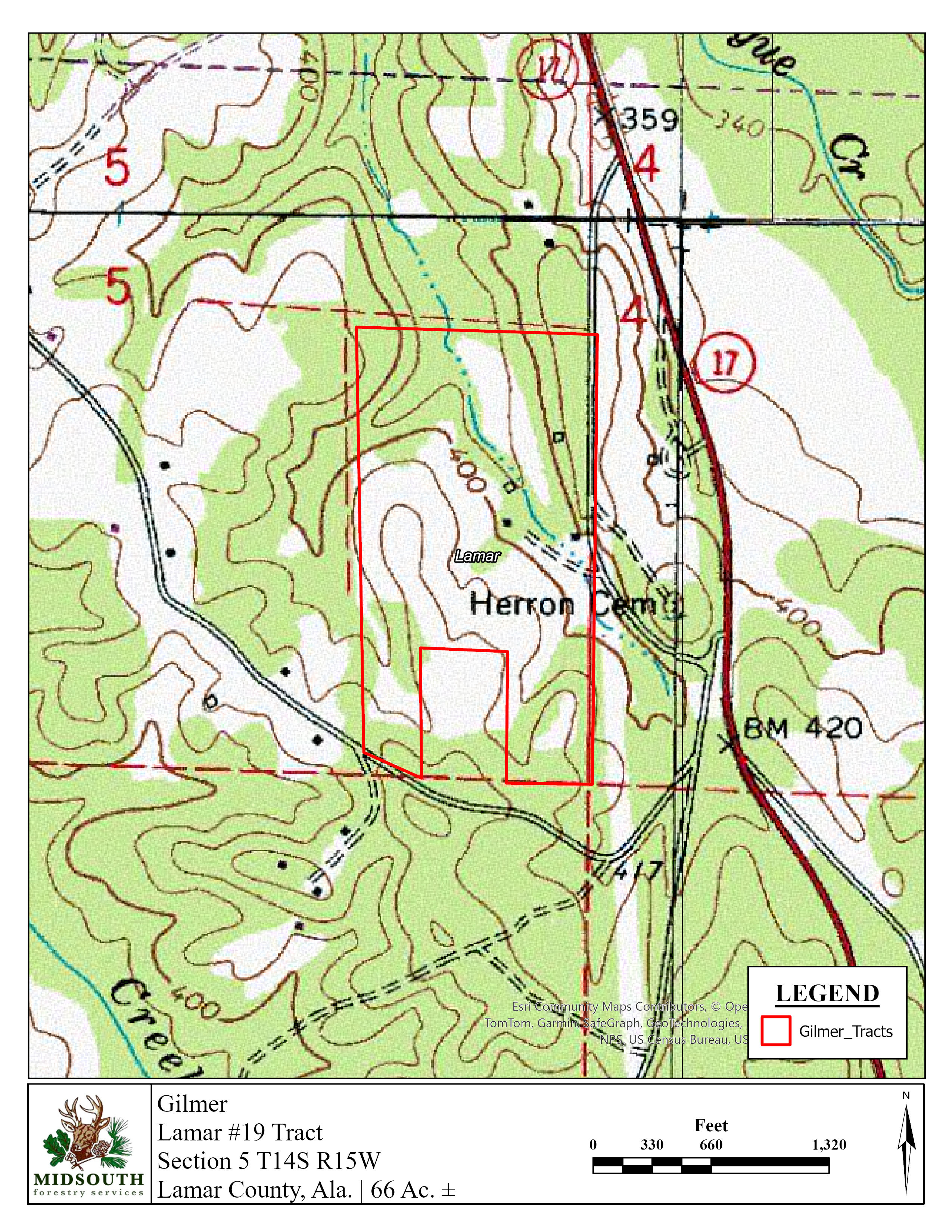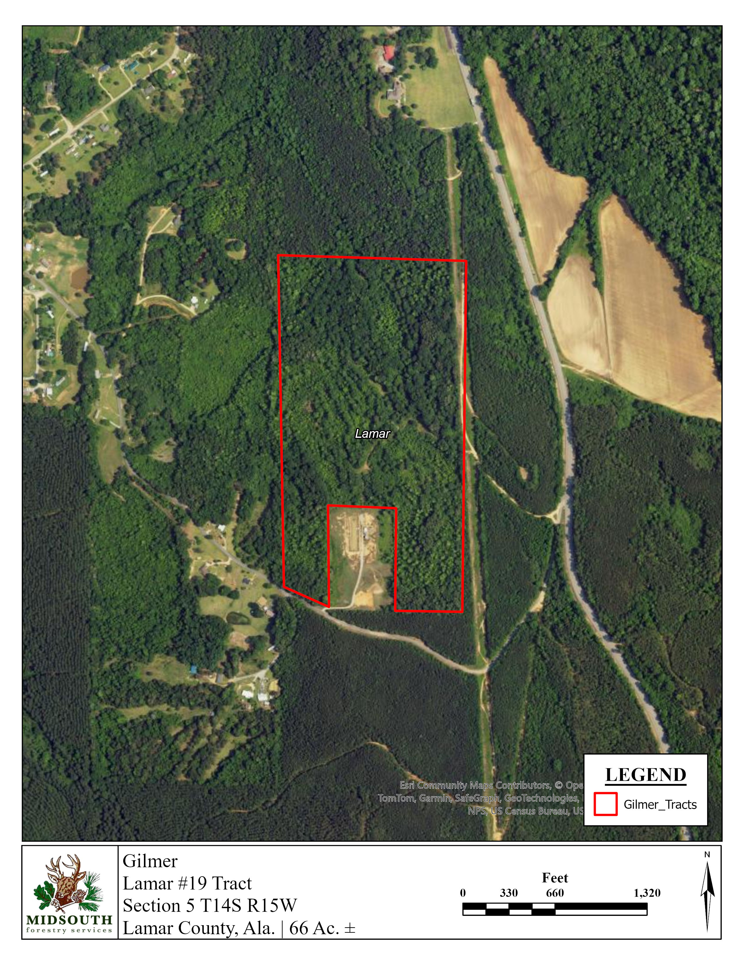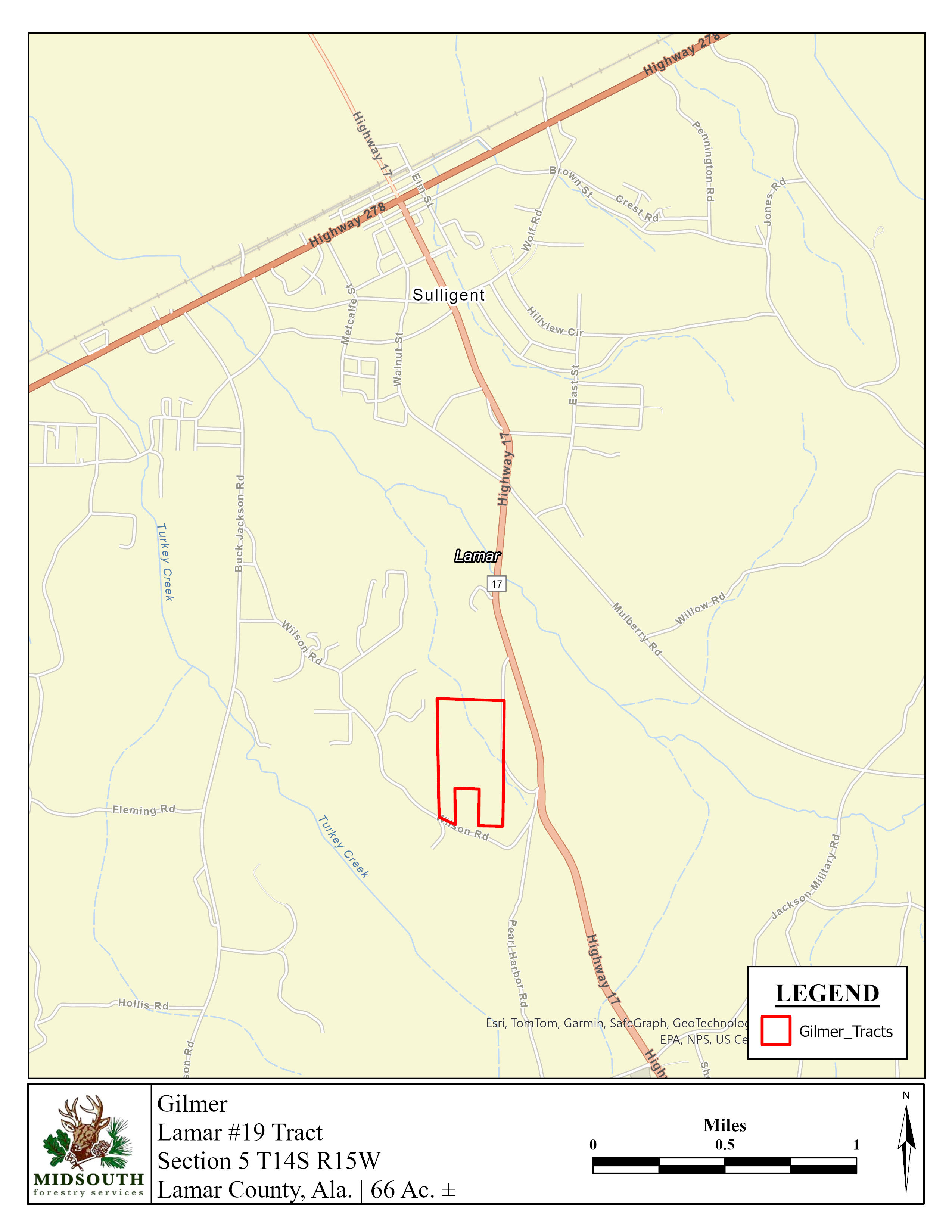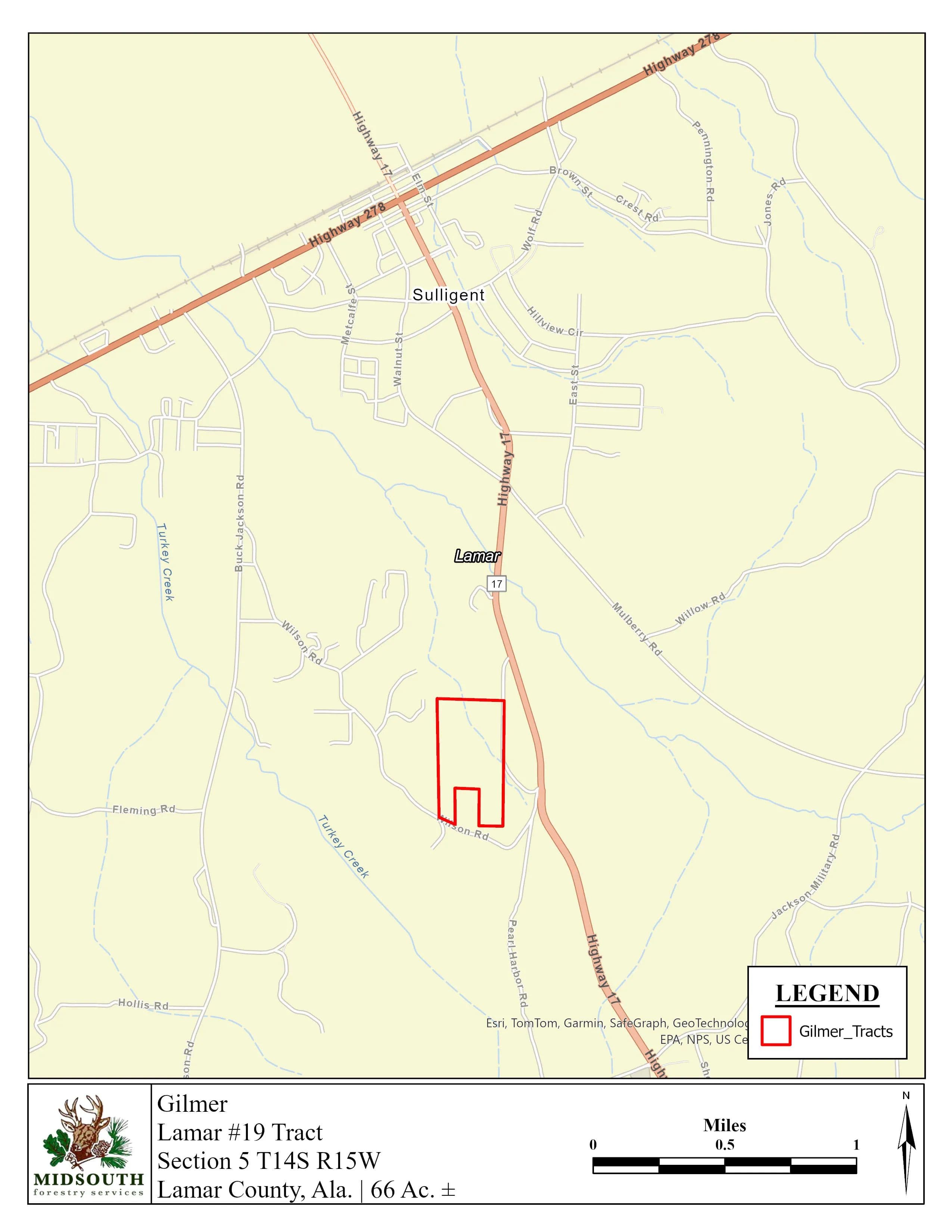 Discover 66± acres of prime timberland in Lamar County, Alabama with frontage on Wilson Road and Weeping Road, within the city limits and just 2.3 miles from Sulligent, AL, and 9.2 miles from Vernon, AL. This versatile property features merchantable mixed pine and hardwood timber, offering immediate value and long-term investment potential. With power and water nearby, the tract is well-suited for residential development or a private getaway. Its natural landscape makes it ideal for hunting and recreation, attracting wildlife and outdoor enthusiasts alike. Whether you're looking for a timber investment, a peaceful retreat, or a future homesite, this property offers an excellent opportunity in a convenient location. Don’t miss the chance to own a piece of Alabama’s timber-rich countryside.