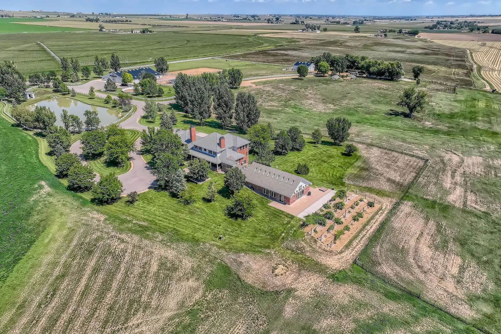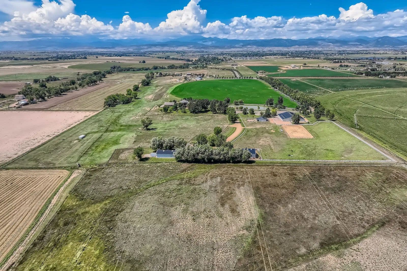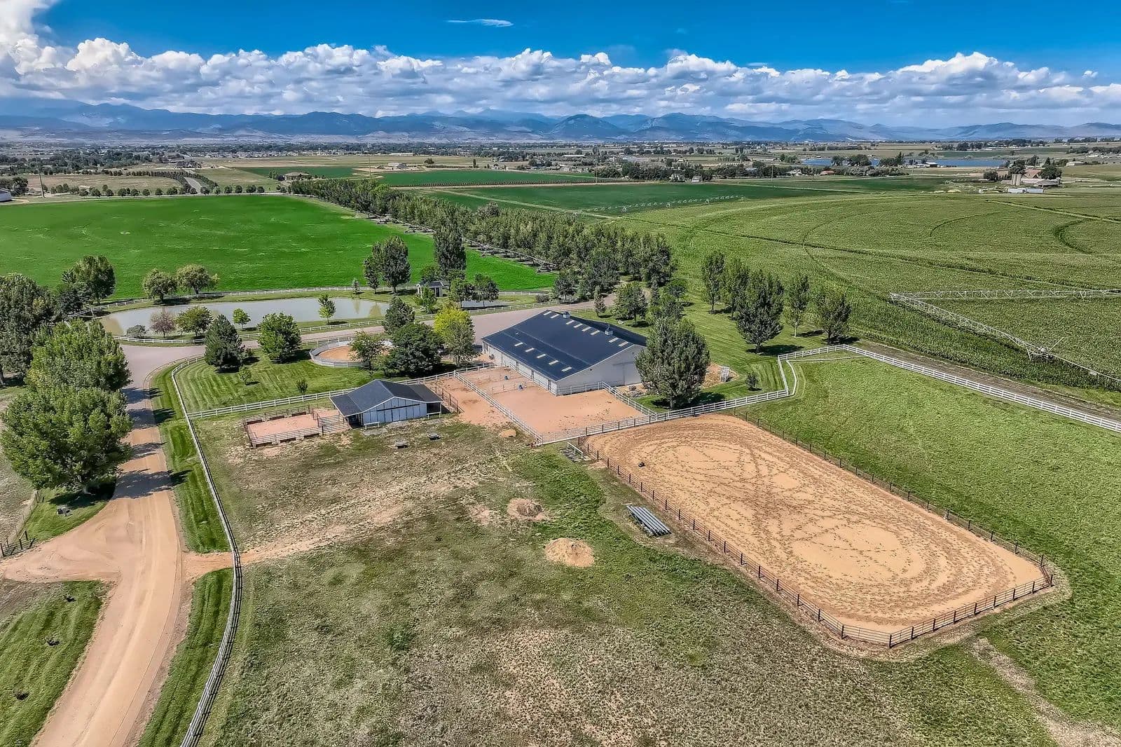 Refined Country Living near Berthoud, Colorado. Welcome to a rare equestrian paradise where luxury and wide-open freedom unite. Spanning 75 acres of pristine countryside, this extraordinary ranch estate is designed for both world-class horse enthusiasts and lovers of refined rural living. A tree-lined driveway leads you to the heart of the property; a stately colonial residence, blending rustic elegance with modern comfort. Soaring ceilings, reclaimed wood floors, walls of glass framing panoramic views and hand-selected natural materials and custom finishes create a warm, elevated aesthetic in this multi storied home. Multiple fireplaces, a chef's kitchen, and spacious entertaining areas invite gatherings both intimate and grand. Where evenings begin and stories unfold - the custom-built bar is a showpiece of Western elegance, wrapped in rich detailed wood carvings and just steps away, a wine room cradles your private collection. Each of the home's three spacious bedrooms is a retreat, showcasing warm wood tones, serene views of the surrounding landscape and handcrafted details in each of the private bathrooms. Thoughtful design and luxury converge to create restful spaces that feel both timeless and inviting. For the equestrian, the ranch features a fully equipped state-of-the-art barn with oversized stalls, tack rooms, grooming stations, and a professional-grade riding arena. With the Rocky Mountains just a few miles away, the possibilities for riding and exploration are endless Additional highlights include an indoor pool, guest cottage, seven outbuildings, private pond, pivot sprinkler, expansive outdoor living spaces, and meticulously landscaped gardens. With ample room for further expansion, this property offers a once-in-a-generation opportunity to own a truly breathtaking slice of country paradise. With its unobstructed mountain views, the spaciousness and serenity of the property, this estate is the Yellowstone Ranch of Colorado.