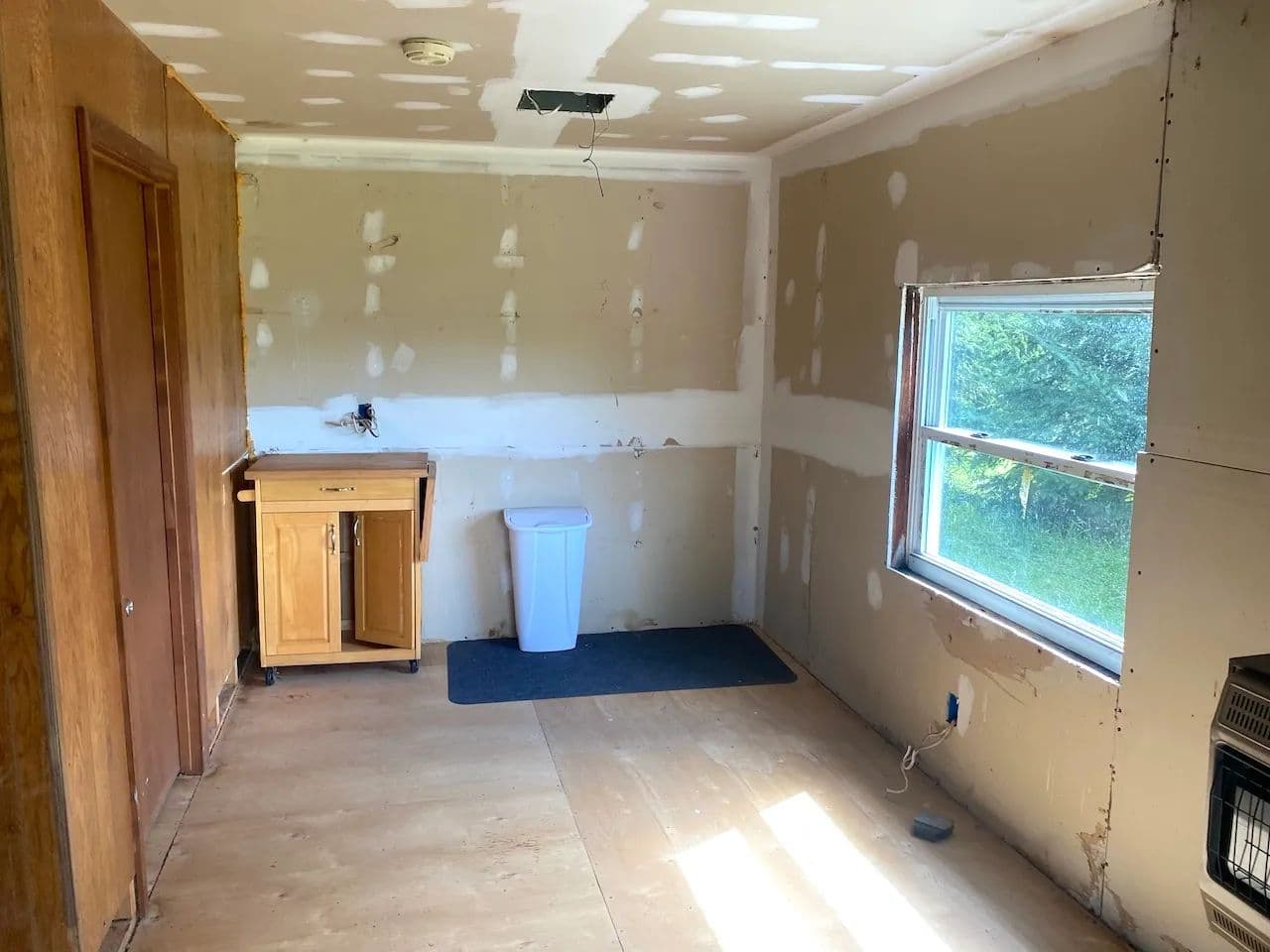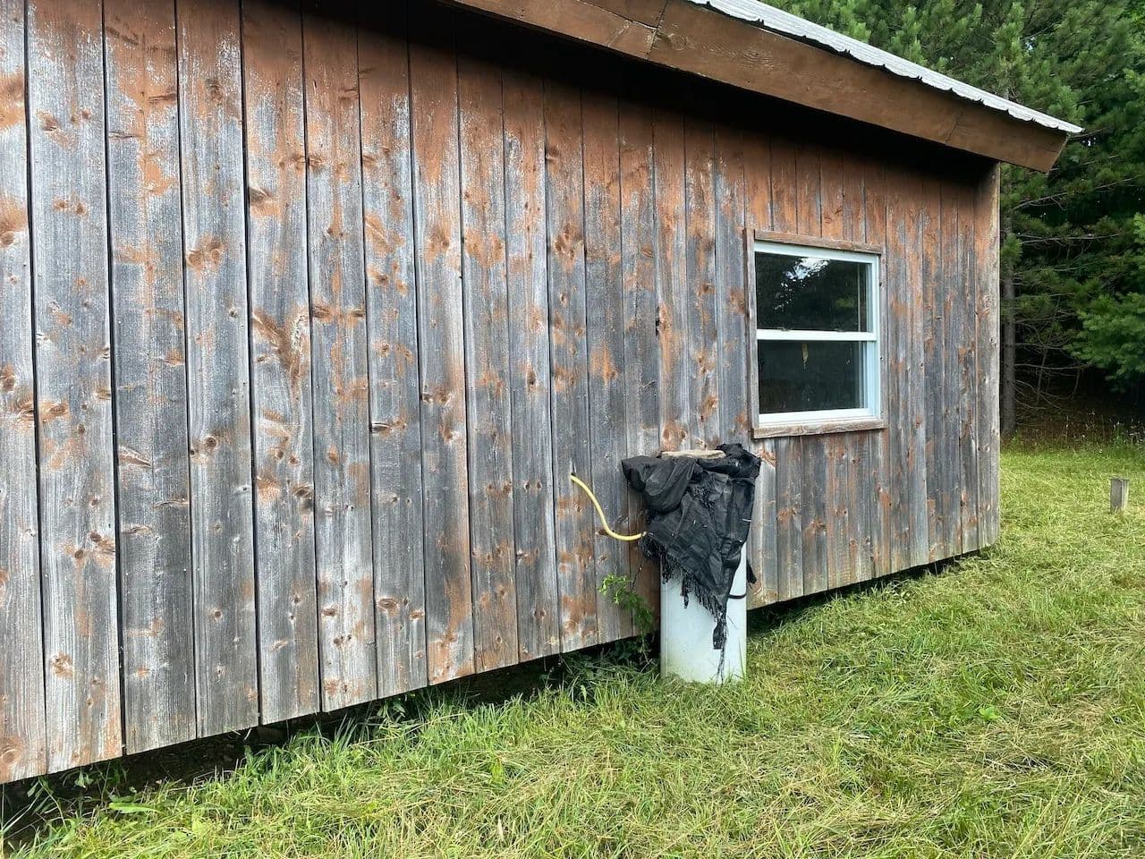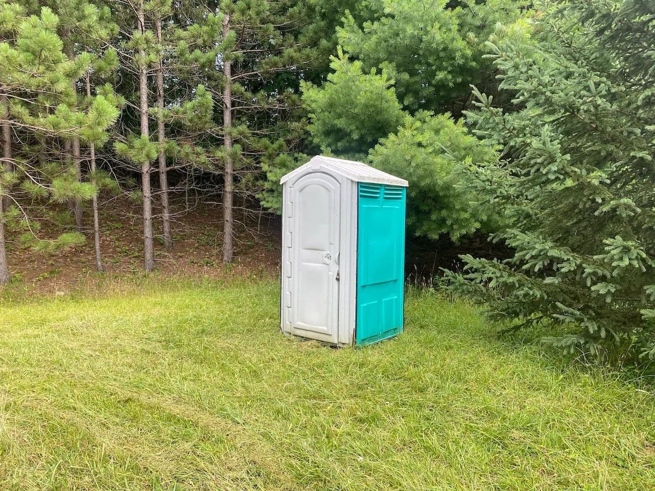 The cabin has a covered front porch and an open living and dining area. A wood stove and a wall-mounted propane furnace provide heat. There is one bedroom on the main floor and a loft for additional sleeping space. The interior is unfinished offering room for updates. A portable outhouse sits a short distance from the cabin.