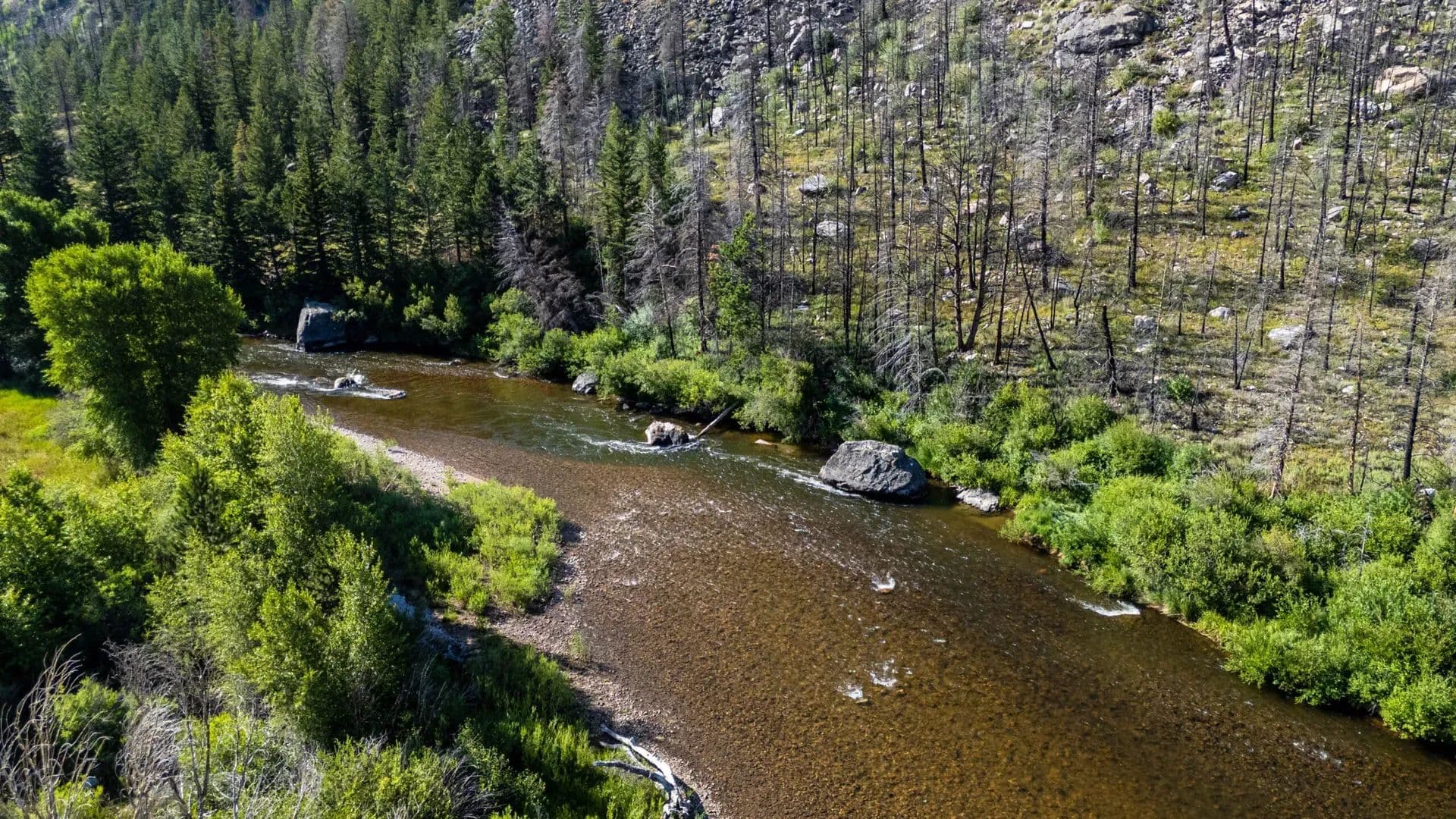 Encompassing 63.8 acres and bordered by vast national forest, this property offers direct access to miles of private trails—including one that leads straight from the backyard into the alpine wilderness. Mature cottonwoods and aspens shade the land, their colors shifting dramatically with the seasons, while dramatic rock outcroppings form a rugged and inspiring backdrop. The river here is exceptional. Located just below the fish hatchery, this stretch of the Poudre is renowned for its healthy populations of rainbow trout, big-bodied browns, and the occasional trophy cutbow. With classic western features—deep runs, clean riffles, large holding boulders, and prime casting lanes—this is a fly angler’s dream. Step into the water from your own property or simply sit on the deck and watch the fish rise. Elsewhere on the property are four discreet RV sites—remnants of a former campground—repurposed to welcome visiting friends and family.