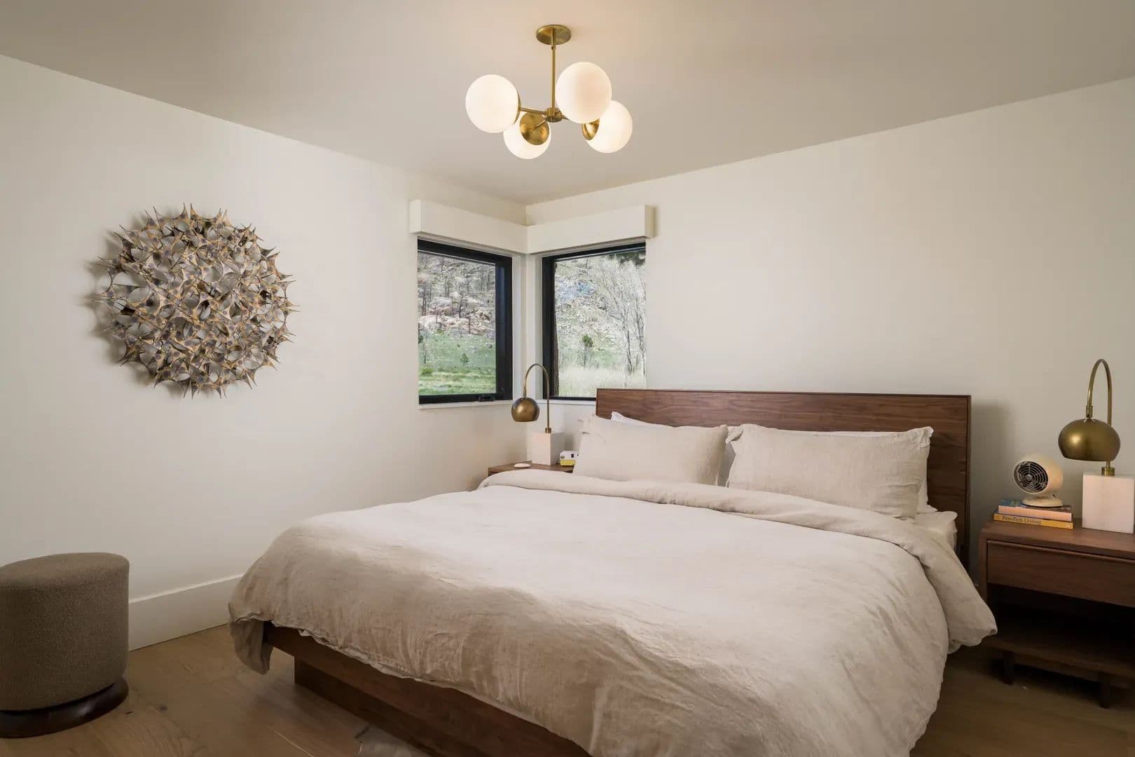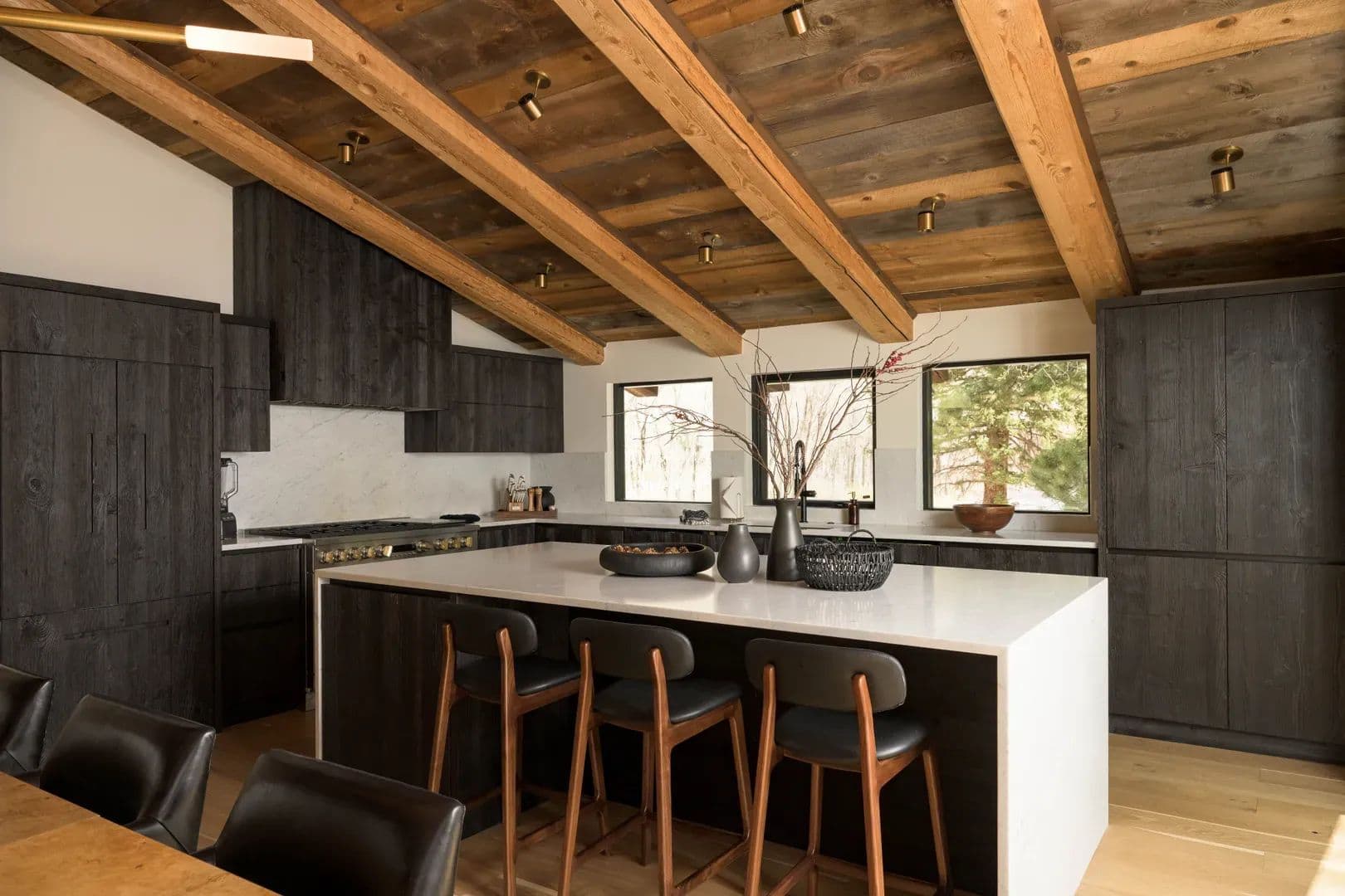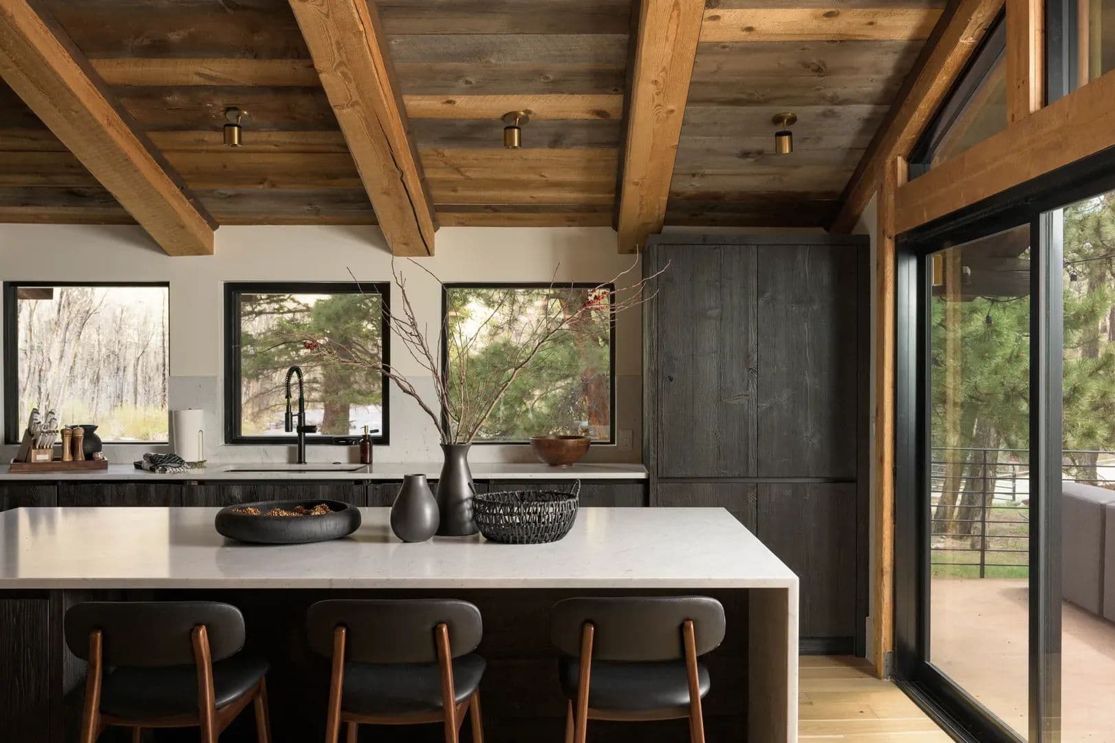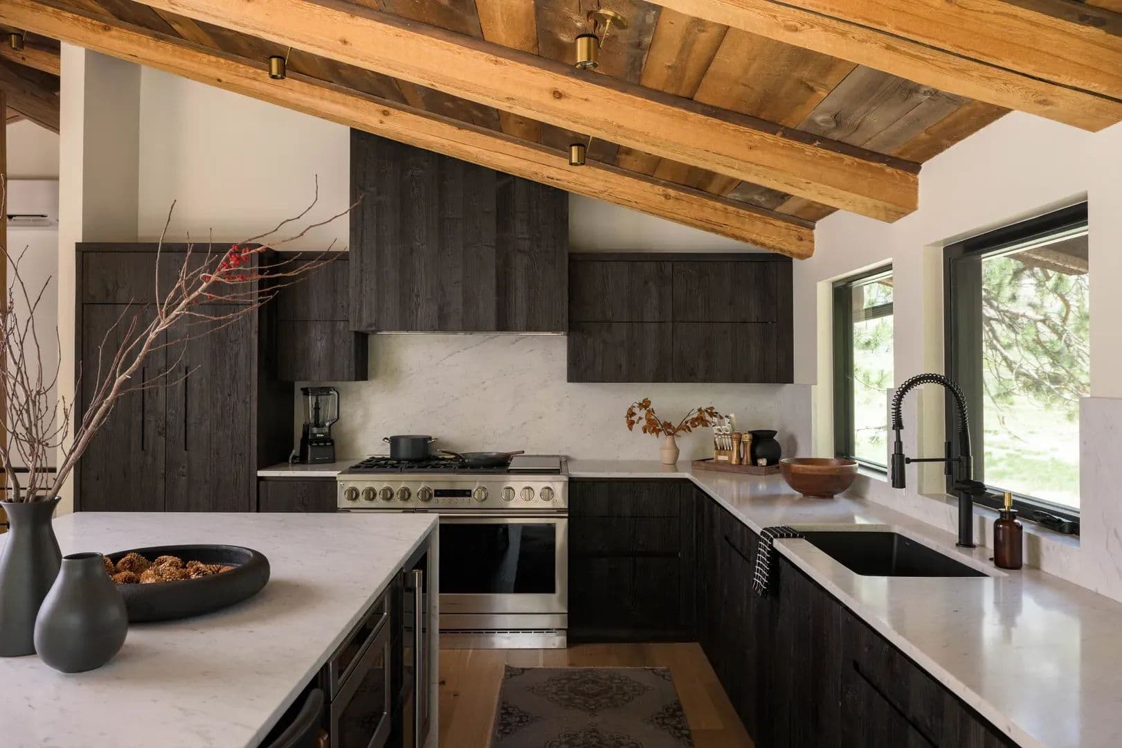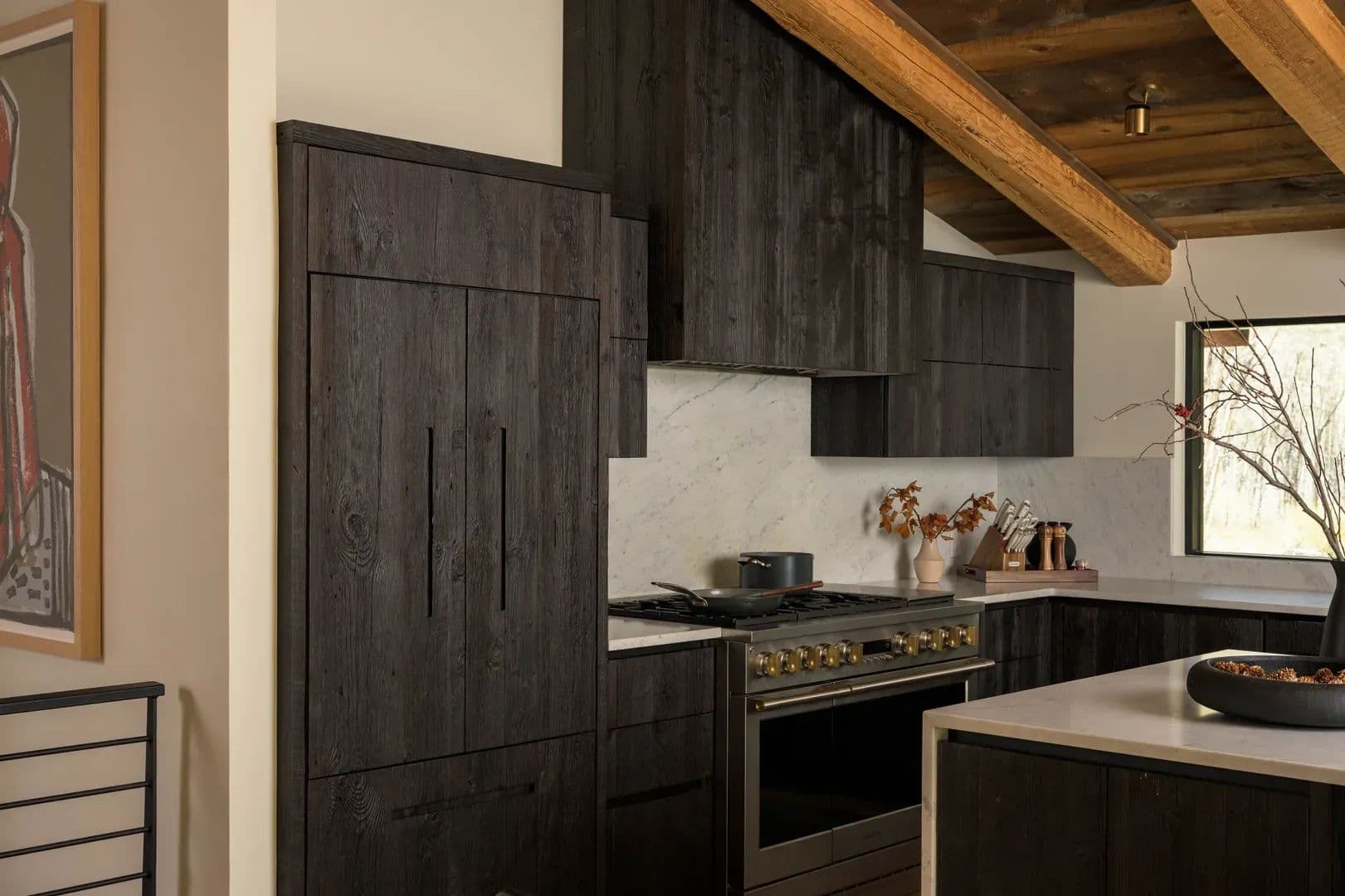 Inside, the kitchen features rustic dark oak cabinetry with a wire-brushed finish reminiscent of shou sugi ban with marble counters and a statement range—flowing seamlessly into open dining and living spaces perfect for both hosting and unwinding. Spa-inspired bathrooms include walk-in tile showers and massive soaking tubs that captures canyon views in stillness. High end designer lighting, custom woodwork, and layered natural materials create an atmosphere that is grounded, refined, and unmistakably personal.
