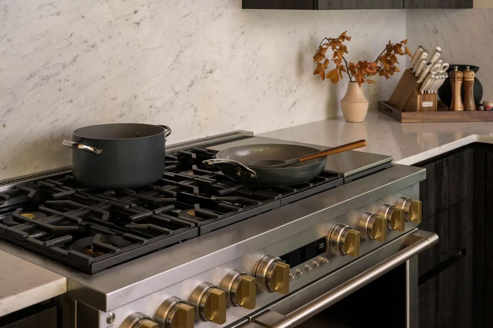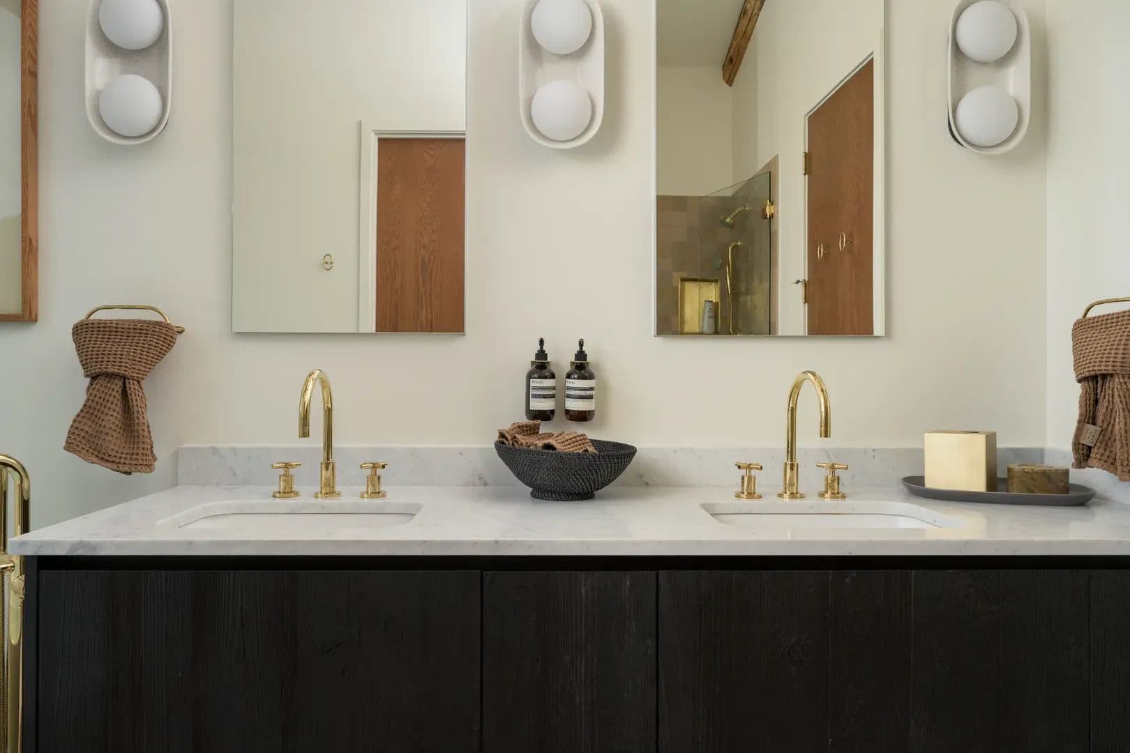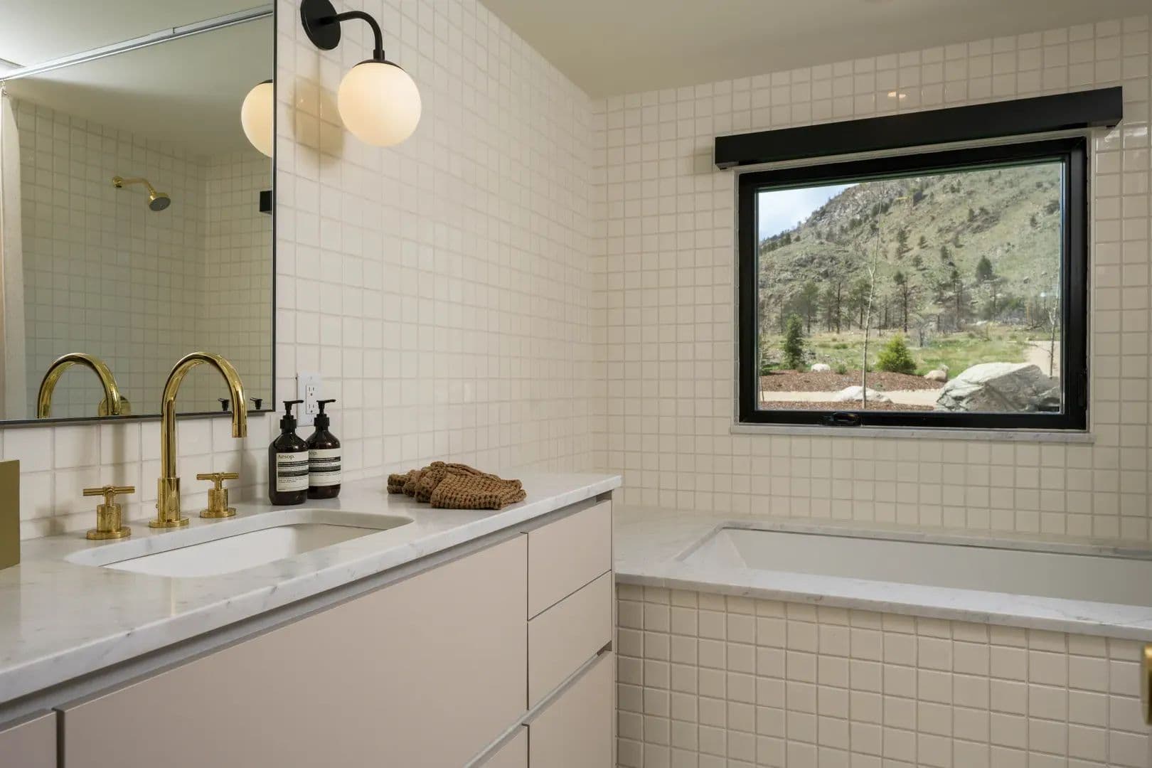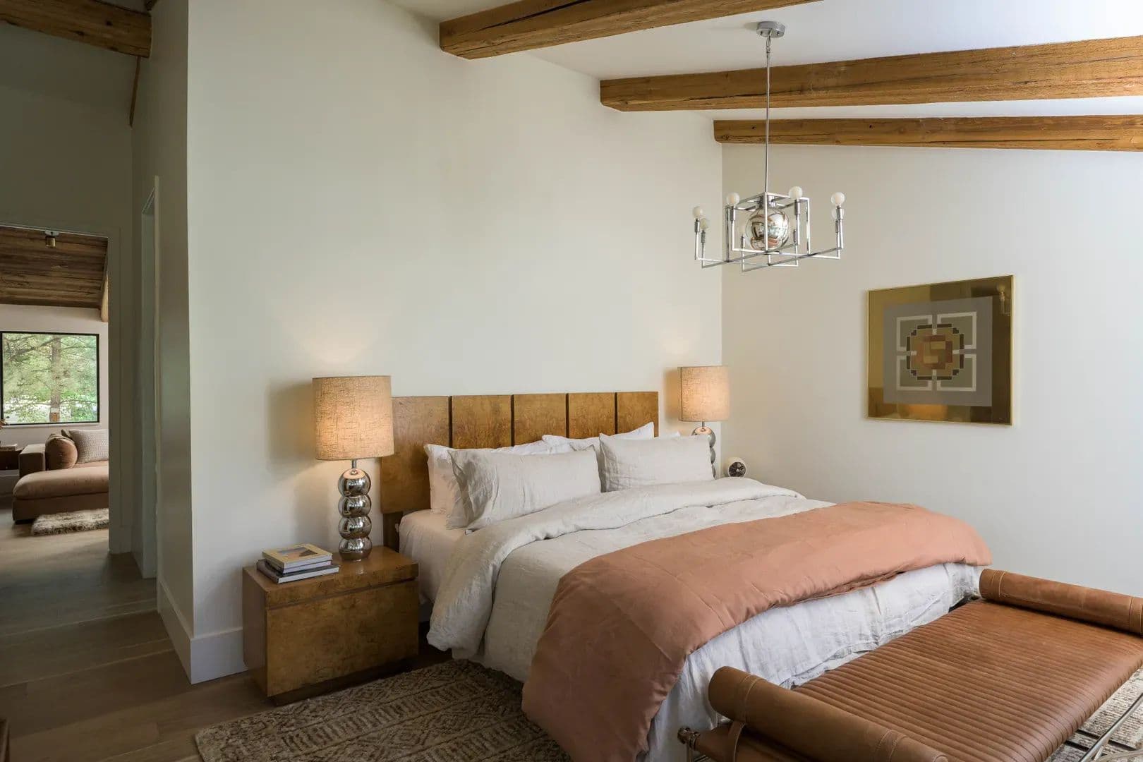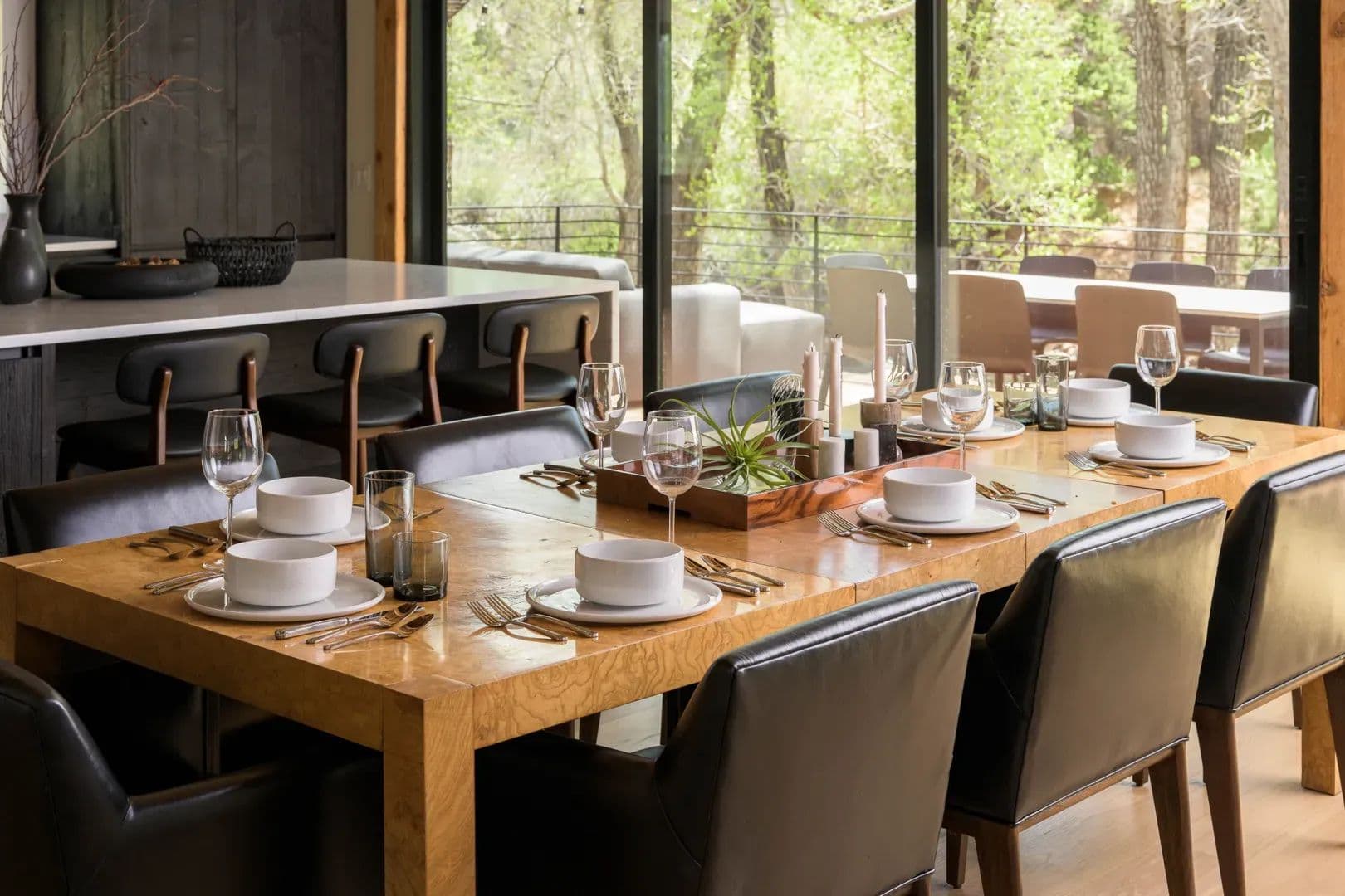 Inside, the kitchen features rustic dark oak cabinetry with a wire-brushed finish reminiscent of shou sugi ban with marble counters and a statement range—flowing seamlessly into open dining and living spaces perfect for both hosting and unwinding. Spa-inspired bathrooms include walk-in tile showers and massive soaking tubs that captures canyon views in stillness. High end designer lighting, custom woodwork, and layered natural materials create an atmosphere that is grounded, refined, and unmistakably personal.