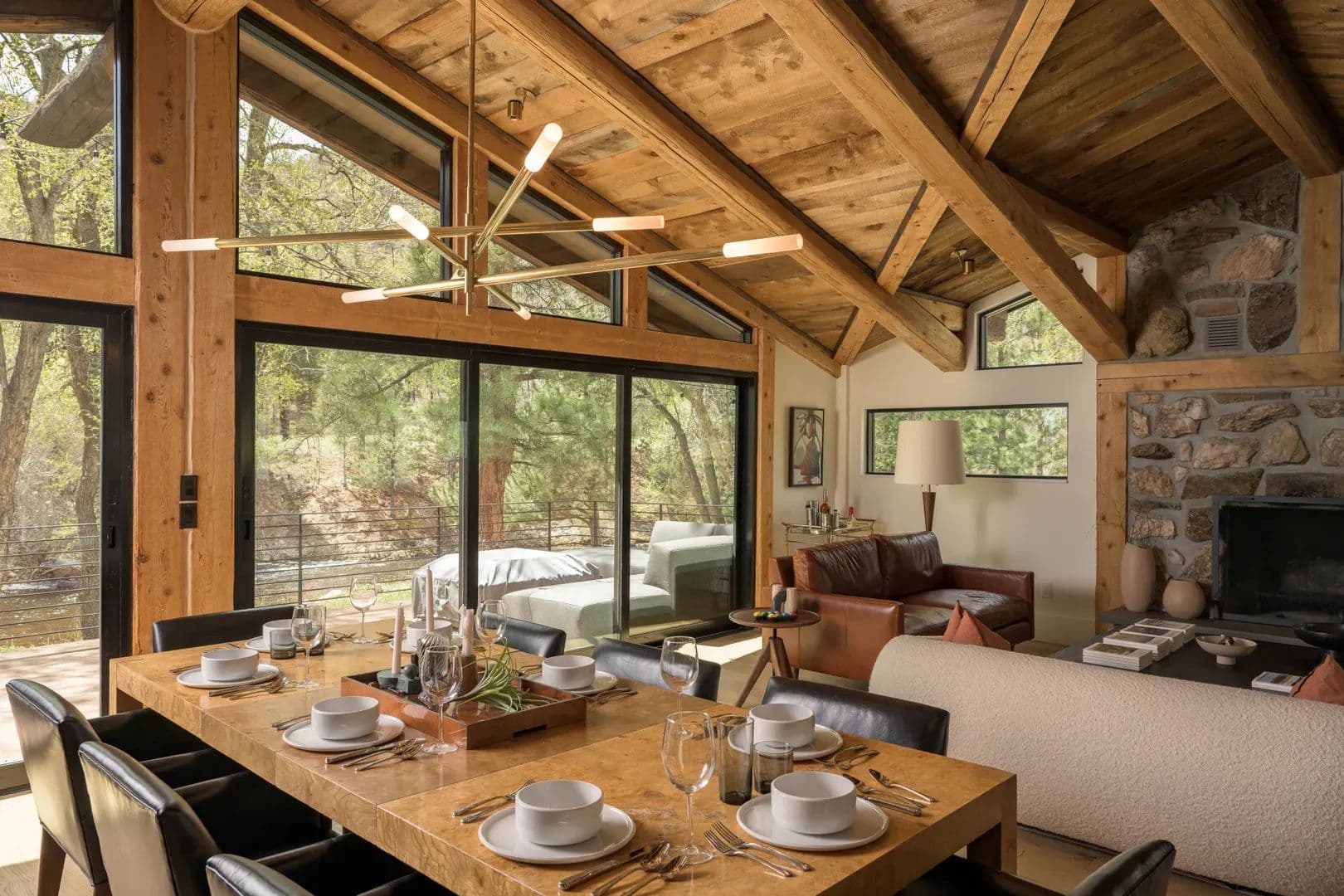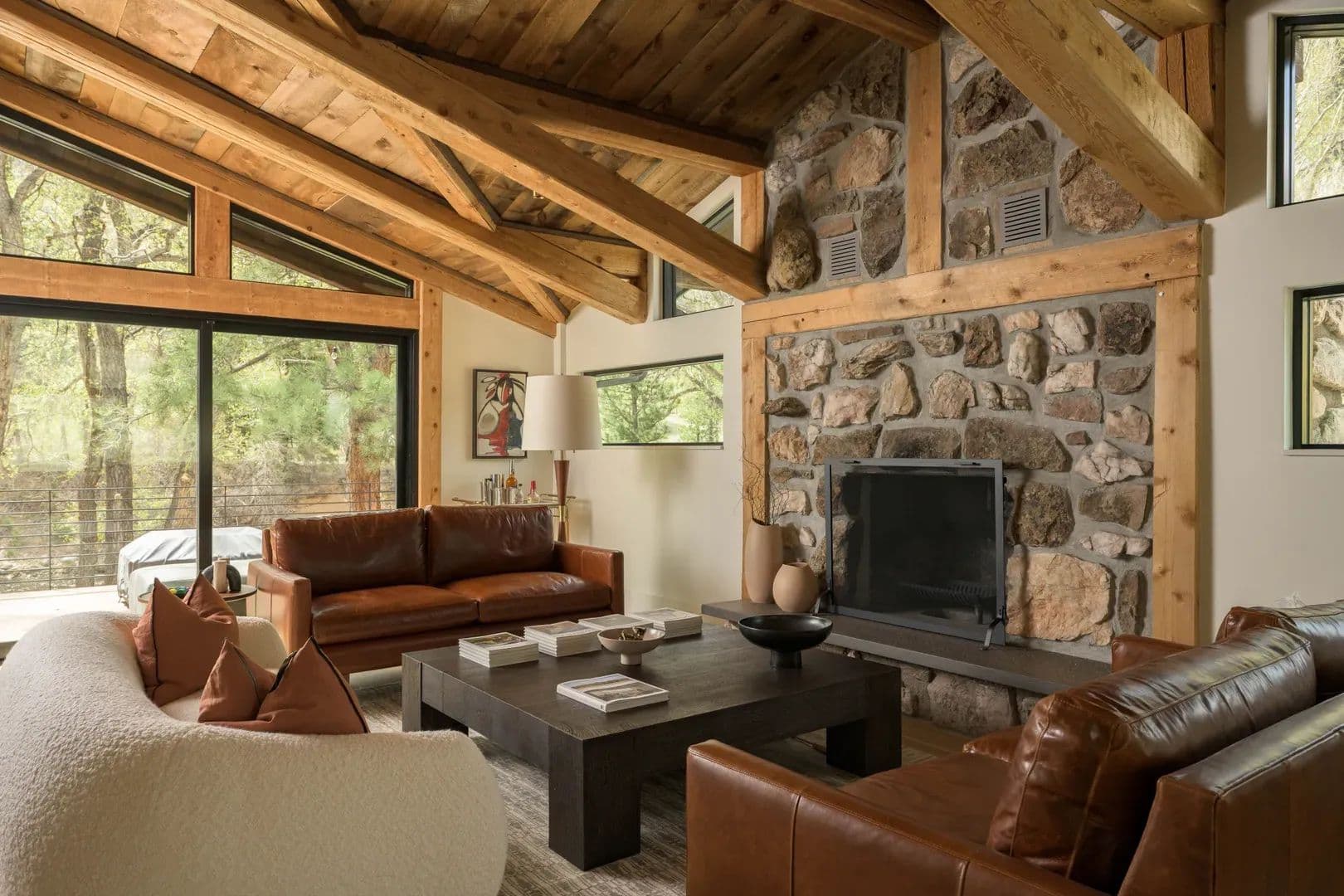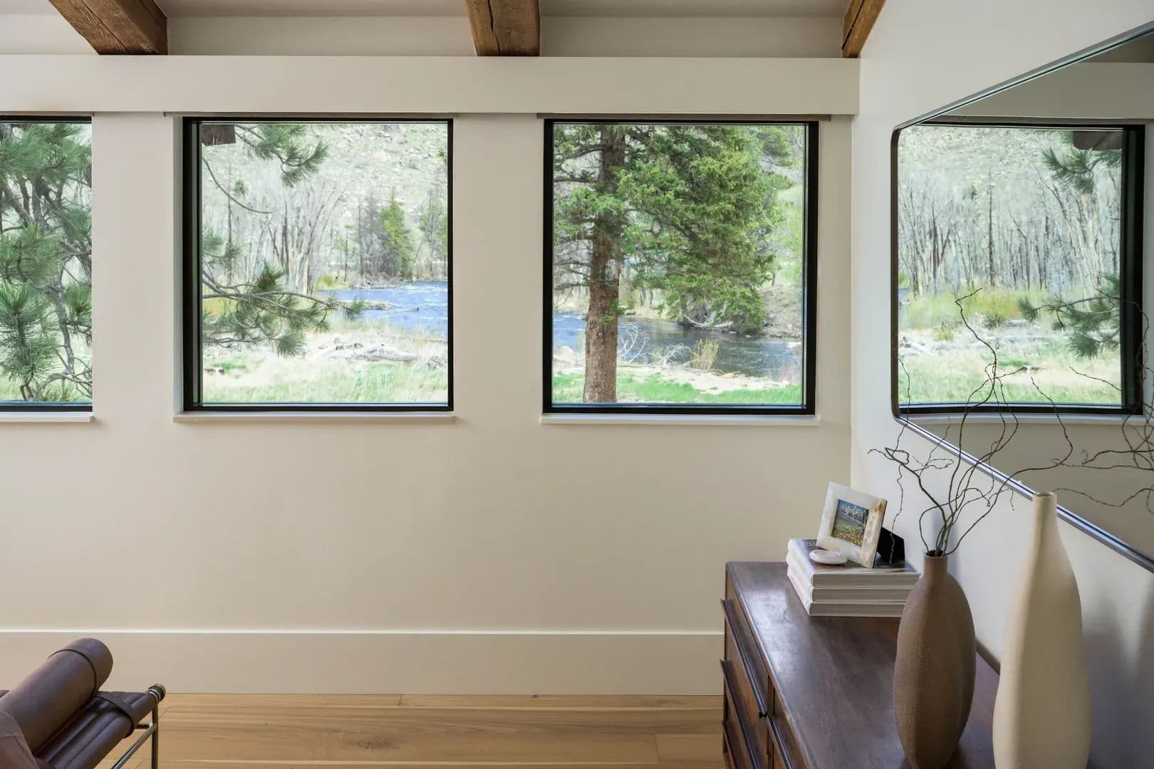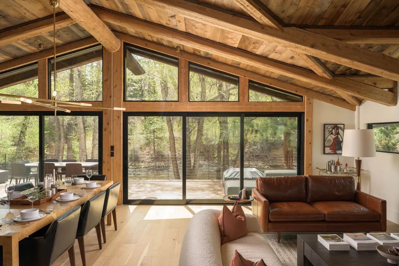This 2,976-square-foot home has been fully reimagined from the ground up by its developer-owner for personal use and was designed in collaboration with renowned interior designer Bree Halax. The result is a residence that is both deeply functional and visually striking—crafted to live beautifully in all seasons. The great room features a vaulted wood-beamed ceiling and original stonework preserved from the 1970s structure, now paired with modern touches and expansive windows that frame the river just beyond. Twin triple panel glass sliding doors lead to a stunning second story deck with a built-in fire table where one can enjoy the views and the constant soundtrack of moving water.