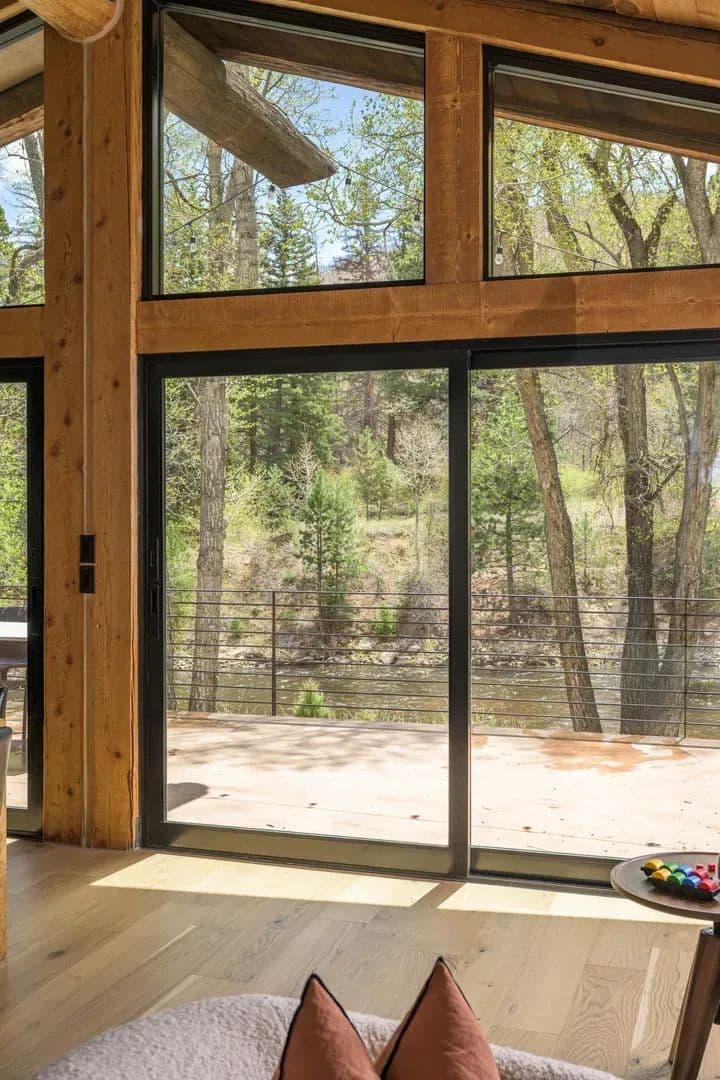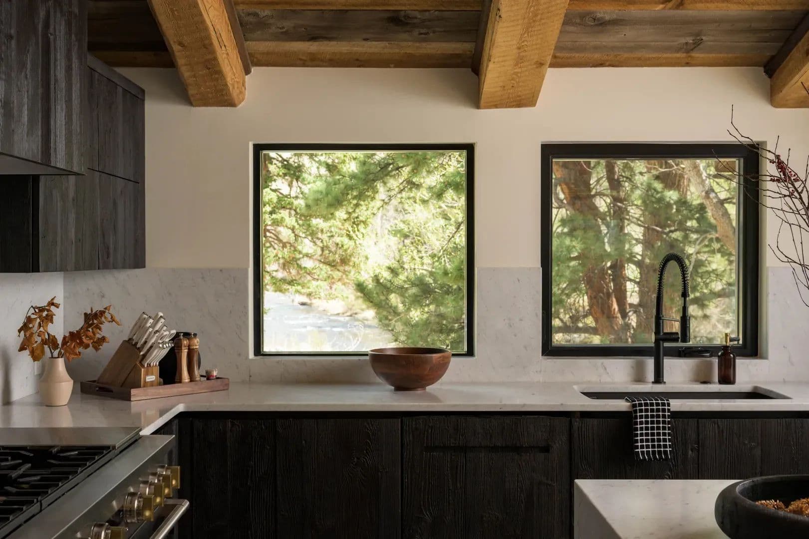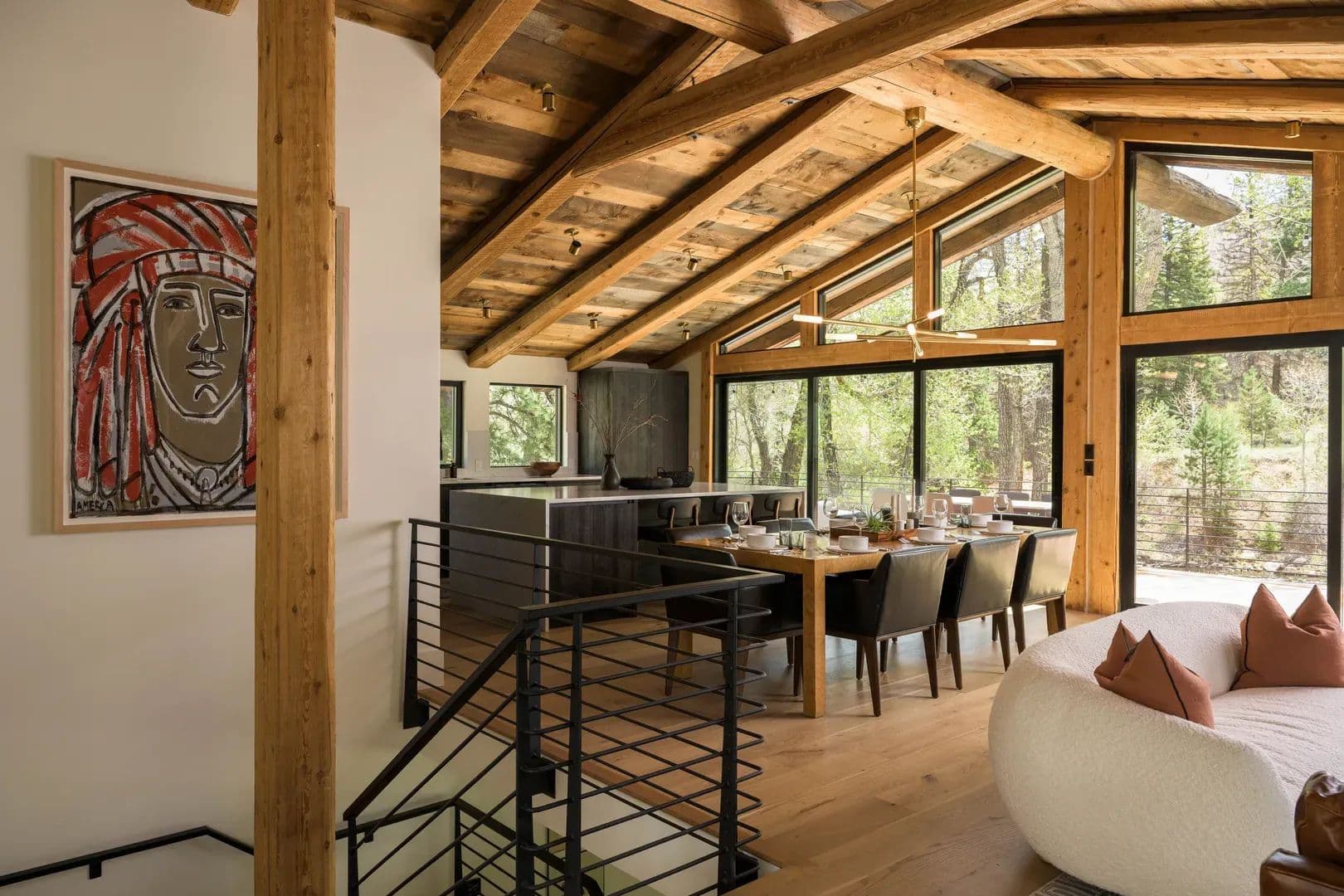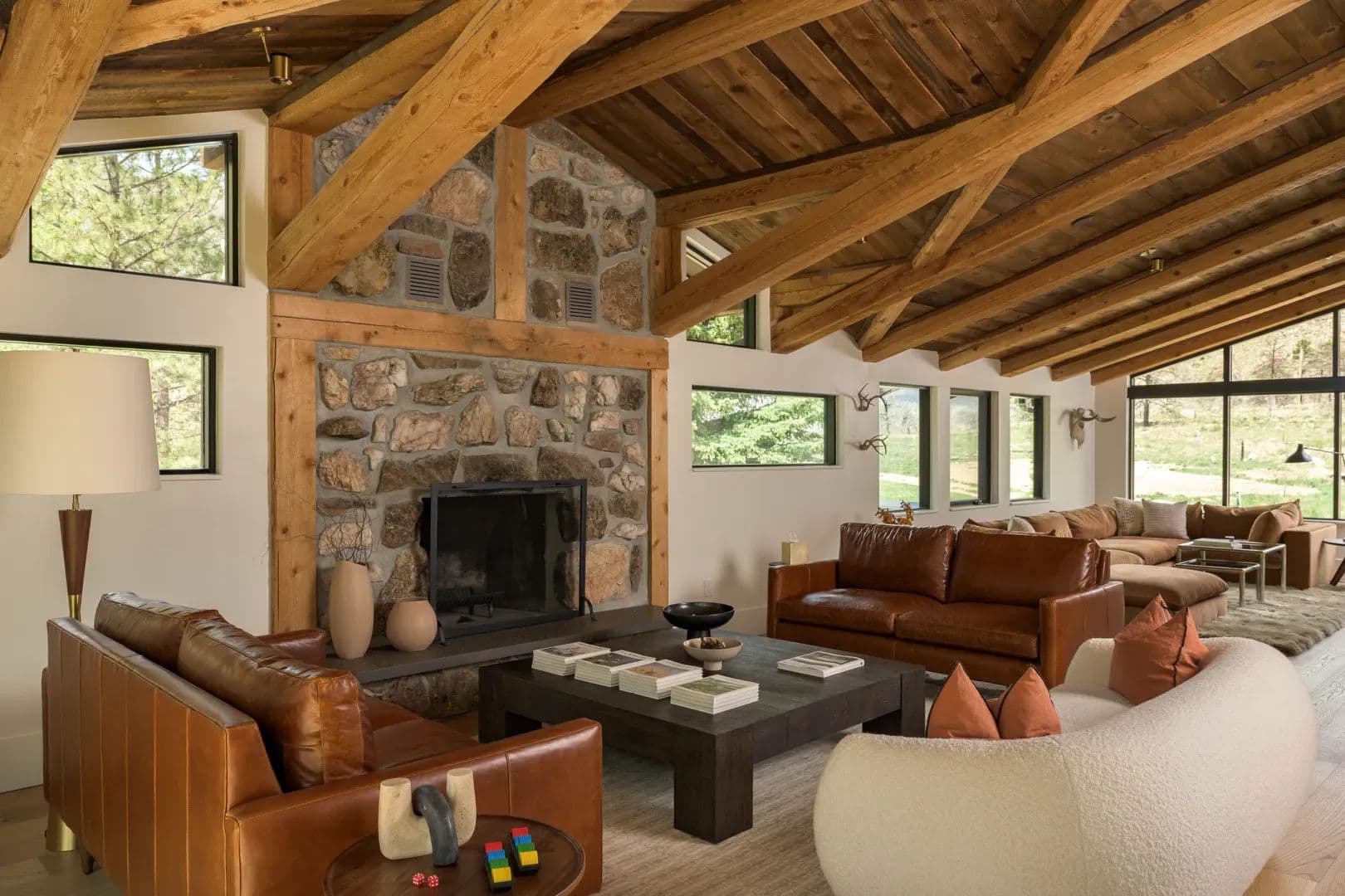 This 2,976-square-foot home has been fully reimagined from the ground up by its developer-owner for personal use and was designed in collaboration with renowned interior designer Bree Halax. The result is a residence that is both deeply functional and visually striking—crafted to live beautifully in all seasons. The great room features a vaulted wood-beamed ceiling and original stonework preserved from the 1970s structure, now paired with modern touches and expansive windows that frame the river just beyond. Twin triple panel glass sliding doors lead to a stunning second story deck with a built-in fire table where one can enjoy the views and the constant soundtrack of moving water.