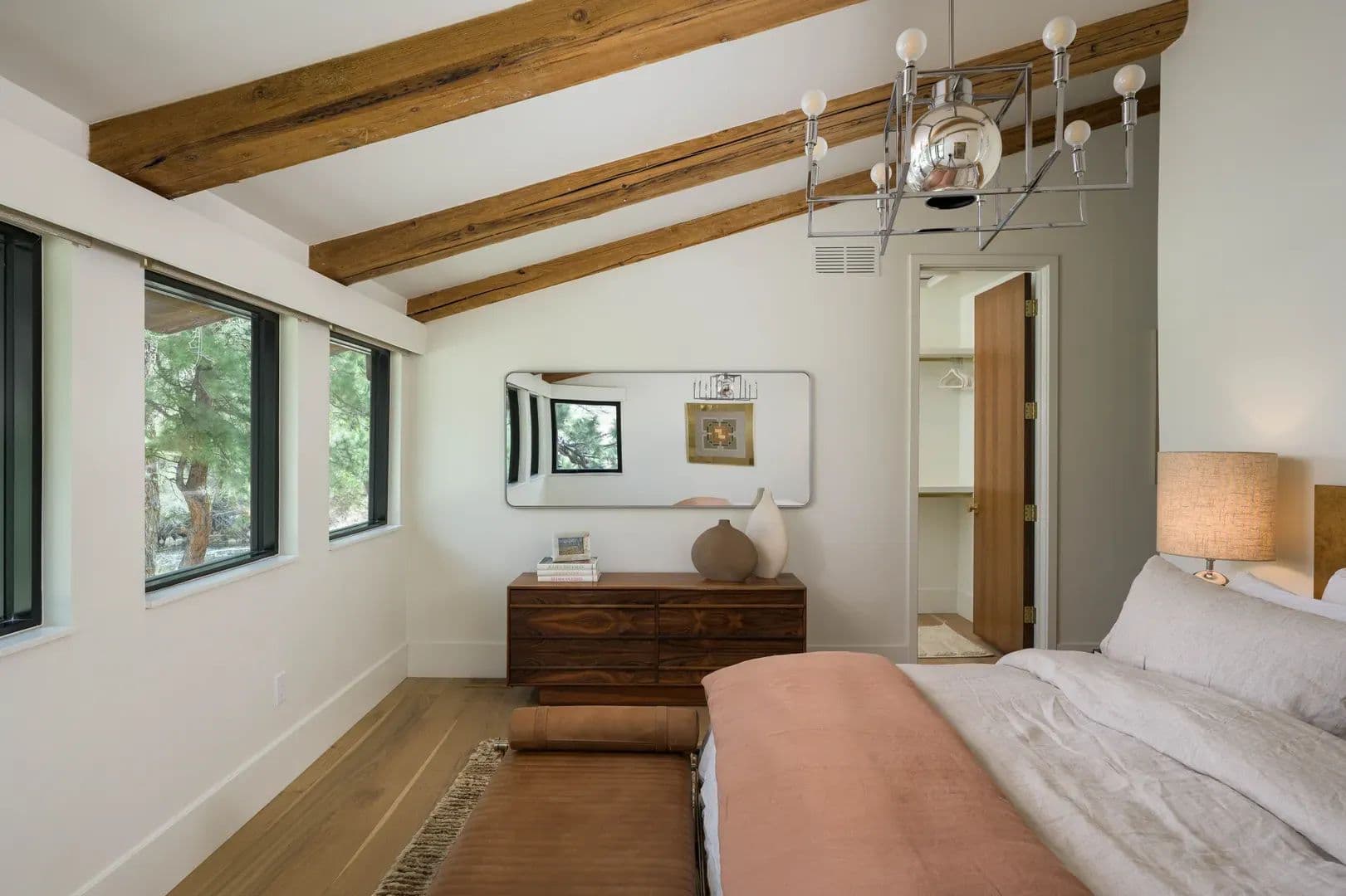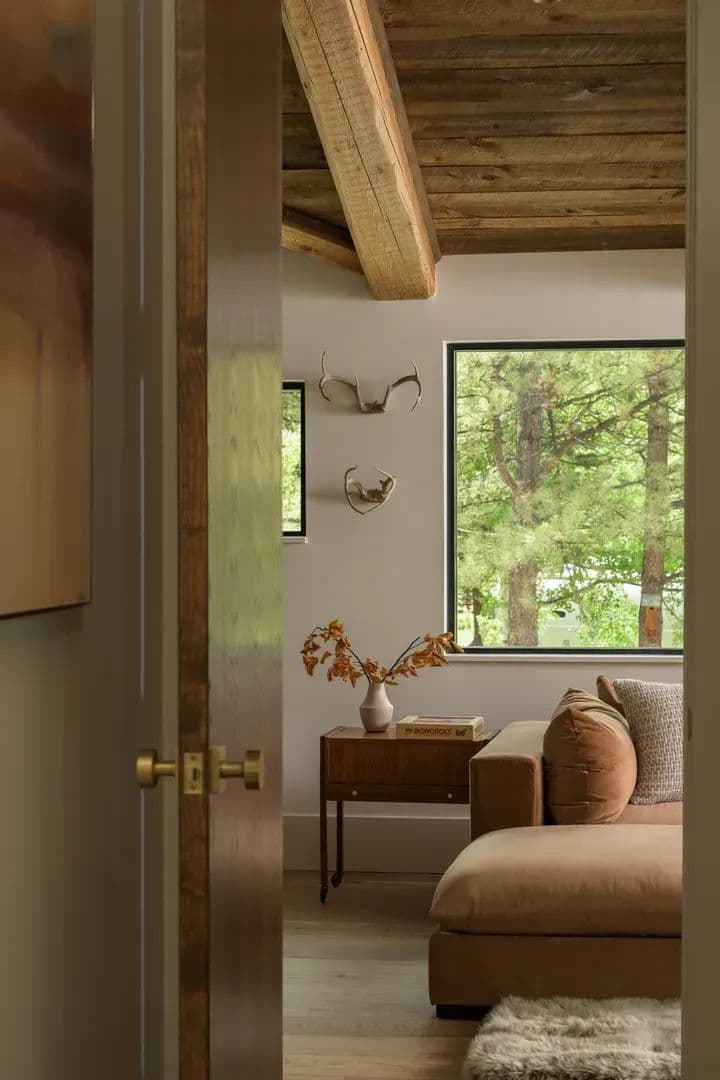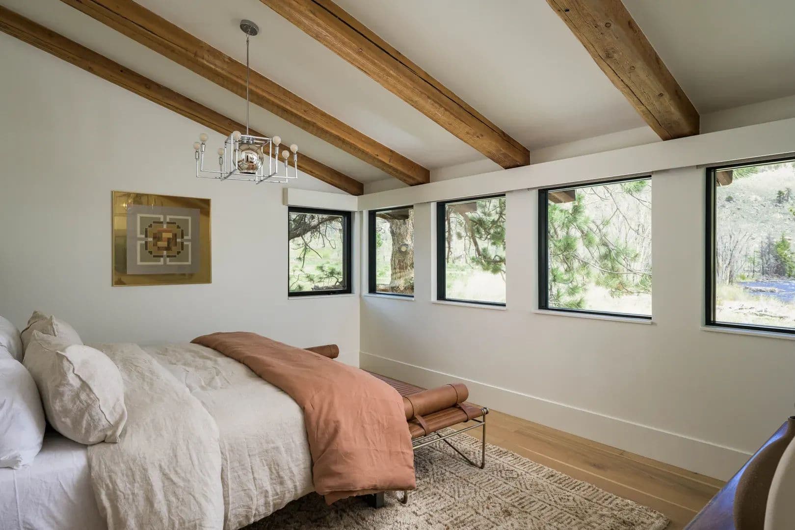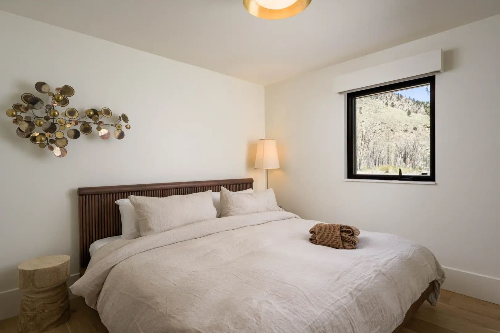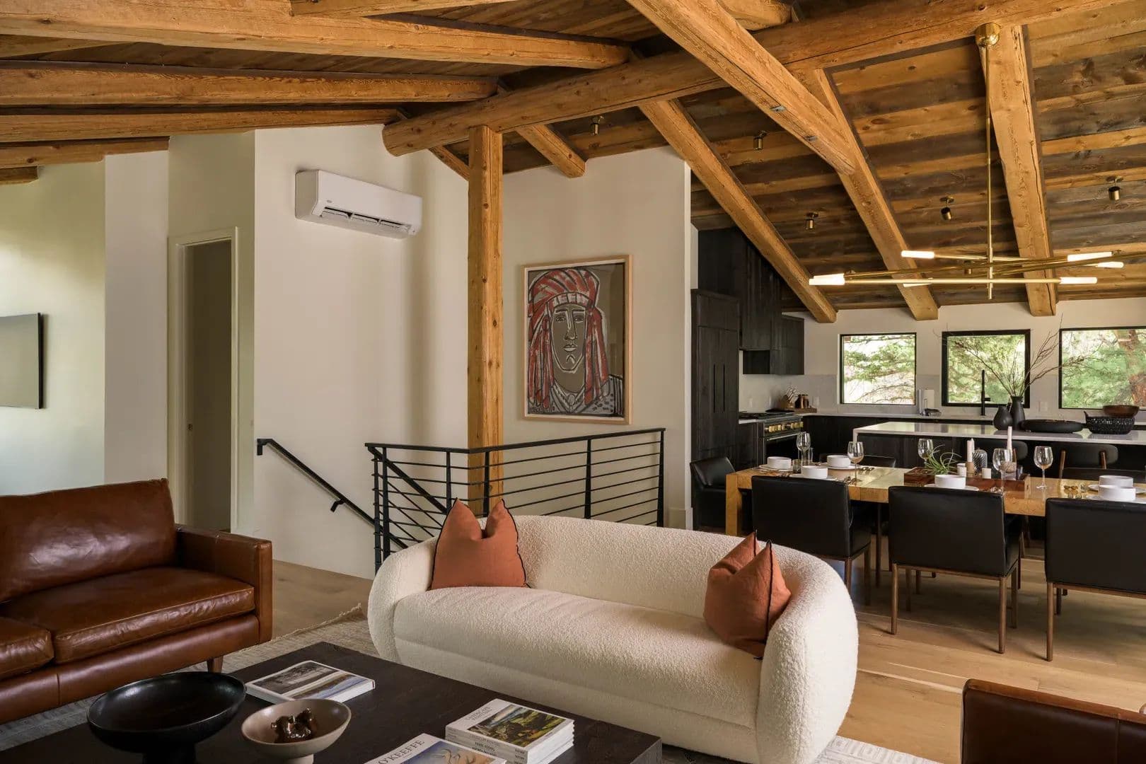 This 2,976-square-foot home has been fully reimagined from the ground up by its developer-owner for personal use and was designed in collaboration with renowned interior designer Bree Halax. The result is a residence that is both deeply functional and visually striking—crafted to live beautifully in all seasons. The great room features a vaulted wood-beamed ceiling and original stonework preserved from the 1970s structure, now paired with modern touches and expansive windows that frame the river just beyond. Twin triple panel glass sliding doors lead to a stunning second story deck with a built-in fire table where one can enjoy the views and the constant soundtrack of moving water.