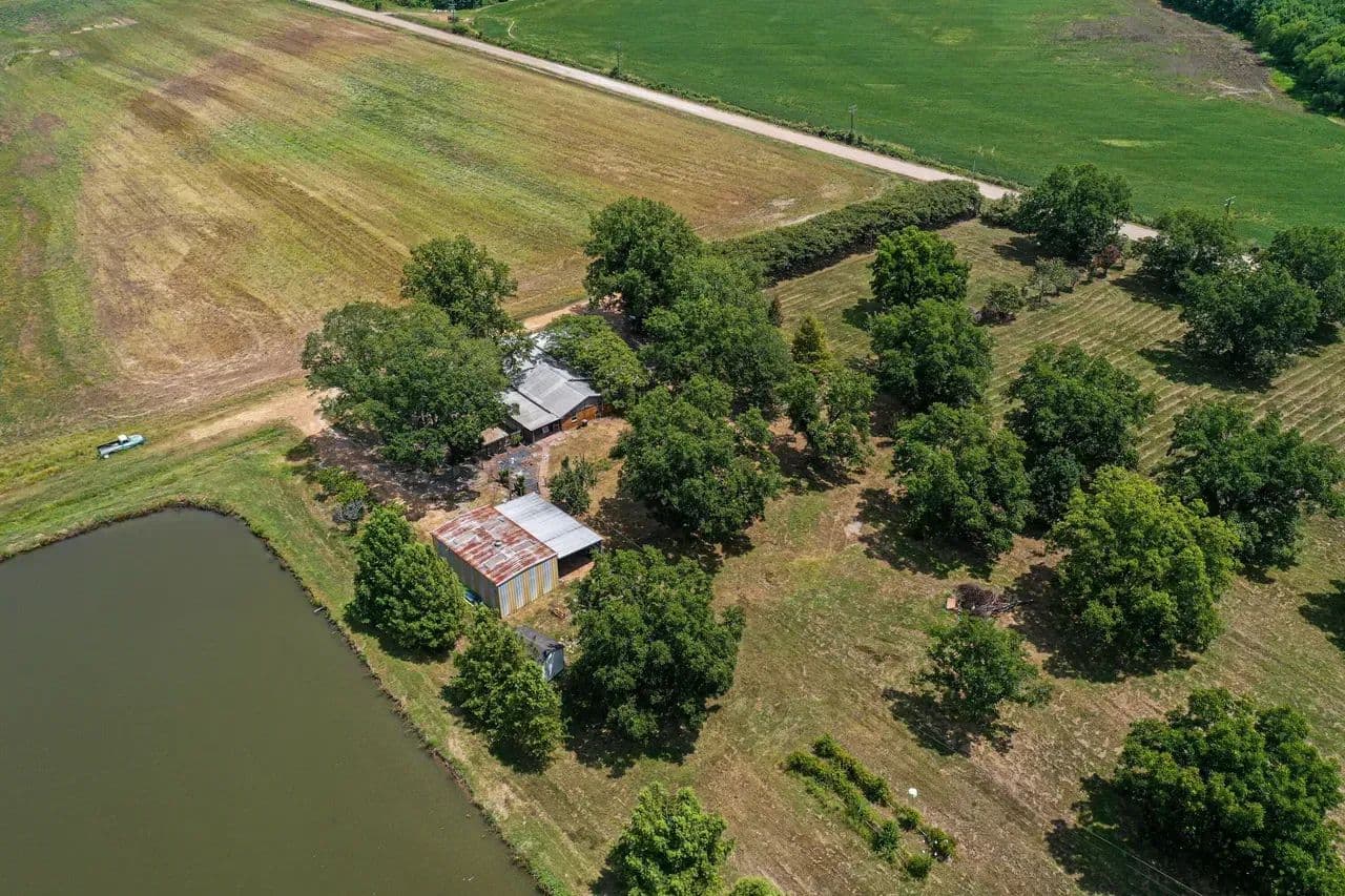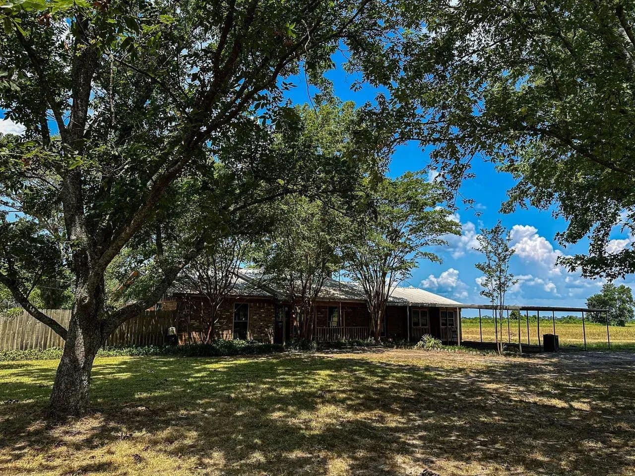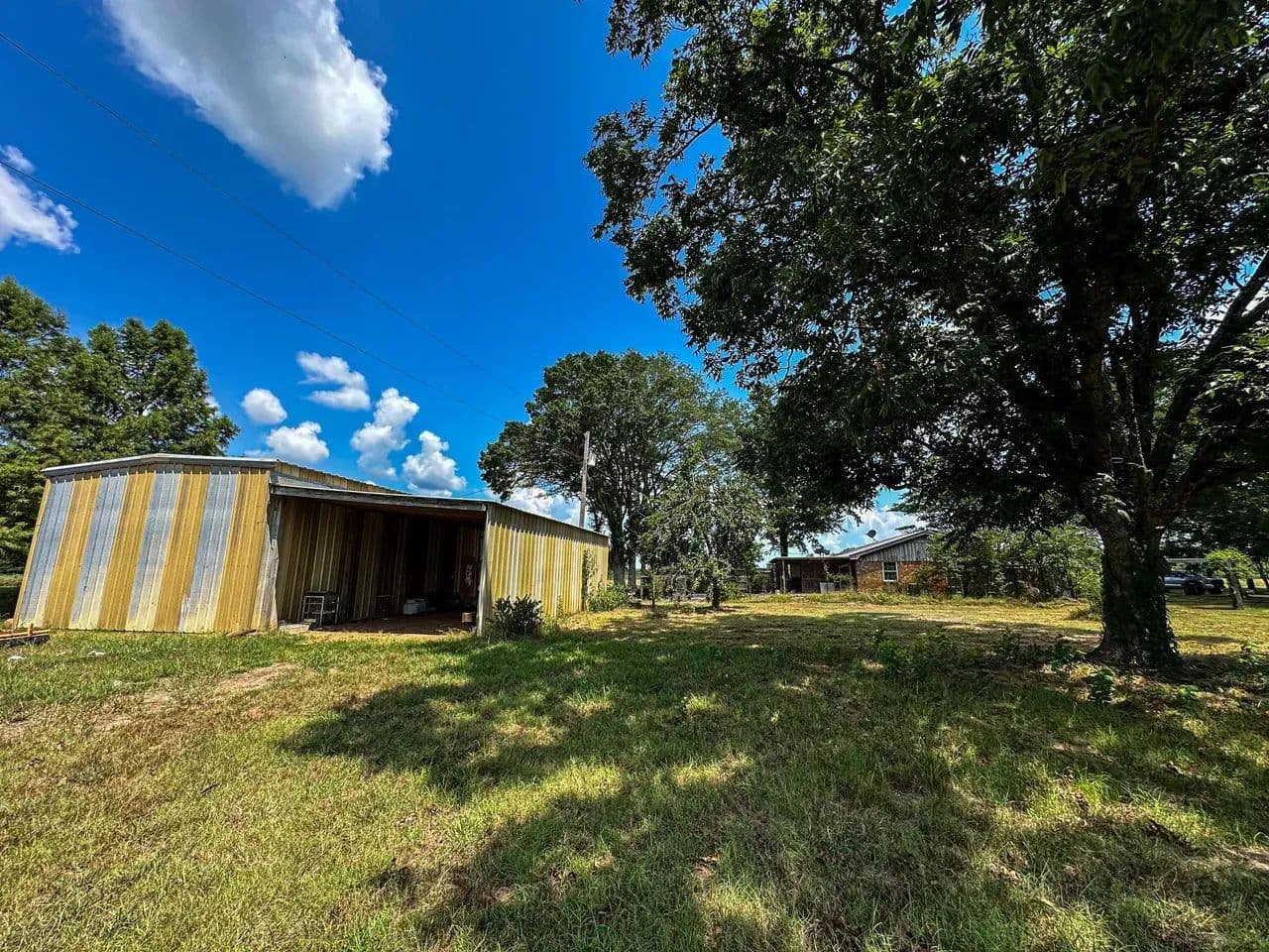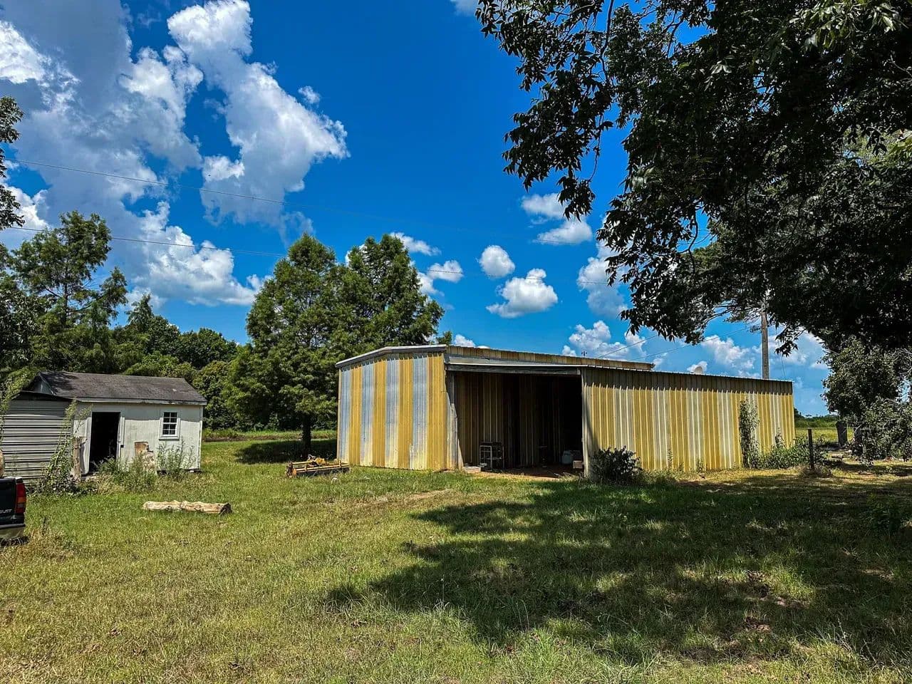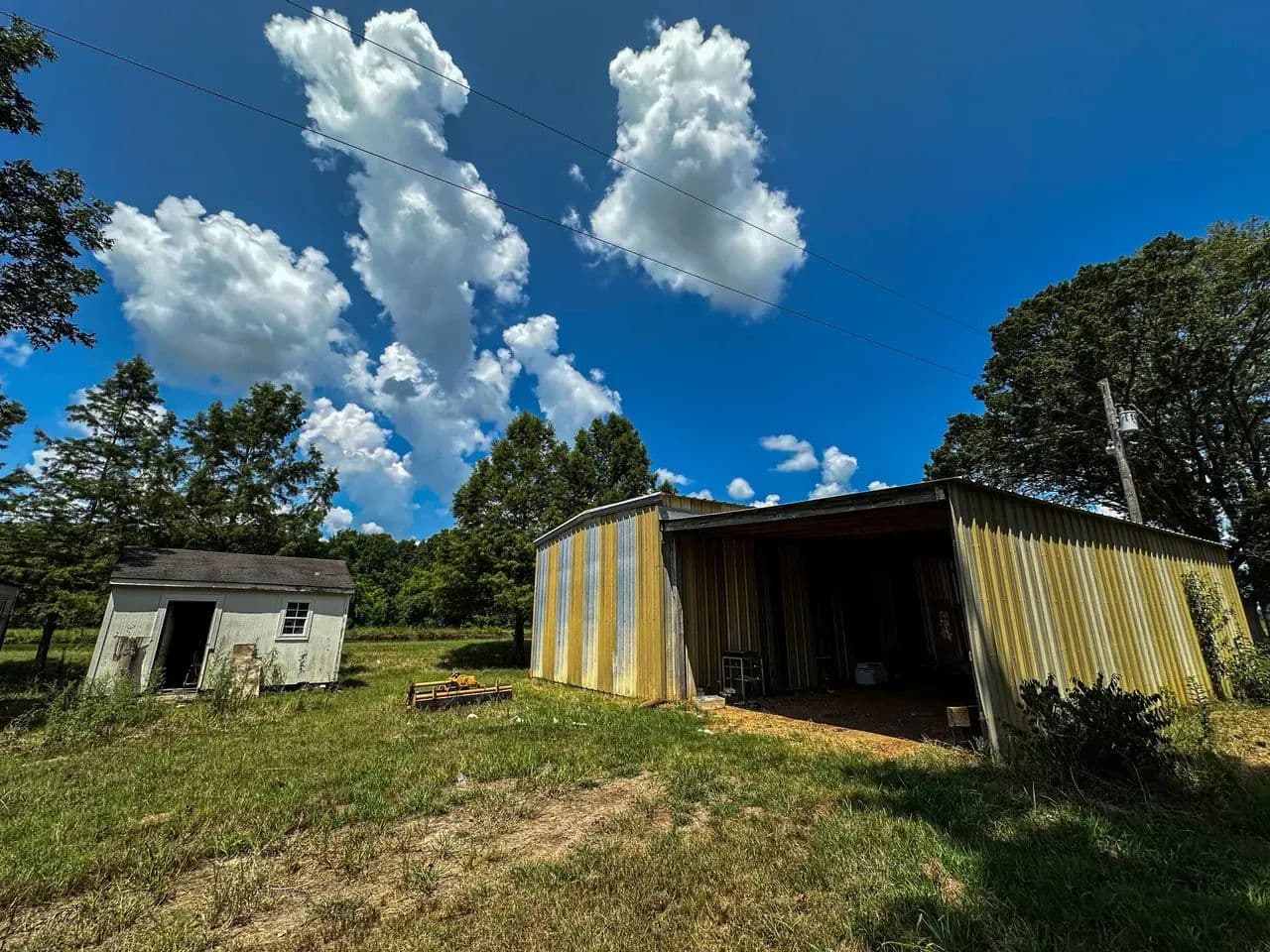 The property features a 3-bedroom, 2-bathroom home with an attached carport, a large metal shop with power and water, and multiple other outbuildings, making it ideal for both full-time living or as a hunting retreat. The surrounding landscape offers beautiful Delta views, with rice and soybean fields nearby creating a prime environment for big Mississippi whitetails.