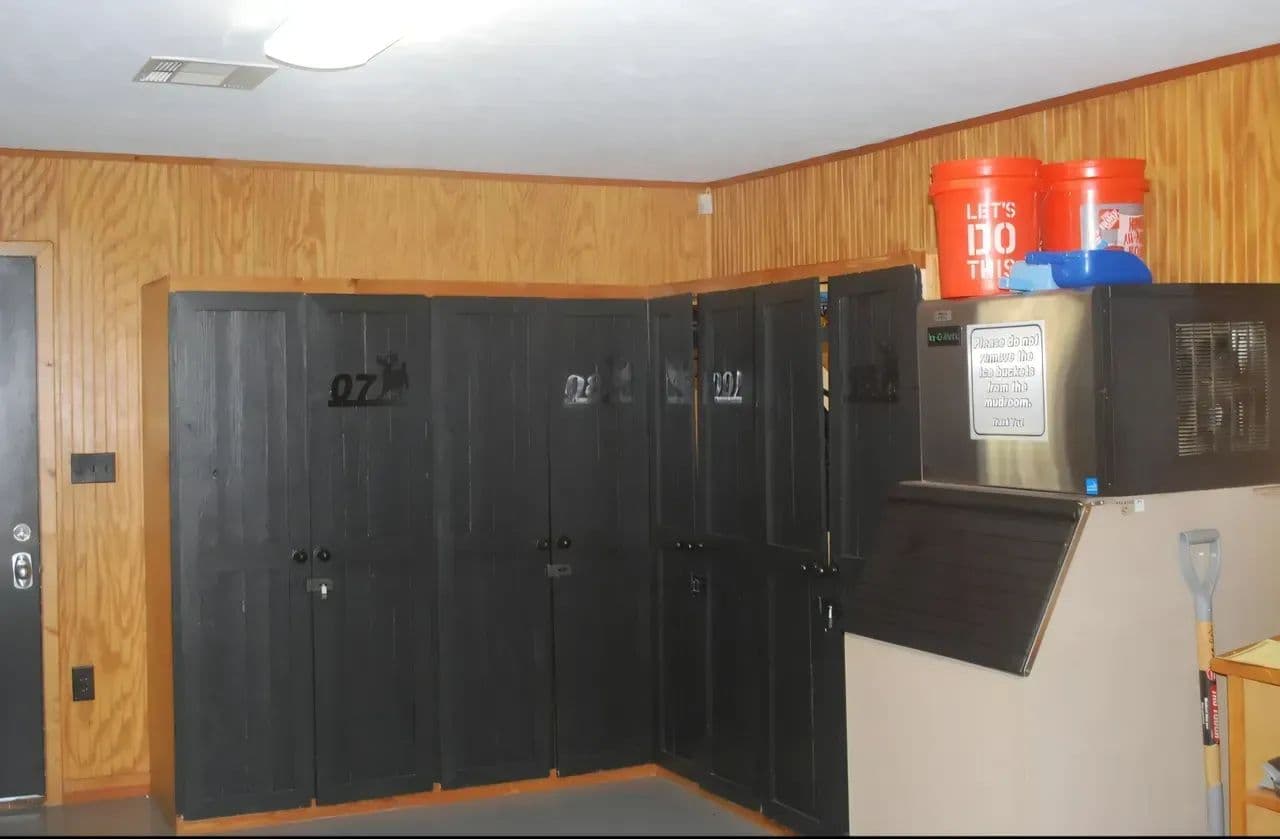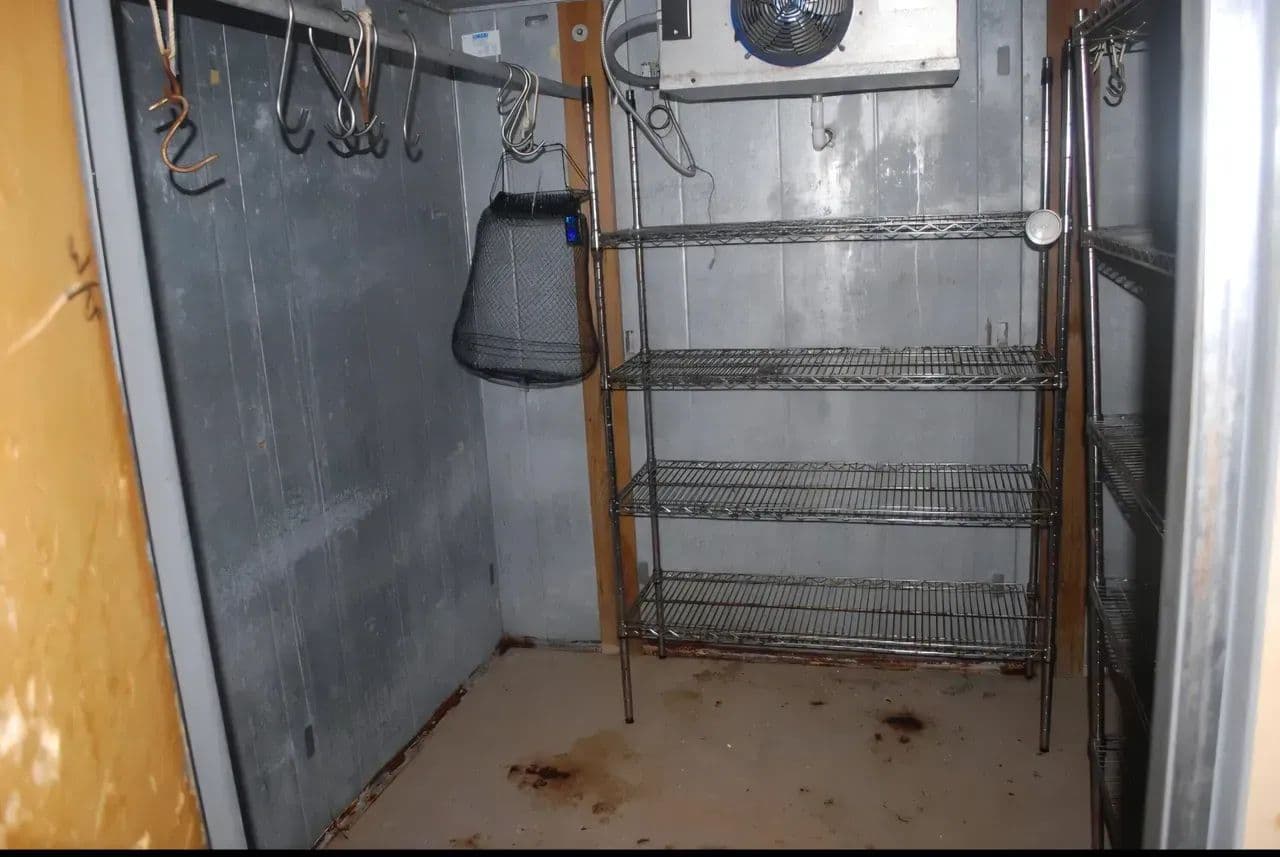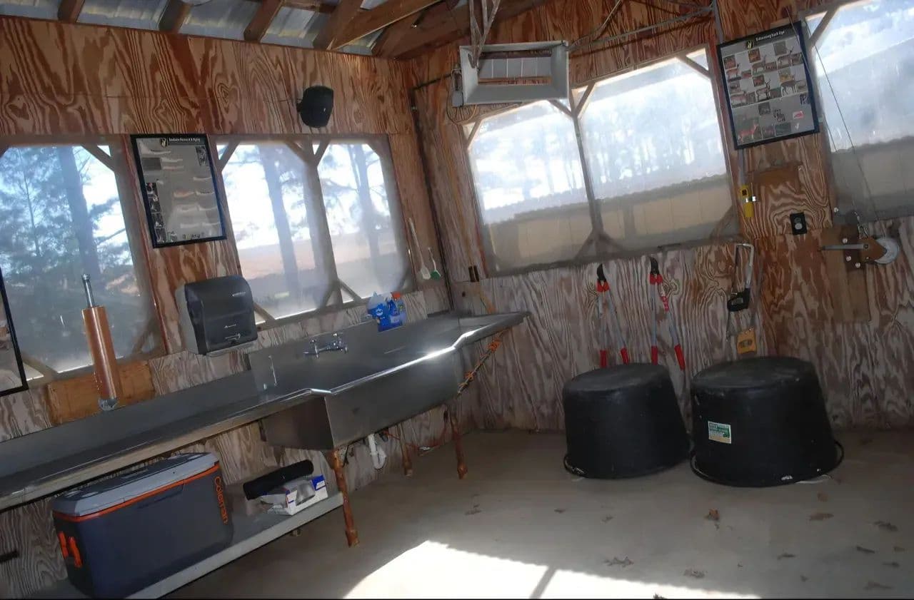 Skinning shed with walk-in cooler, equipment barn with private bays, and ample ATV and gear storage .