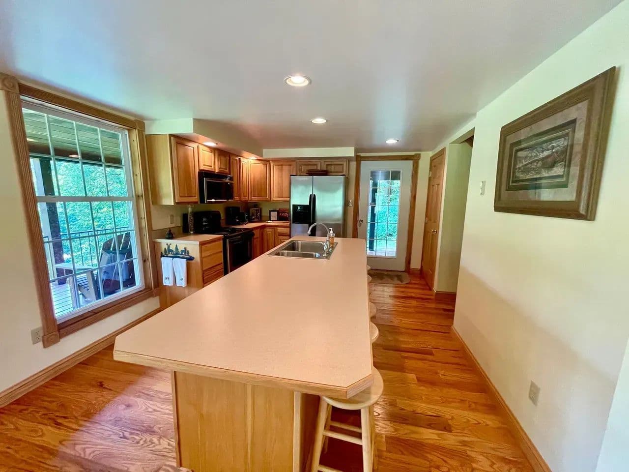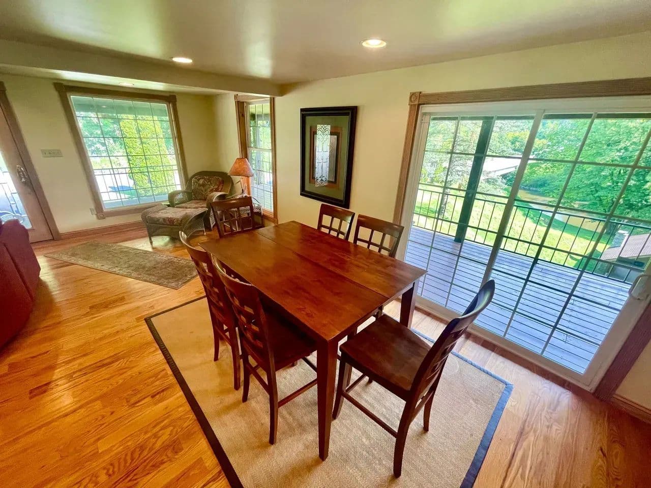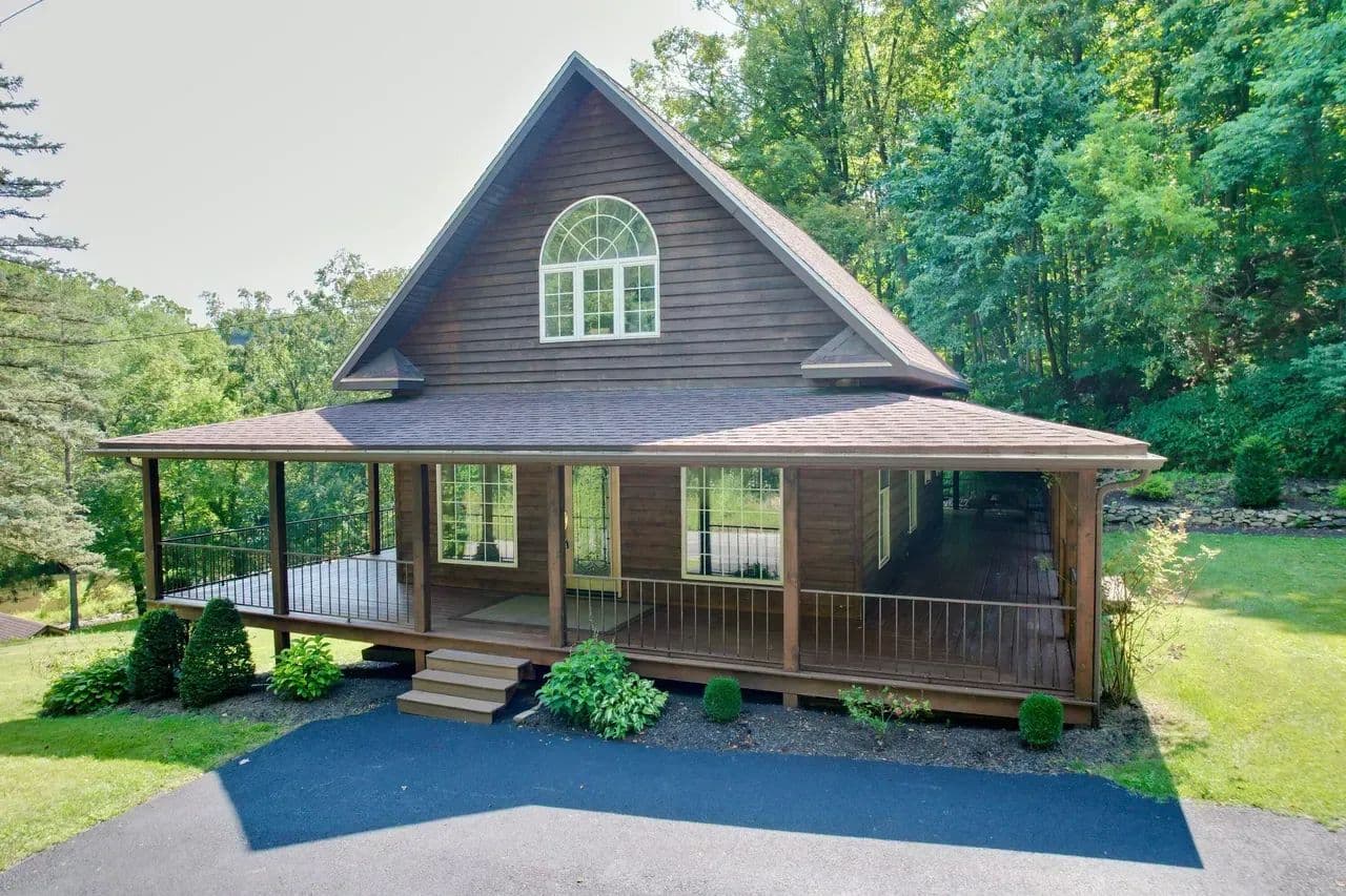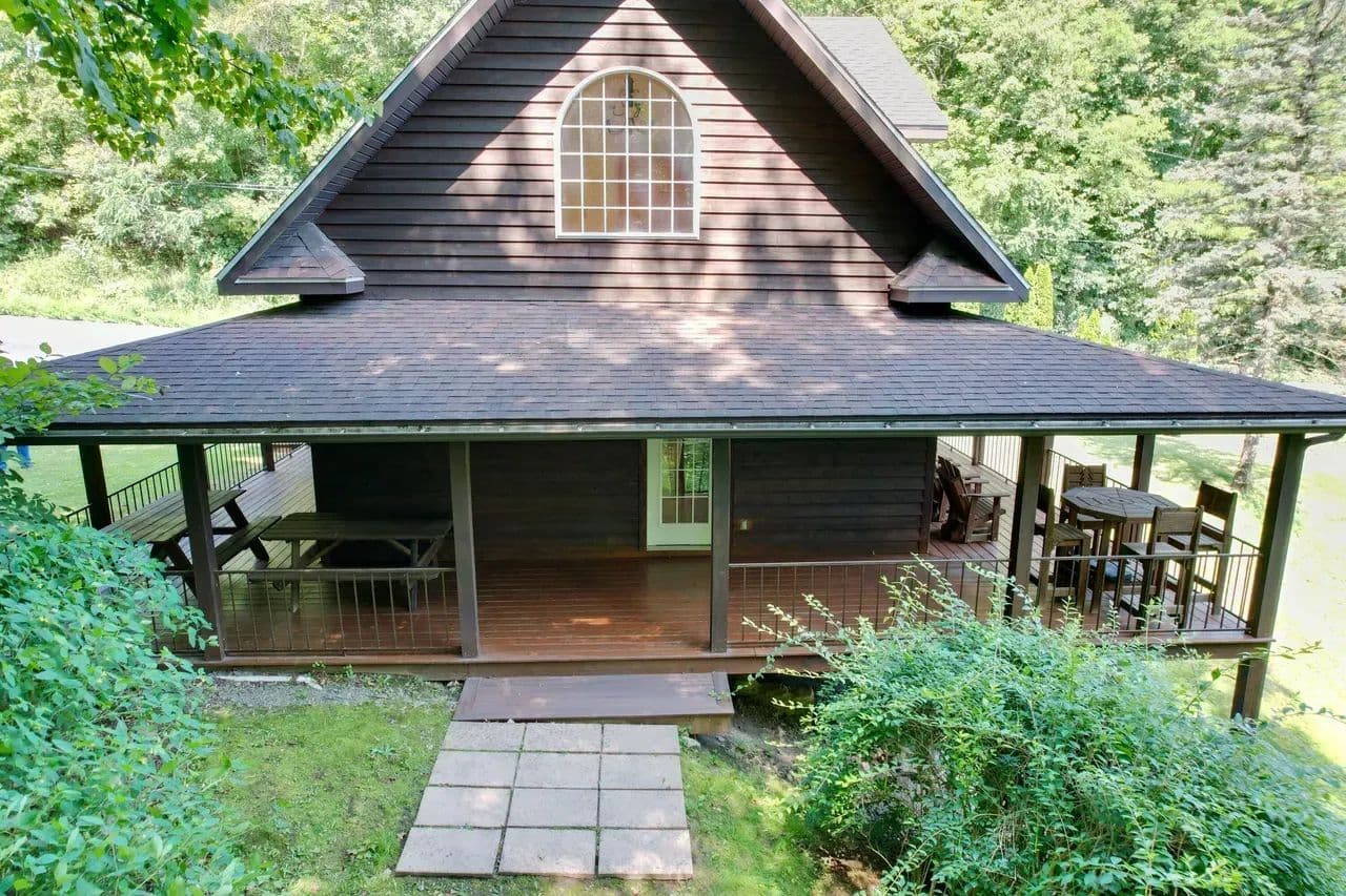 This beautifully updated 3-bedroom, 3-bath chalet, with its warm cedar siding, is nestled in a serene, wooded setting with direct river frontage. A spacious wraparound covered porch offers panoramic views and the perfect perch to relax after a day on the water. Inside, the home features hardwood flooring throughout, modernized electrical and plumbing systems, updated windows, doors, insulation, and stylish lighting fixtures—all blending rustic charm with contemporary comfort.