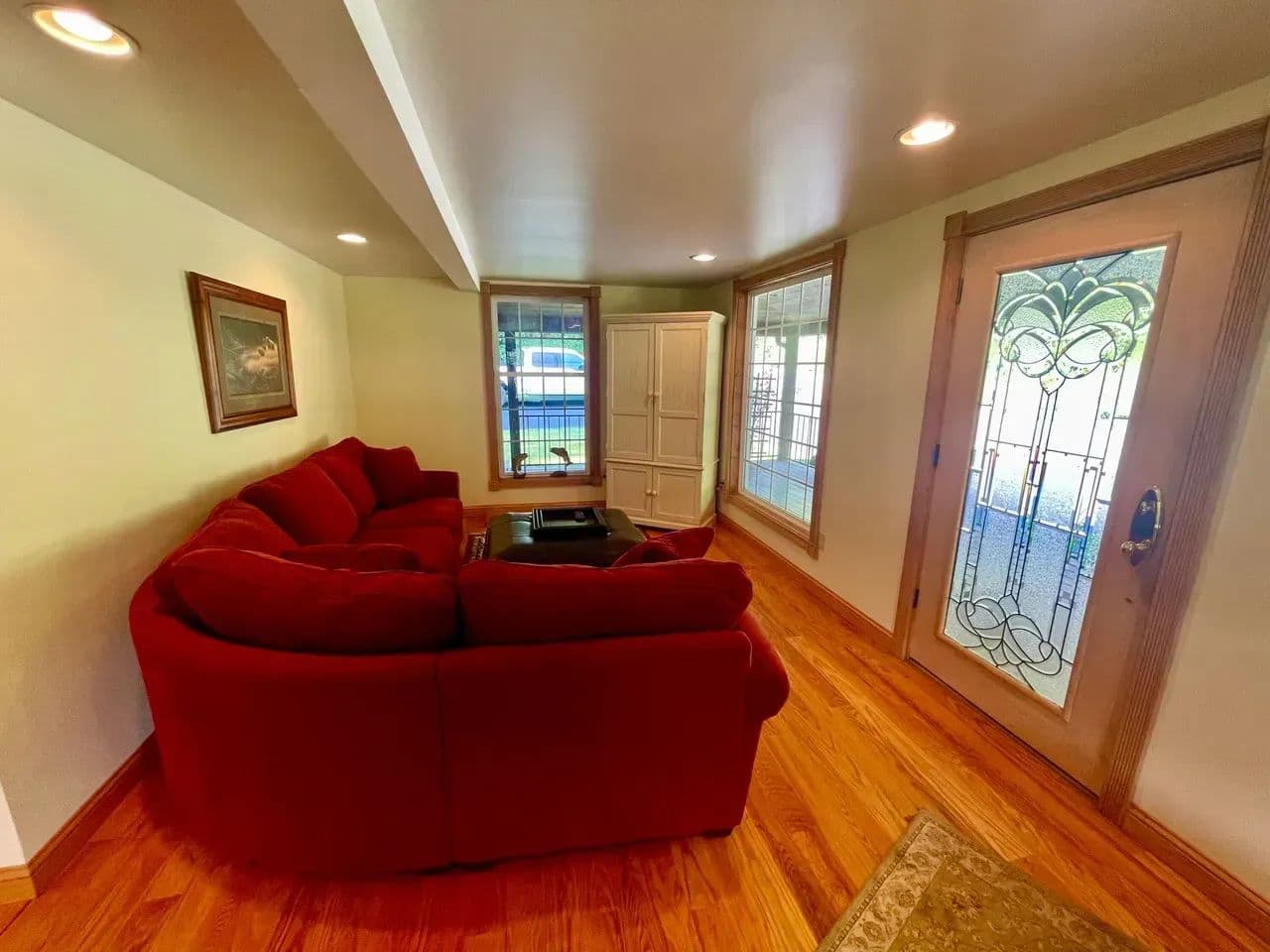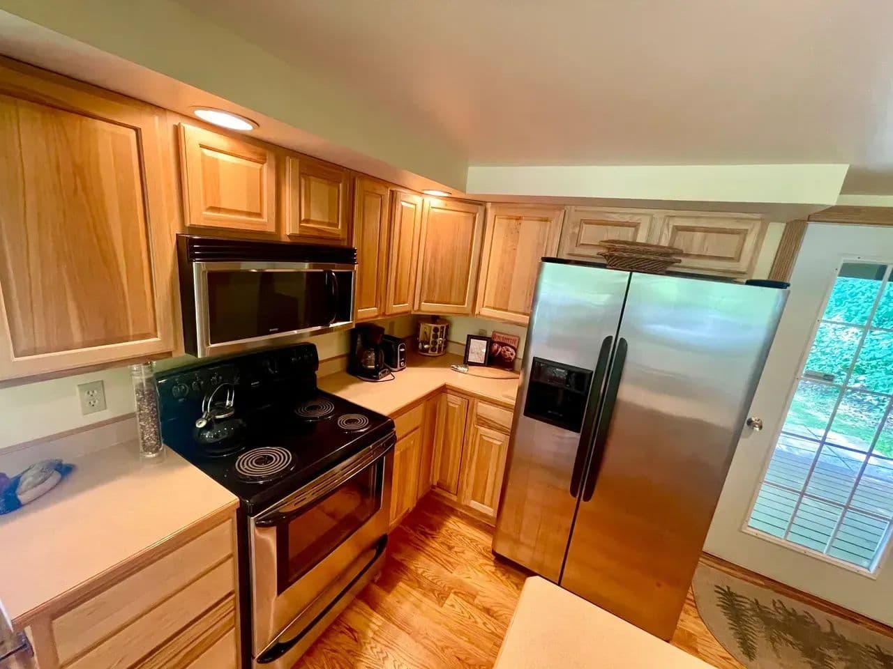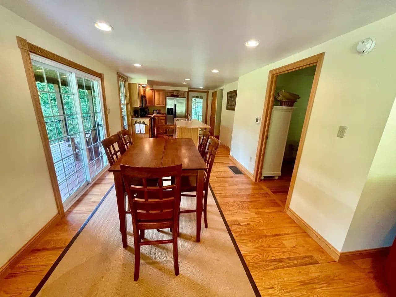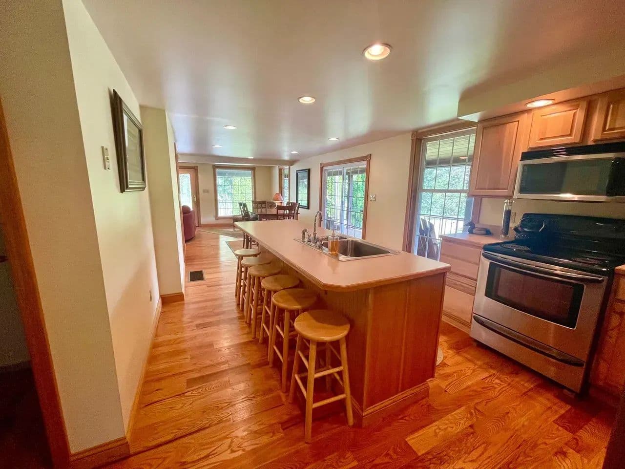 This beautifully updated 3-bedroom, 3-bath chalet, with its warm cedar siding, is nestled in a serene, wooded setting with direct river frontage. A spacious wraparound covered porch offers panoramic views and the perfect perch to relax after a day on the water. Inside, the home features hardwood flooring throughout, modernized electrical and plumbing systems, updated windows, doors, insulation, and stylish lighting fixtures—all blending rustic charm with contemporary comfort.